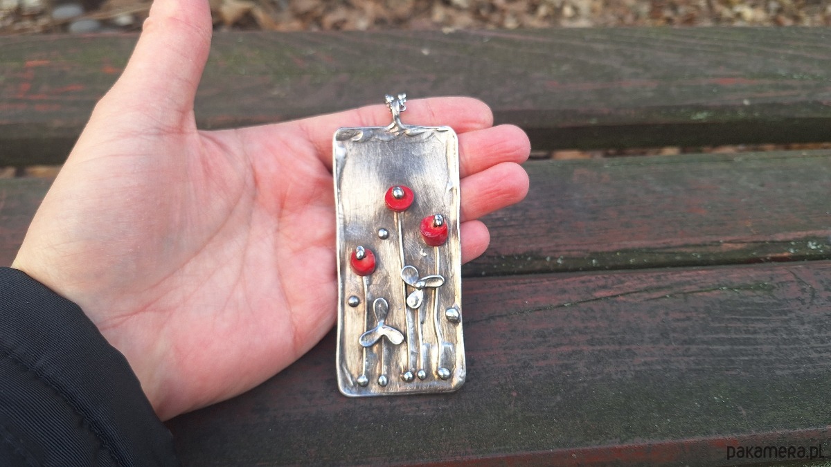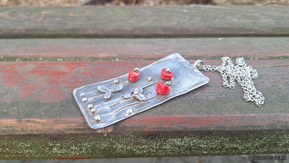 Wisiorek wykonany z miedzi, cyny i koralowców. Wymiary ok. 9 na 4 cm. Zawieszony na łańcuszku o długości ok. 50 cm.