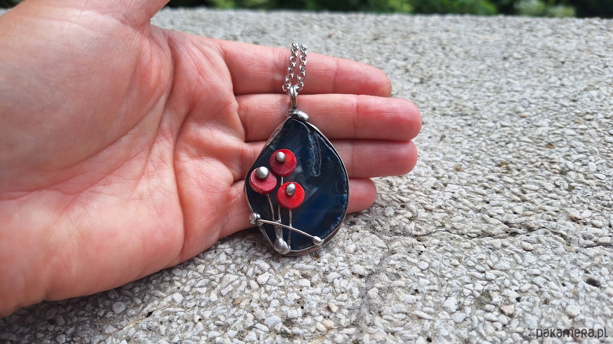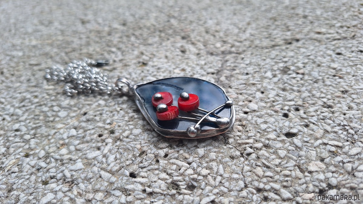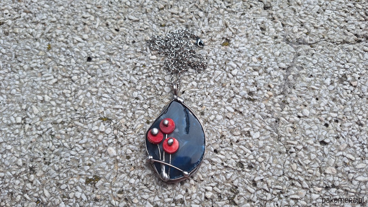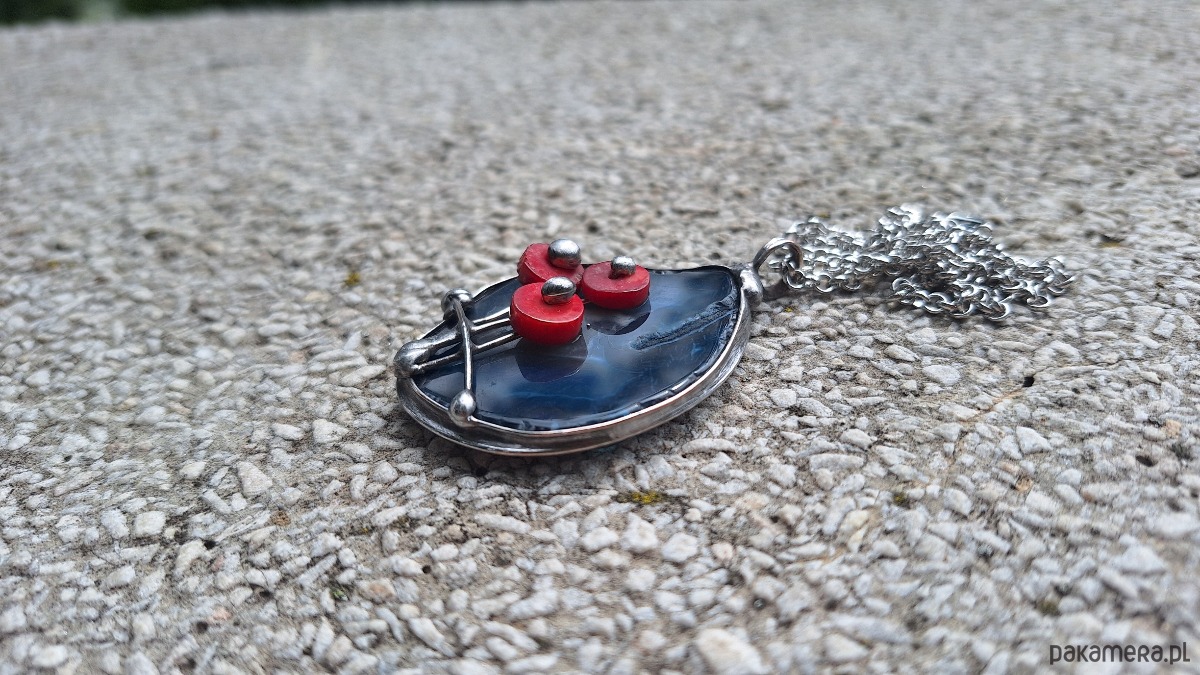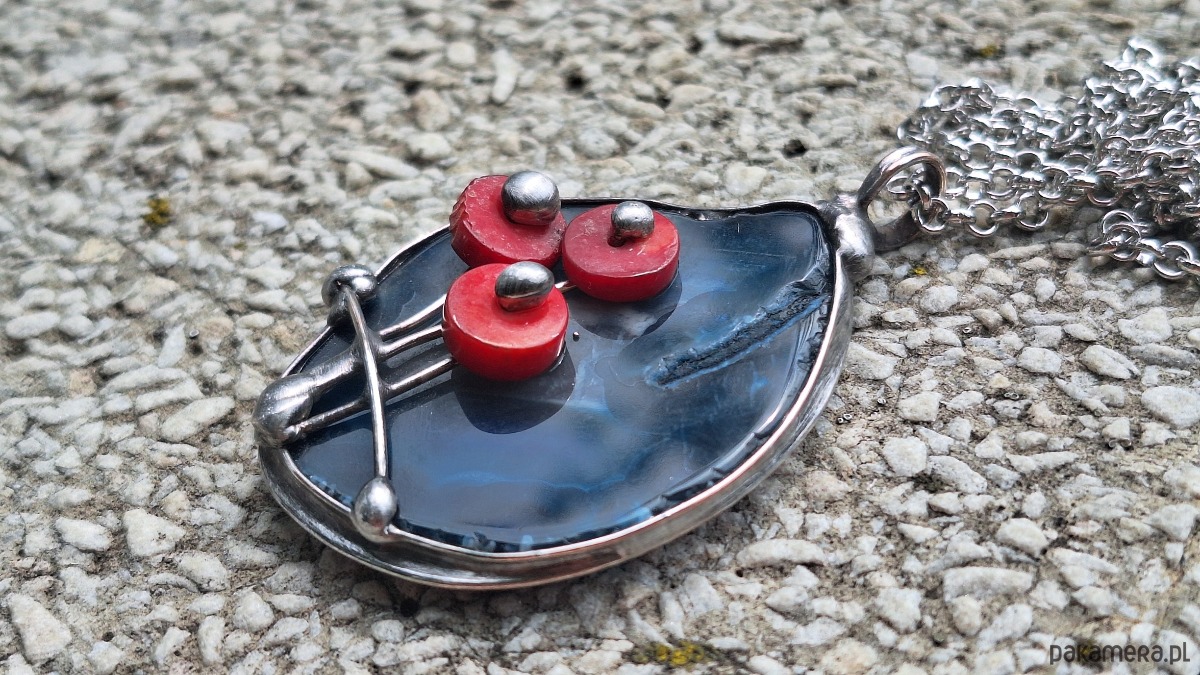Wisiorek wykonany z miedzi, cyny, koralowców i granatowego agatu. Wymiary ok. 5 na 3.5 cm. Zawieszony na łańcuszku o długości ok. 50 cm.