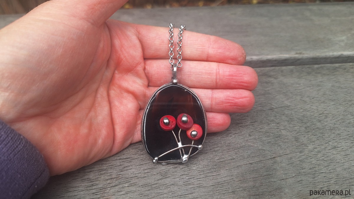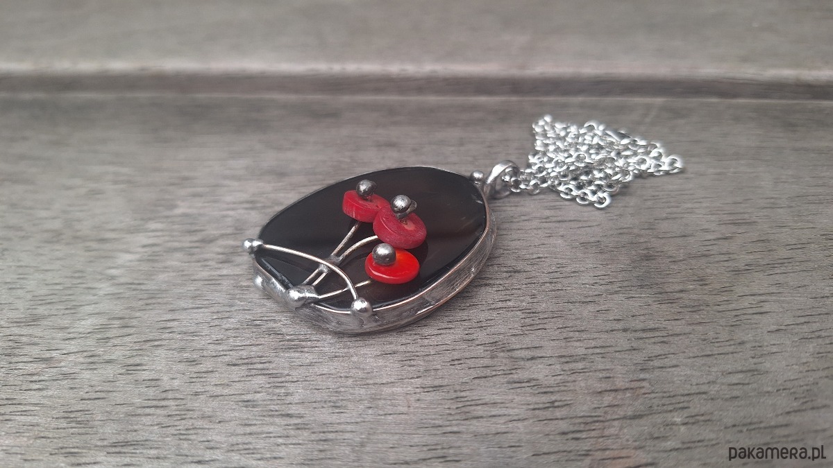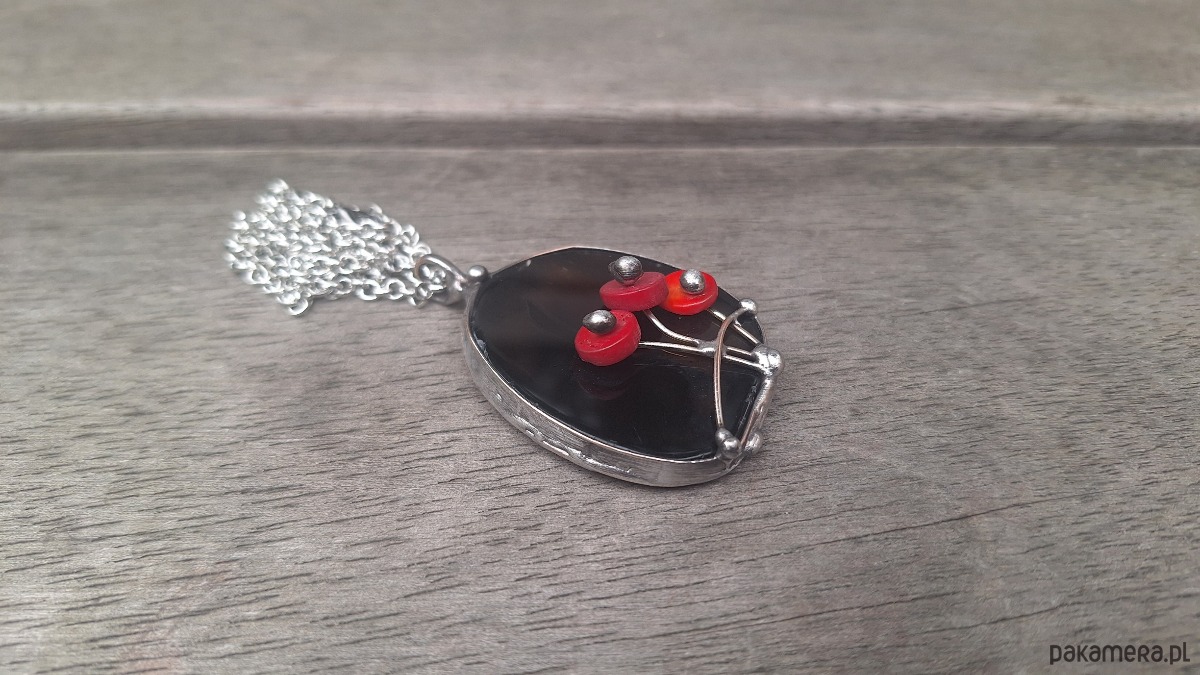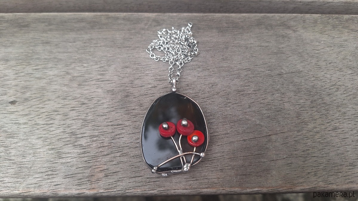 Wisiorek wykonany z miedzi, cyny, koralowców i agatu. Wymiary ok. 4.5 na 3.5 cm. Zawieszony na łańcuszku o długości ok. 50 cm.