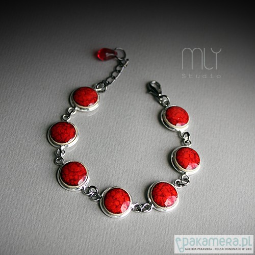Efektowna bransoletka wykonana z ceramicznych elementów, szkliwionych czerwonym szkliwem, elementów metalowych ze stali chirurgicznej w kolorze srebrnym Obwód regulowany, średnica elementu ceramicznego około 12mm . Polecam