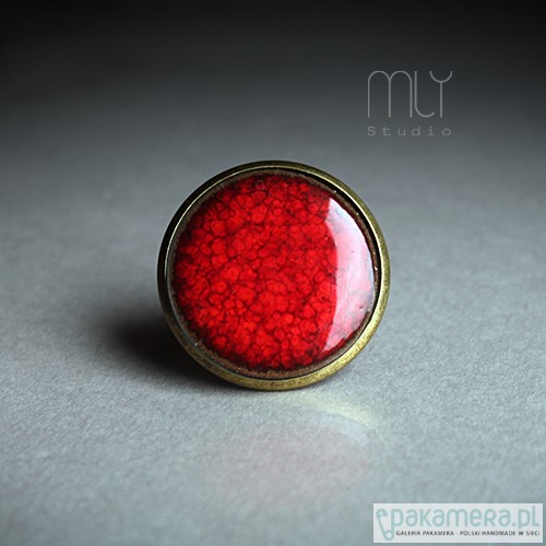 Efektowny pierścień z ceramicznym oczkiem, ręcznie wykonanym z gliny kamionkowej, poszkliwionym mieszanką czerwonych szkliw z efektem plamek. Obrączka regulowana w kolorze starego złota, średnica oczka ok 27mm. Polecam