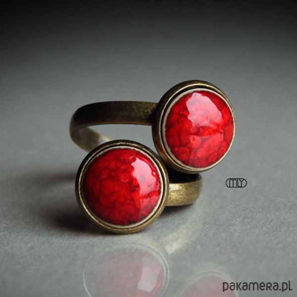 Efektowny pierścień z ceramicznym oczkiem, ręcznie wykonanym z gliny kamionkowej, poszkliwionym mieszanką czerwonych szkliw z efektem plamek. Obrączka regulowana w kolorze starego złota, średnica oczka ok 12mm. Polecam
