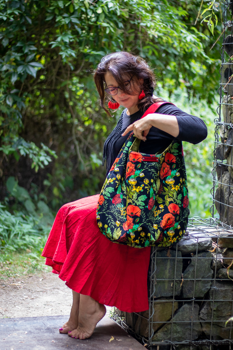 Torba worek uszyta jest z tkaniny welurowej w kwiatowy print.