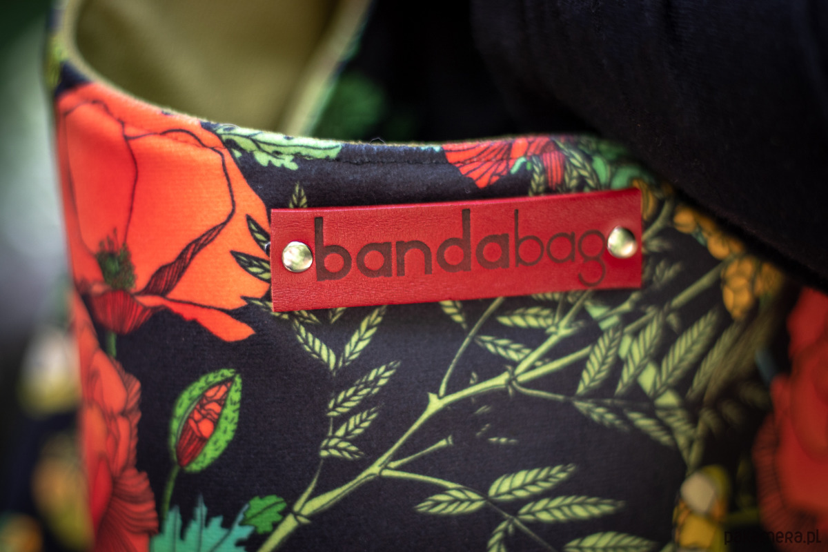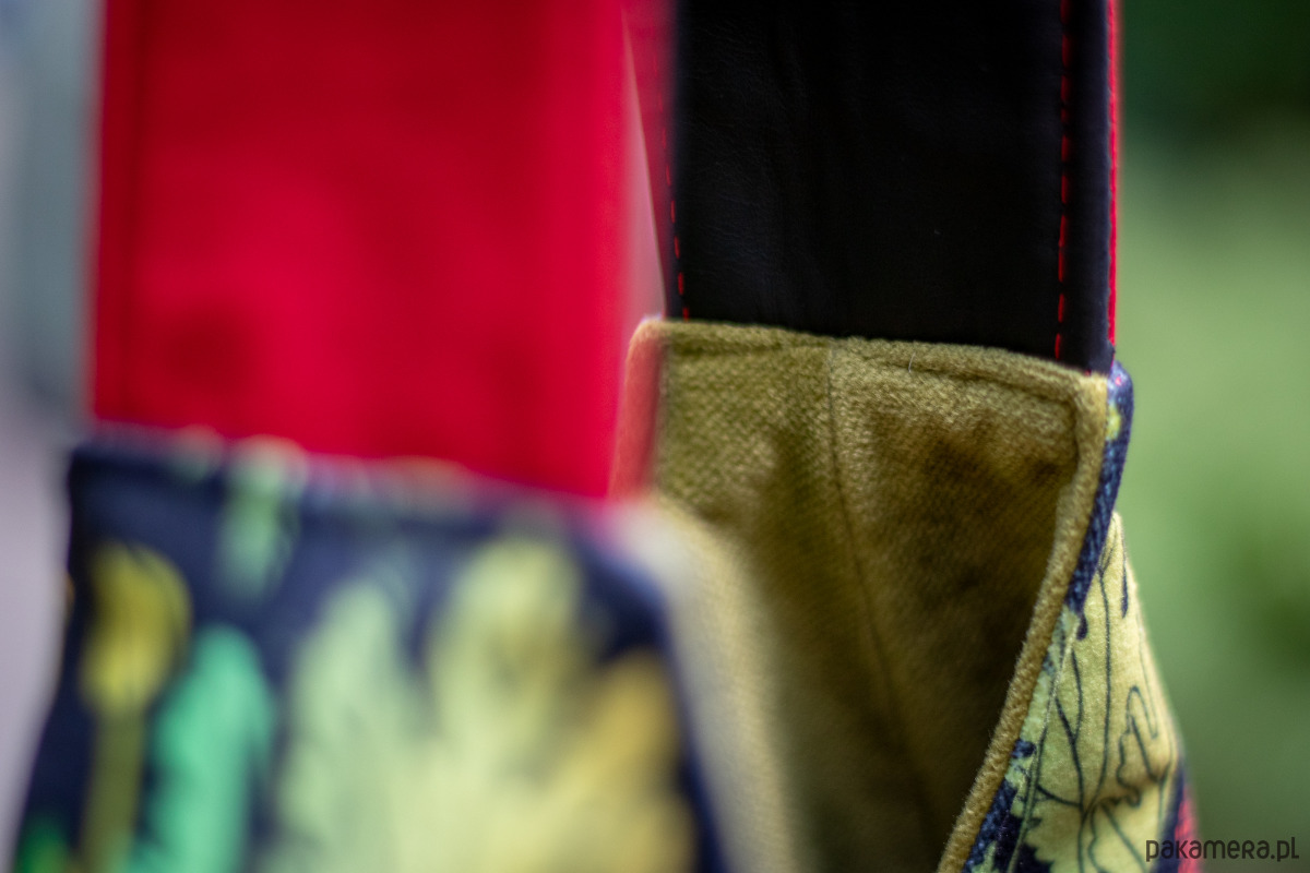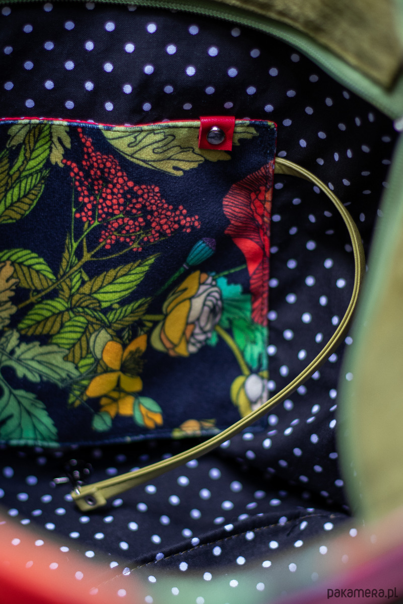 Wykończenie torby jest w kolorze zielonym. Uchwyt i logo ze skóry naturalnej w kolorze czerwonym.