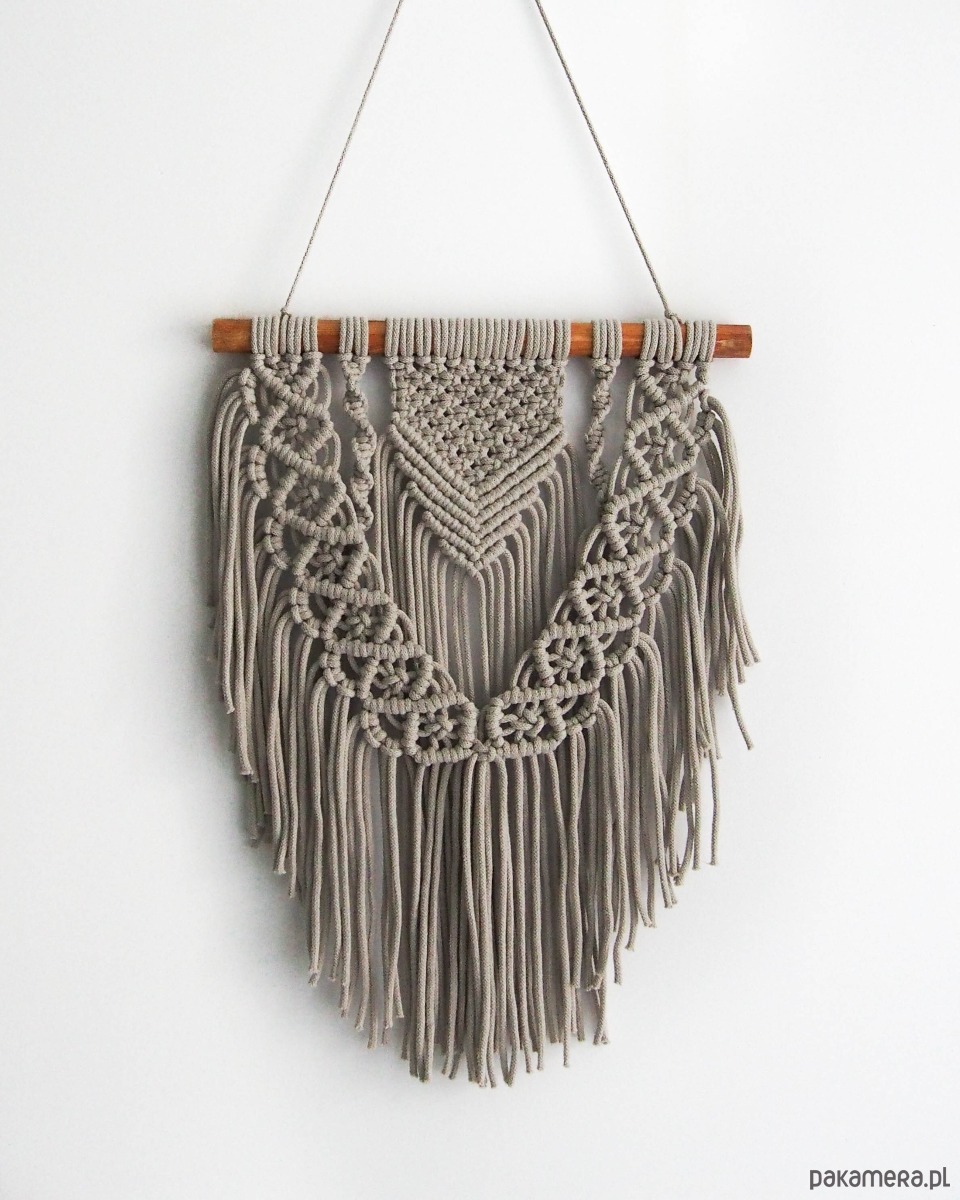 Nasza makrama jest tworzona na zamówienie z użyciem sznurka bawełnianego o grubości 5 mm, dostępnego w kolorze szarym. Delikatnie zawieszona na naturalnym kiju, staje się niezwykłą ozdobą do salonu, sypialni, przedpokoju lub pokoju dziecięcego. Ożywiając Twoje wnętrze, wprowadza niepowtarzalny klimat.