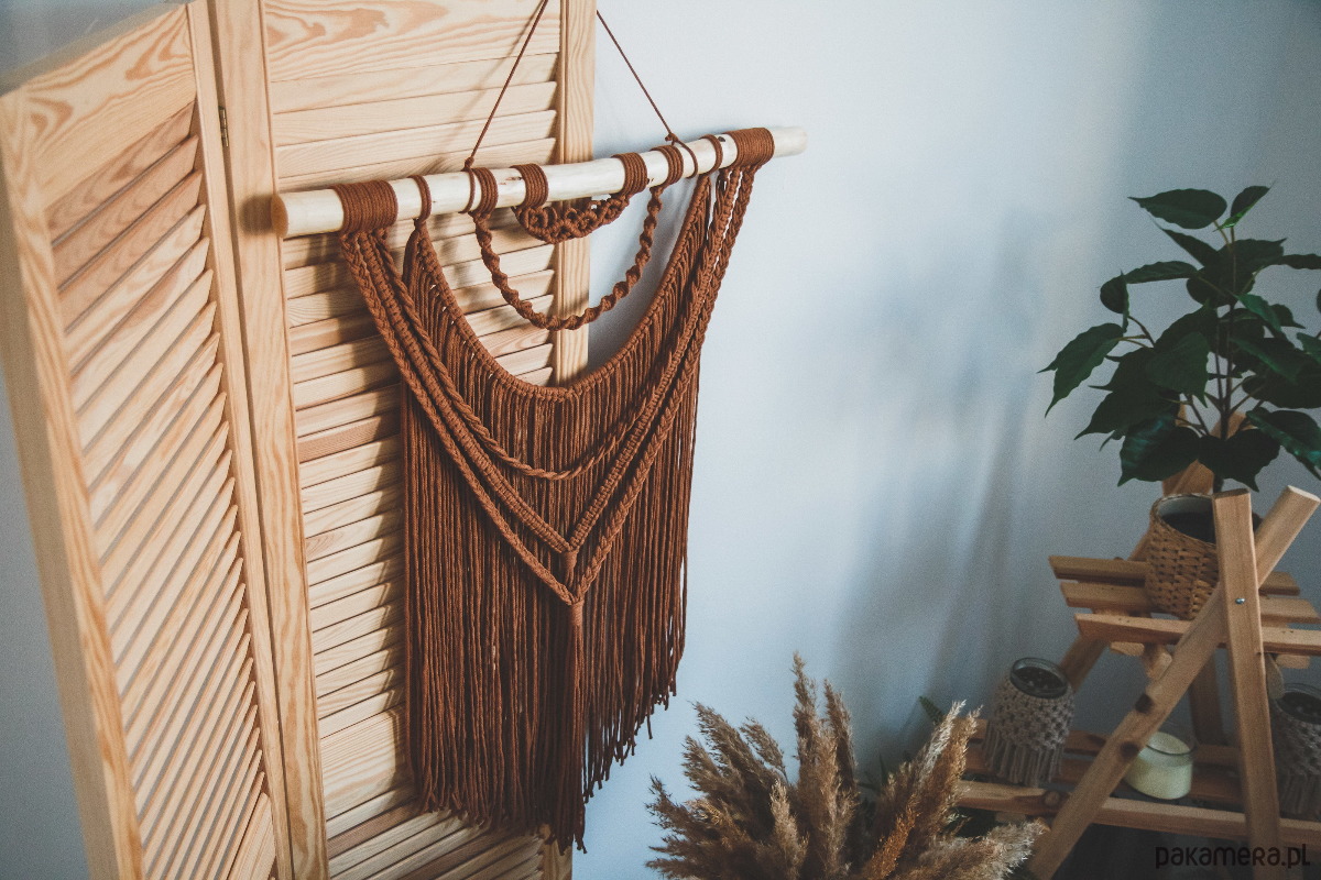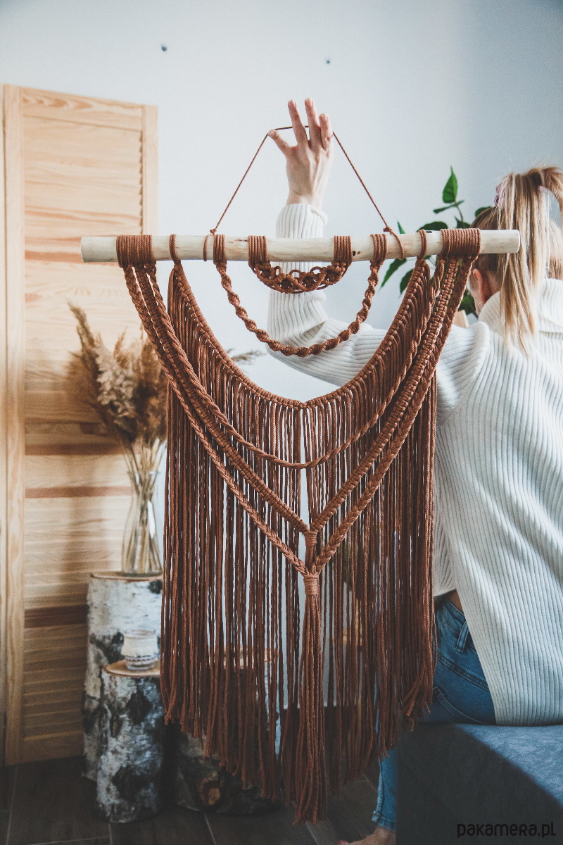 Makrama wykonana ze sznurka plecionego 3 mm w kolorze karmelowym na brzozowej gałęzi.