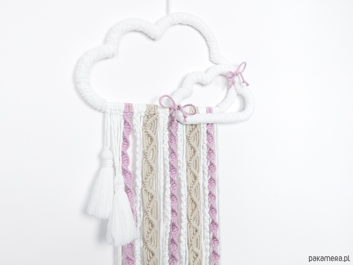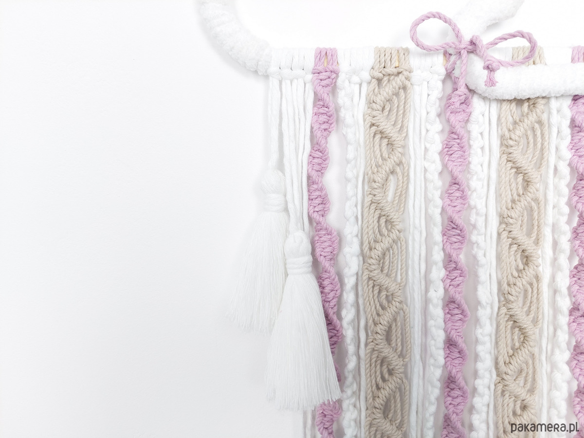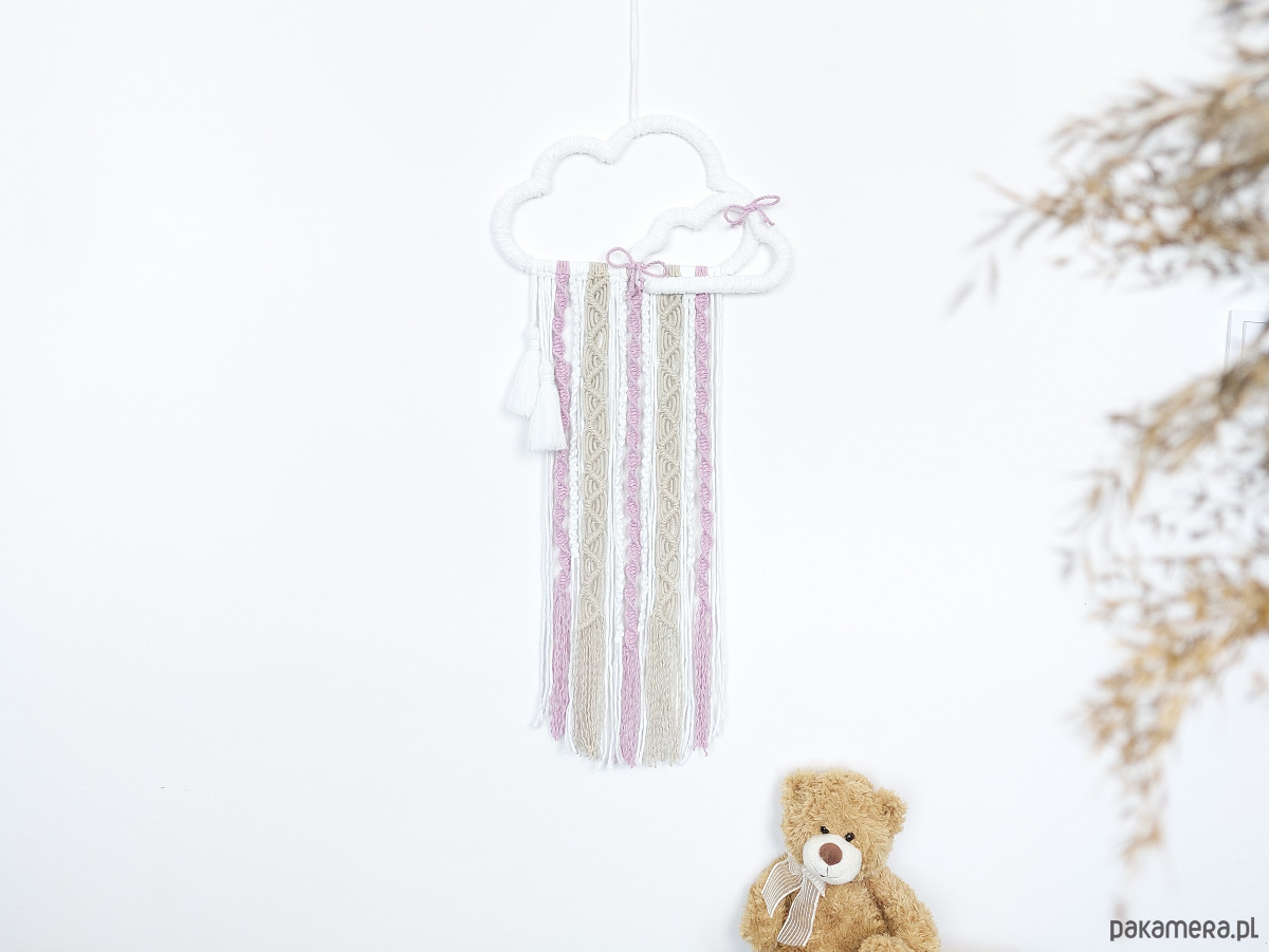 Makrama dla dzieci. Łapacz Snów, puszyste chmurki, dwa chwosty, mieszanka splotów: beż, skandynawski róż, biel.