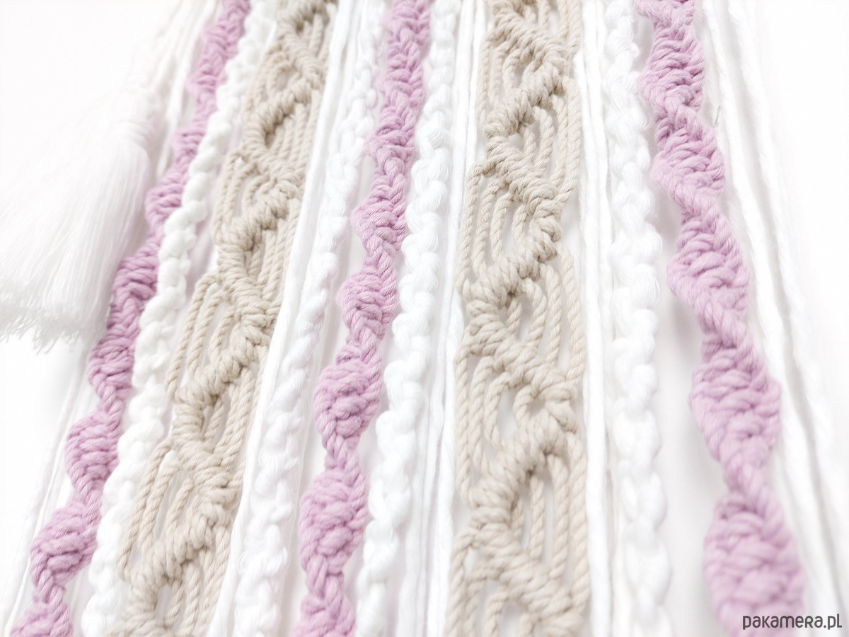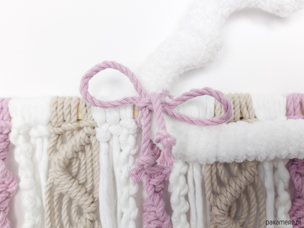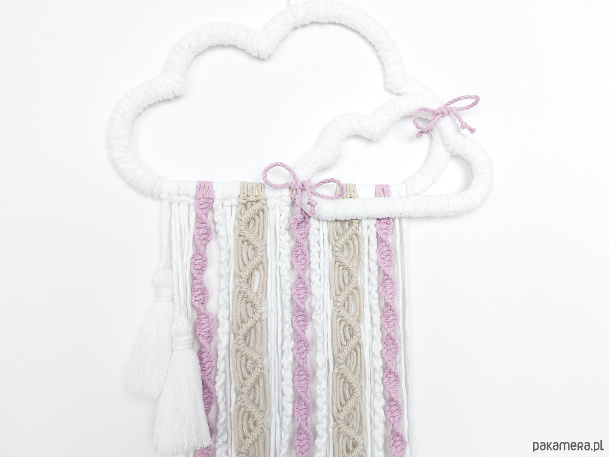 Makrama dla dzieci. Łapacz Snów, puszyste chmurki, dwa chwosty, mieszanka splotów: beż, skandynawski róż, biel.