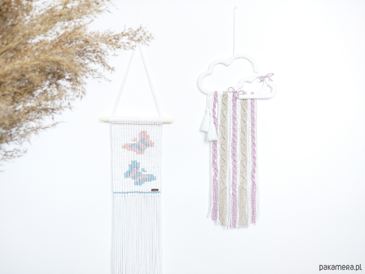 Makrama ze sznurka bawełnianego to produkty polskich: Bobbiny oraz PP, których produkty w całości powstają w kraju. Są ekologiczne i posiadają certyfikat OEKO TEX 100, który zaświadcza o hipoalergicznych właściwościach, dzięki czemu są bezpieczne dla dzieci. Materiał na chmurki to wełna dekoracyjna.