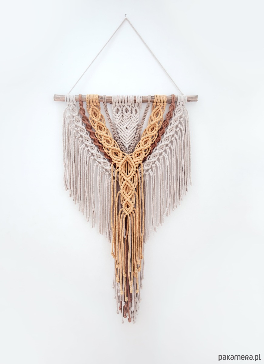 Makrama na kijku o szerokosci 52 cm.. Dlugosc makramy 85 cm plus sznurek do zawieszenia.. Makrama w odcieniach beżu i, brązu i musztardowy/ miodowy . Dostępna od ręki!!