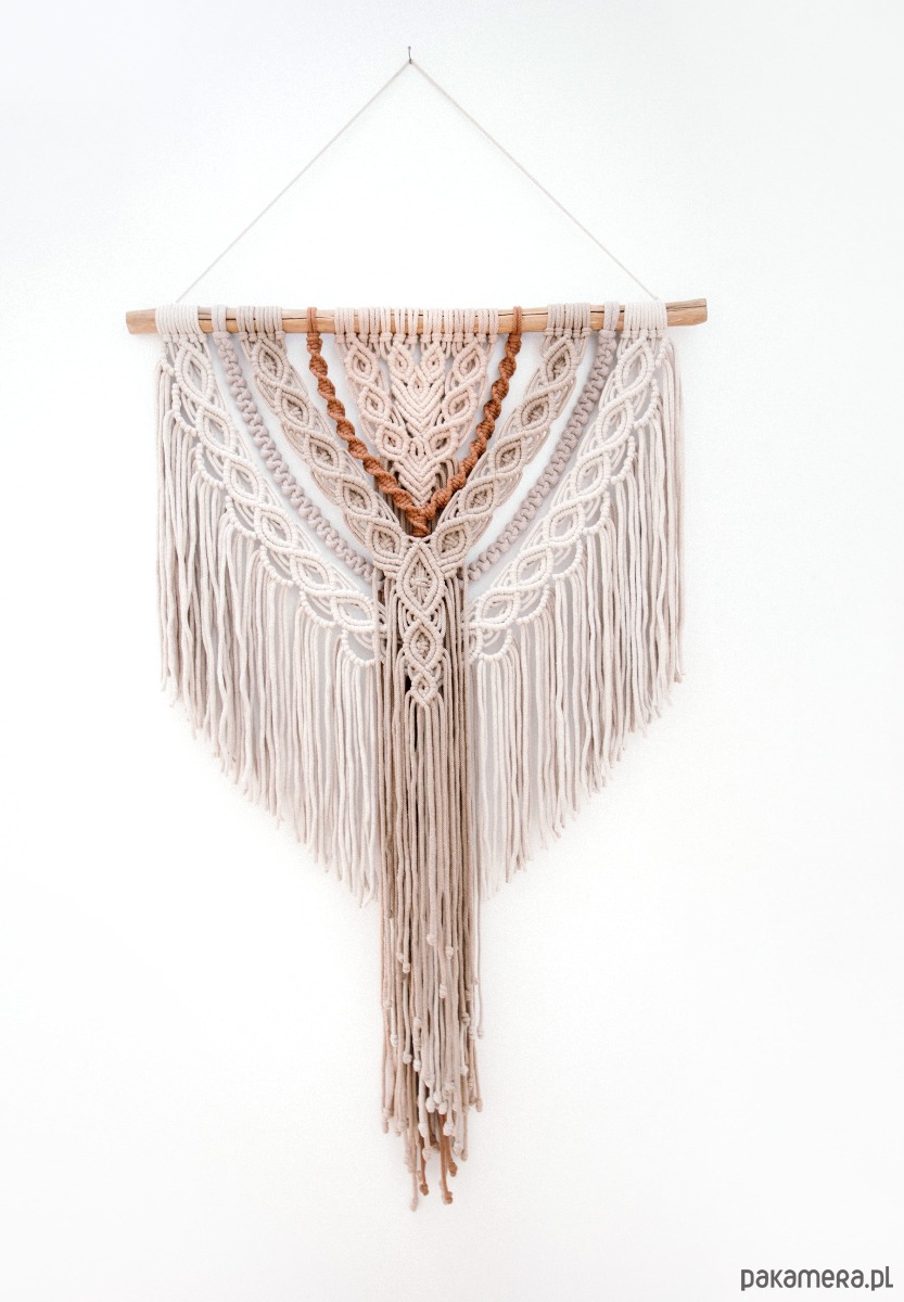 Makrama na kijku o szerokosci 70cm.. Dlugosc makramy 115 cm plus sznurek do zawieszenia.. Makrama w odcieniach beżu i brązu.. Dostępna od ręki!!