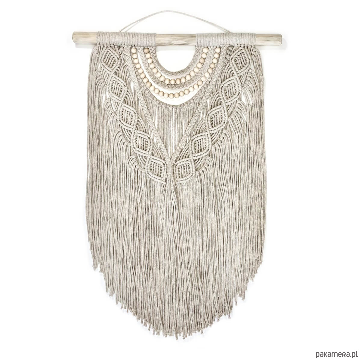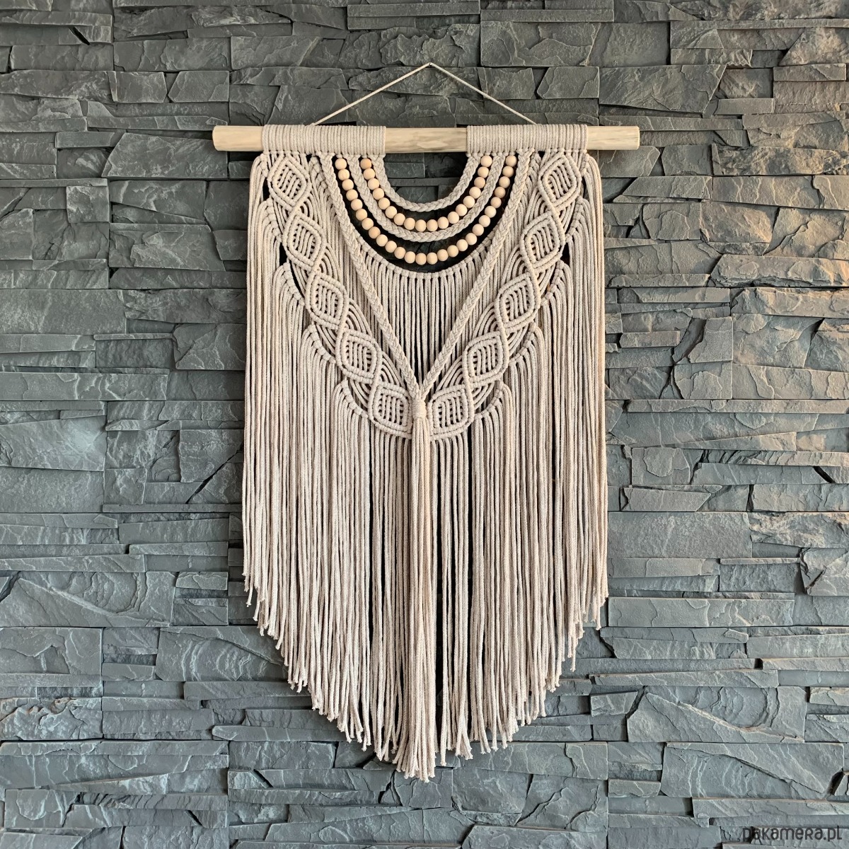 Makrama została wykonana ręcznie w Polsce z wykorzystaniem półproduktów pochodzących jedynie od polskich producentów. Użyto sznurka bawełnianego o grubości 3 mm. Drewniane surowe koraliki dodają kompozycji niesamowitego uroku.