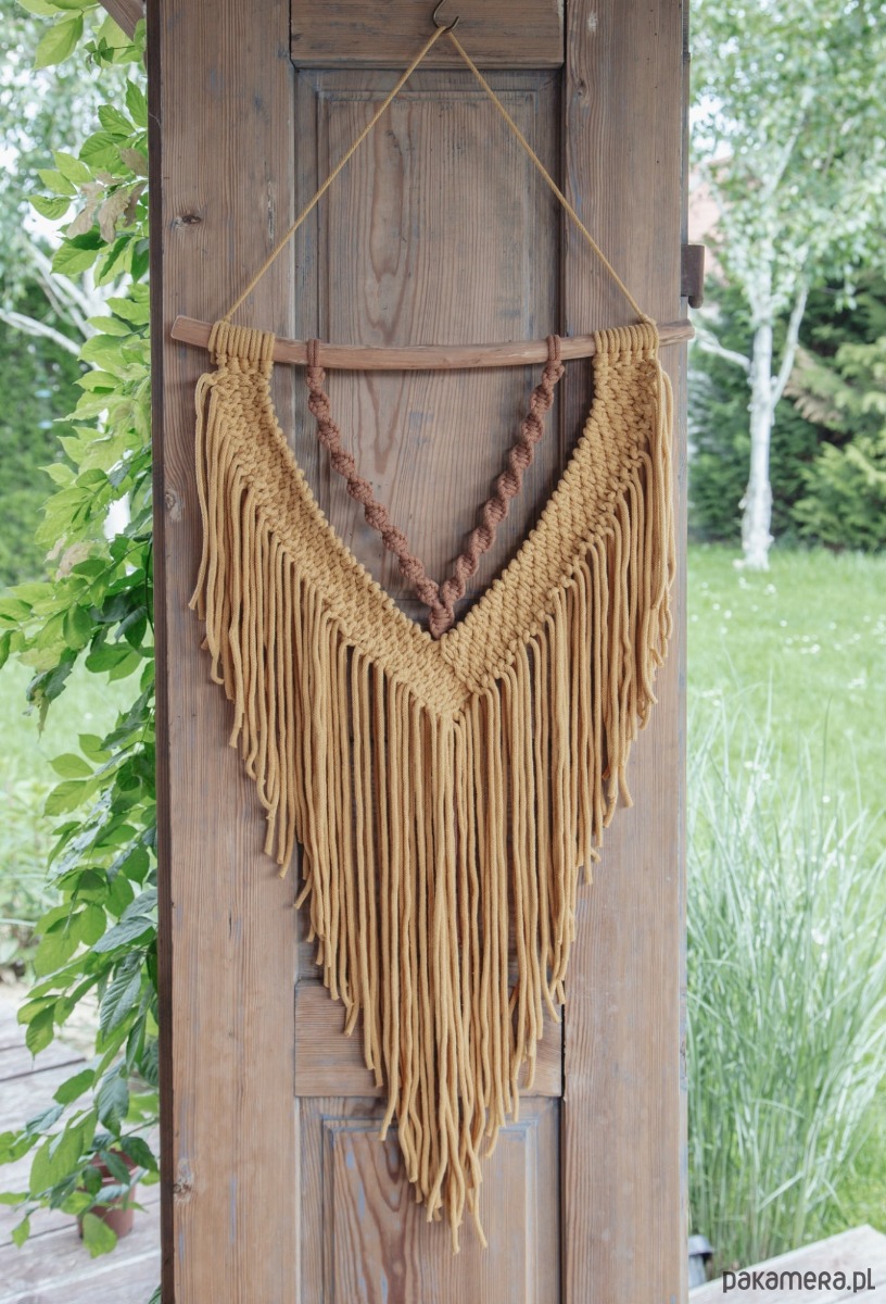 Makrama na kijku o szerokosci 50 cm.. Dlugosc 90 cm plus sznurek do zawieszenia.. Makrama w kolorze musztardowym i brązu.. Dostępna od ręki!!