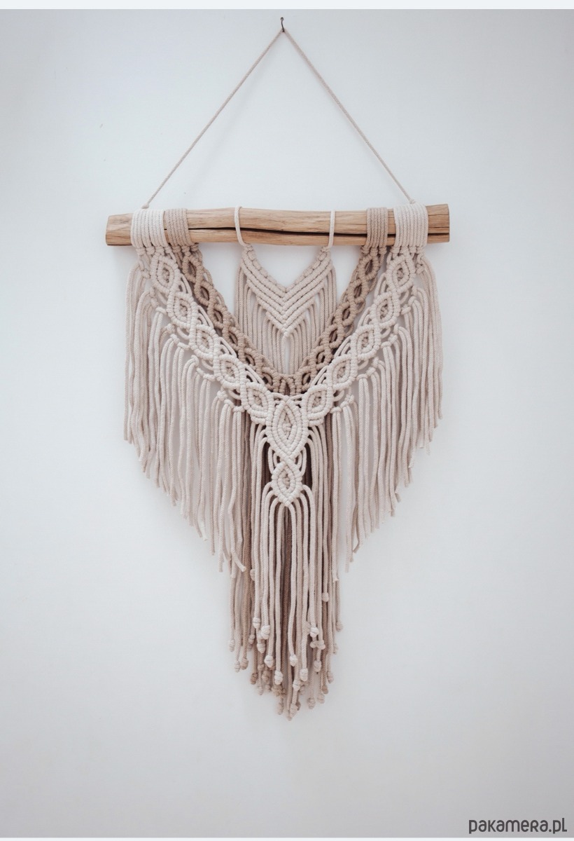 Makrama w kolorze beżowym .. Wymiary 44 cm kijek (plus zawieszenie) 65cm długa.. (2 zdj żeby pokazać jak na białej i drewnie wygląda)