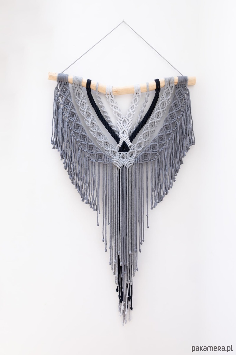 Makrama w kolorze szarym ( różne odcienie szarości)..i jeden wzór w kolorze granatowym.. Szerokość kijka 70cm.. Długa na około 120cm plus zawieszenie.. Dostępna od ręki