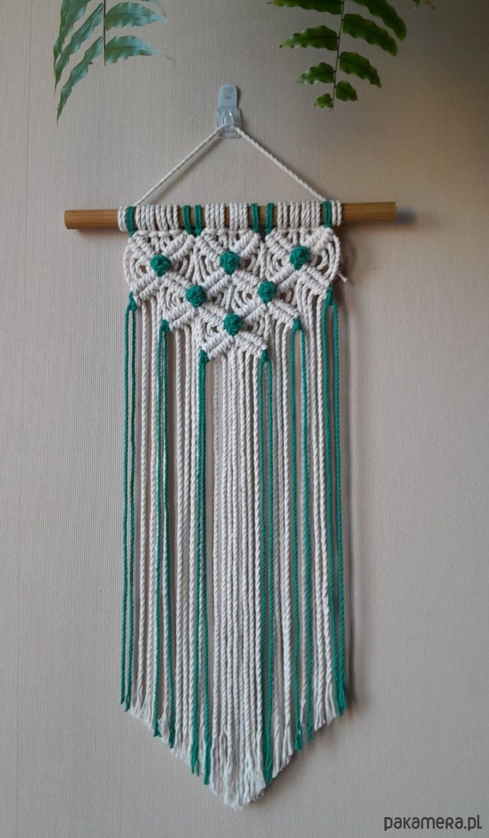 Technika wykonania - makrama, jest umieszczona na drewnianym kijku.