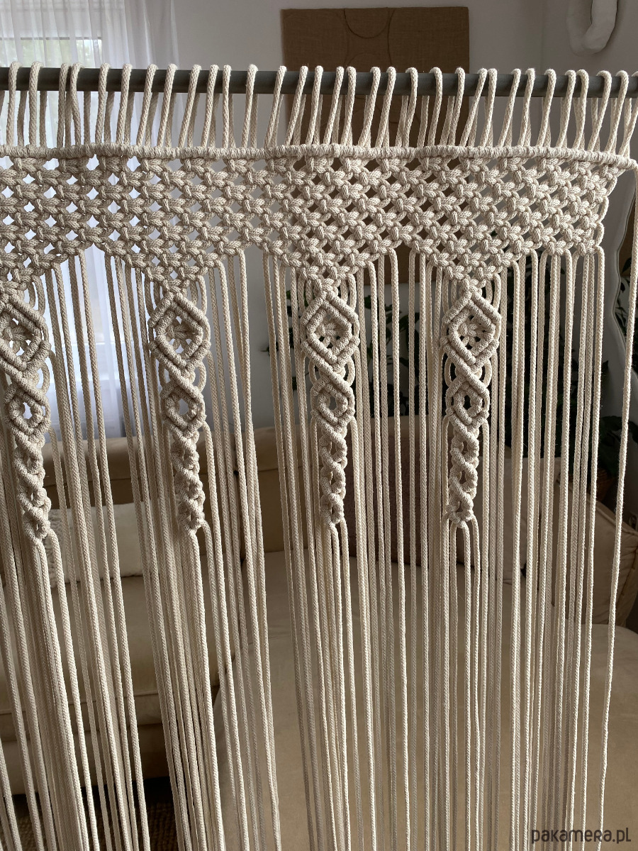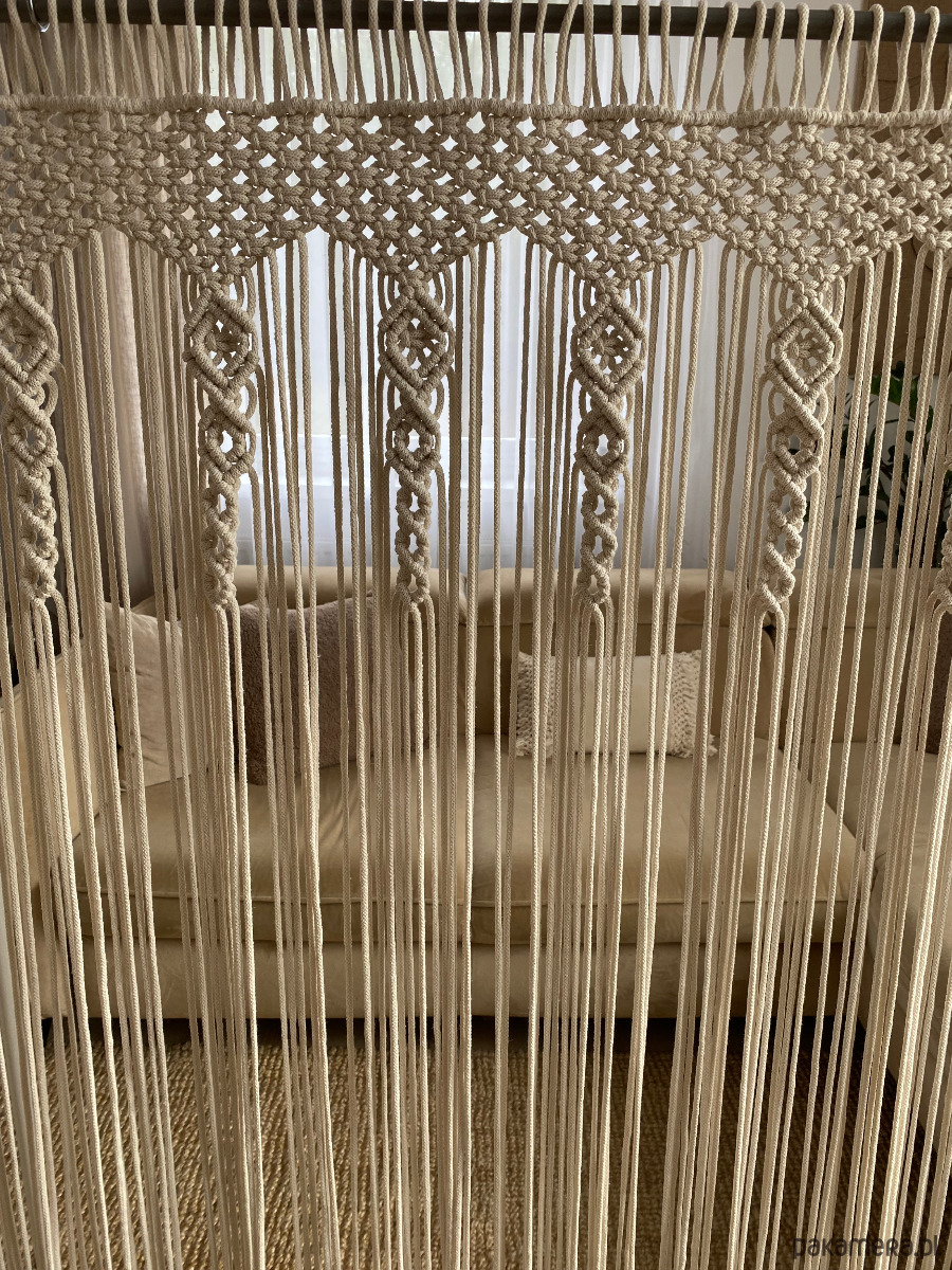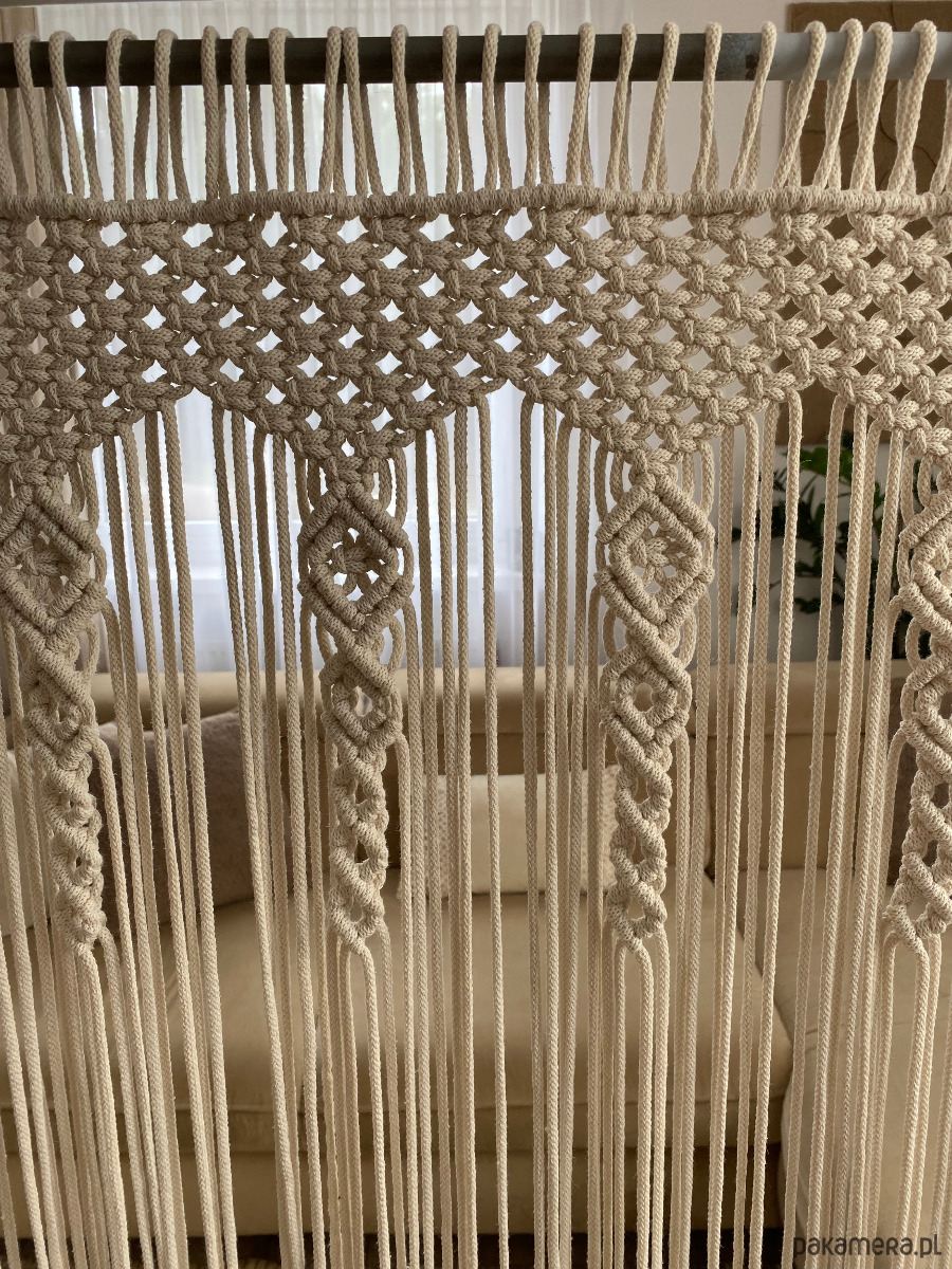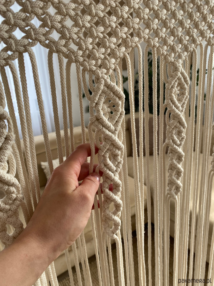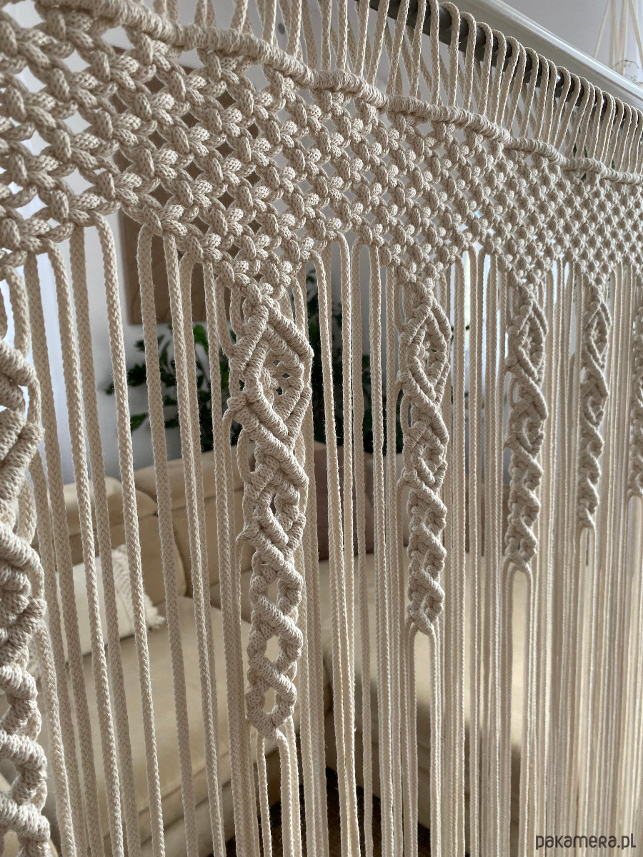Niepowtarzalna makrama firana na duże okno. Wykonana ze sznurka bawełnianego, plecionego o grubości 5 mm.