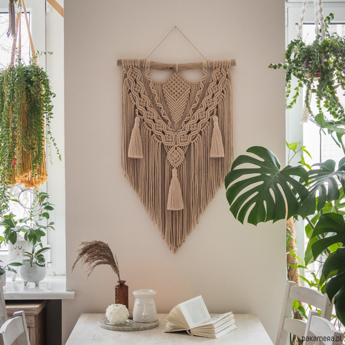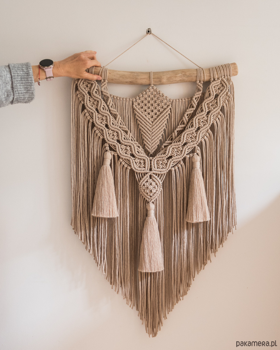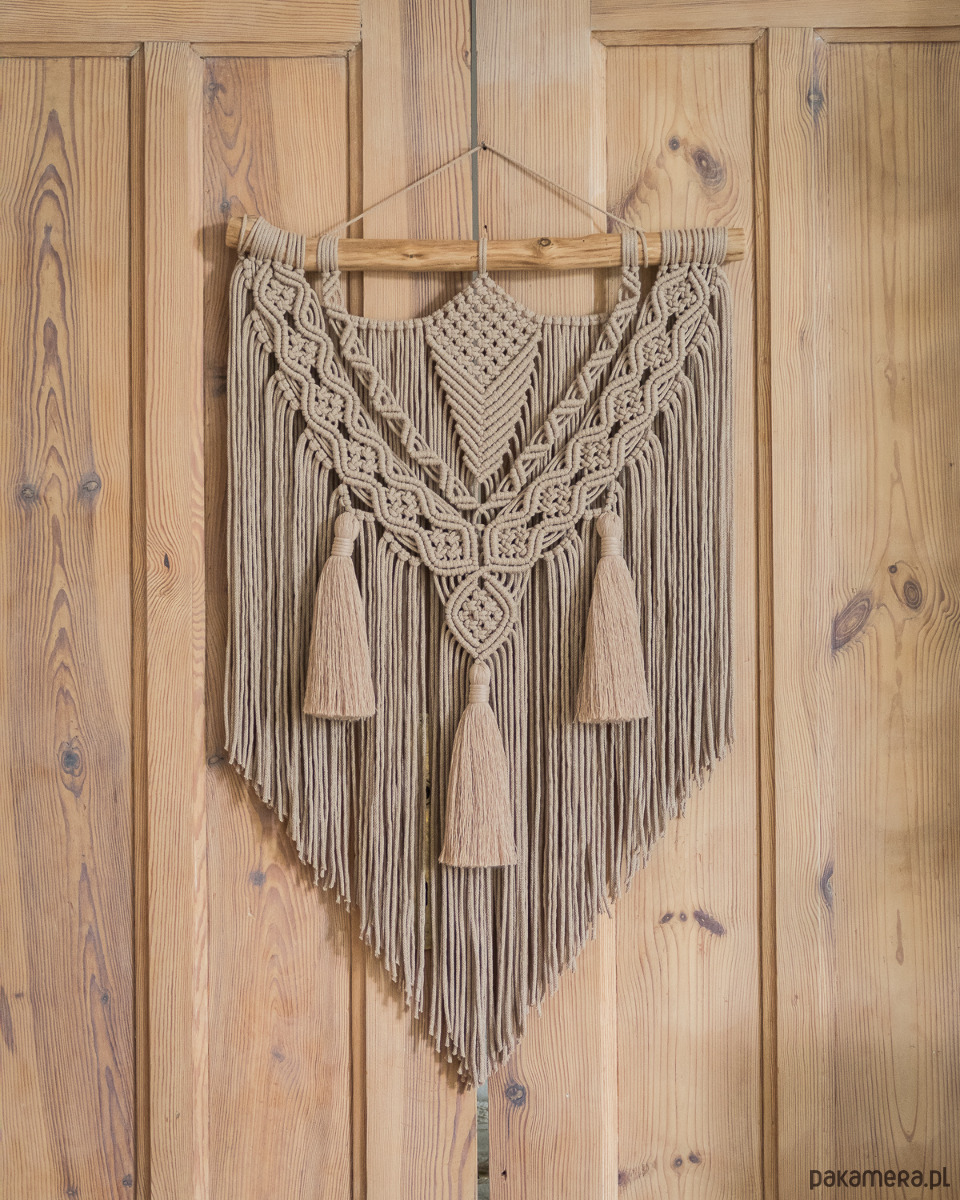 Ręcznie wykonana makrama w kolorze piaskowym zamocowana na naturalnym kijku bukowym. Ozdobiona chwostami.