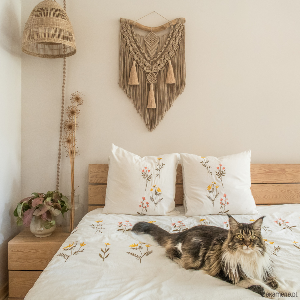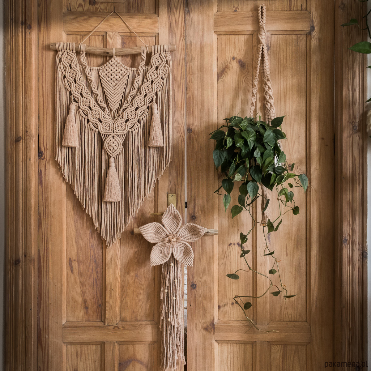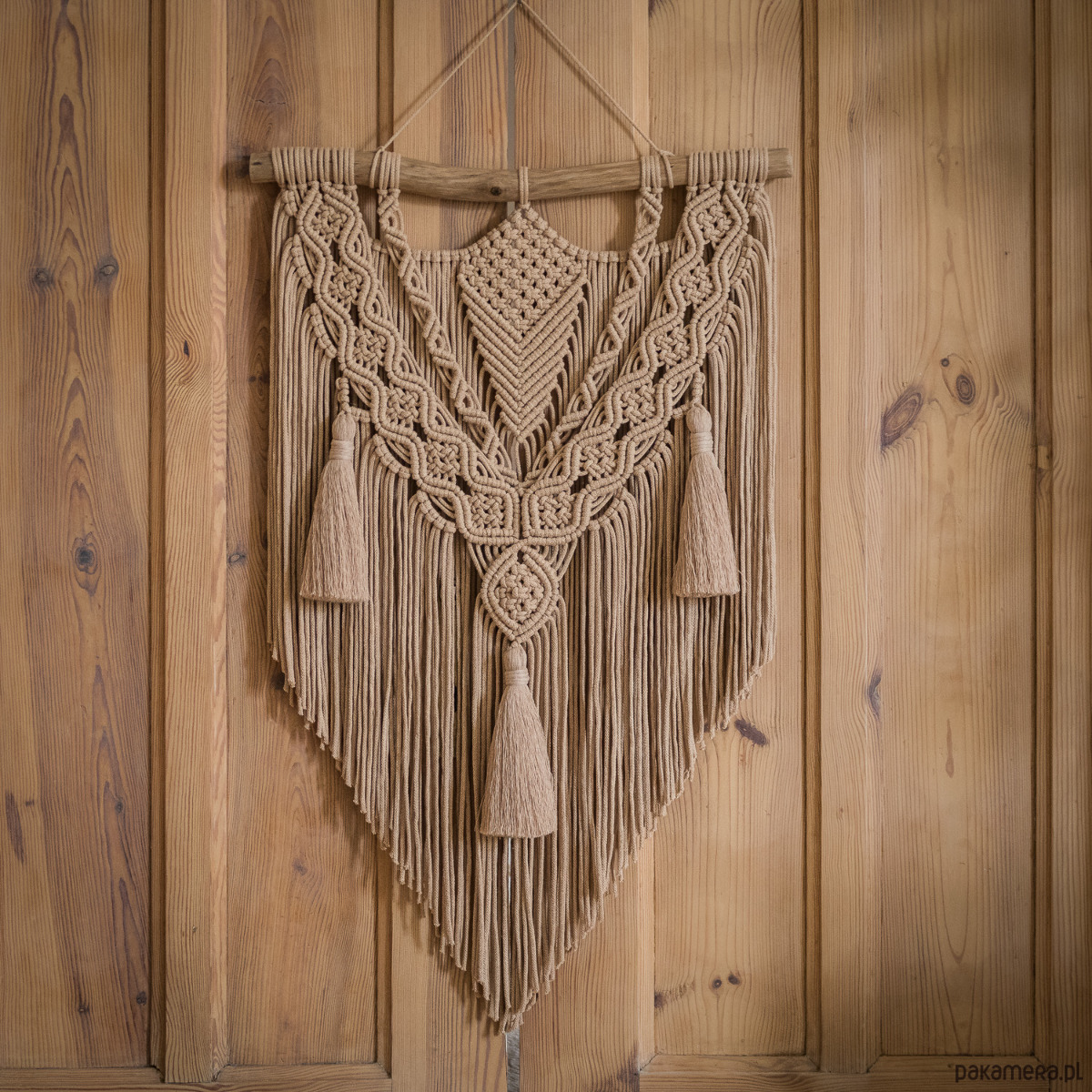 Ręcznie wykonana makrama w kolorze piaskowym zamocowana na naturalnym kijku bukowym. Ozdobiona chwostami.