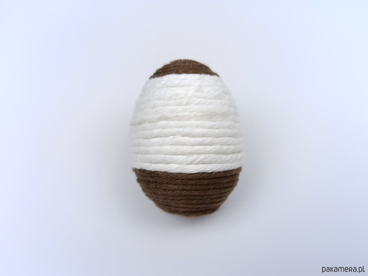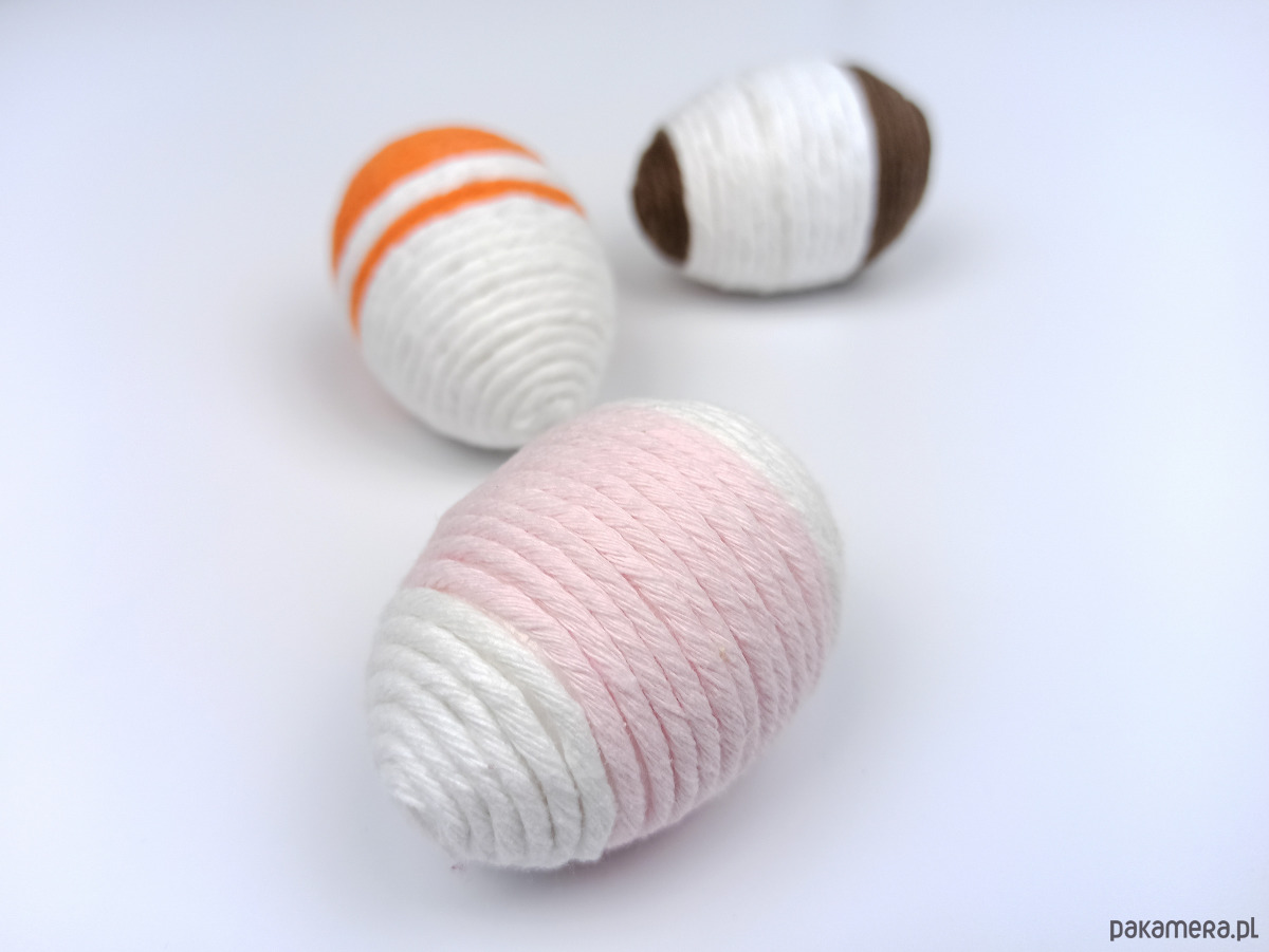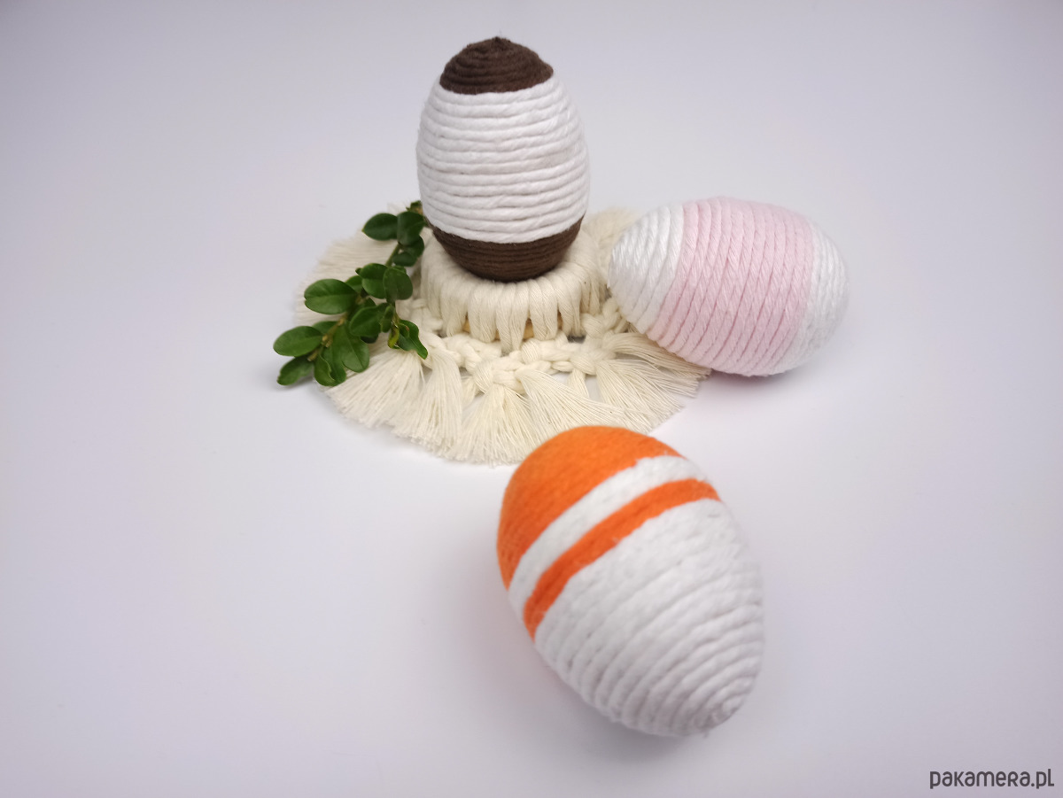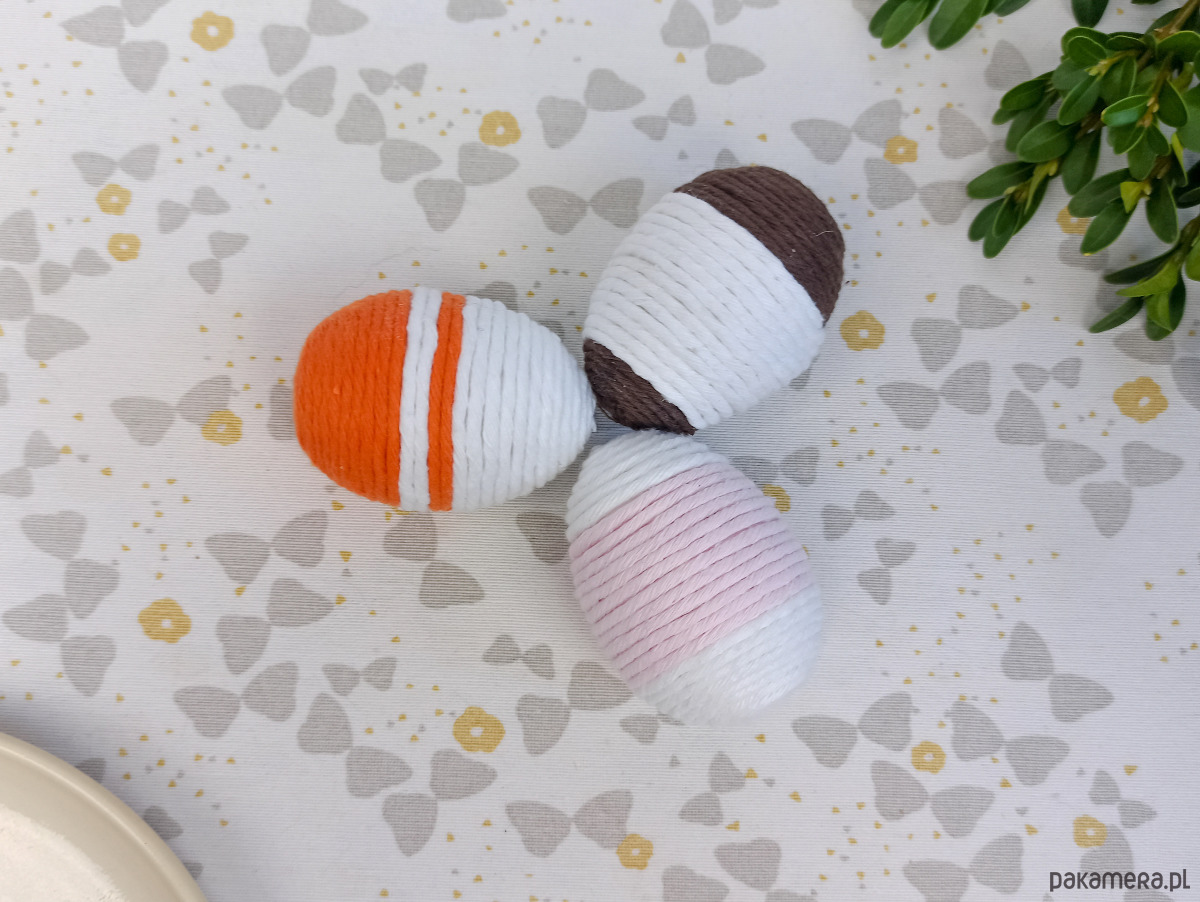 Sznurkowe jajka wielkanocne w dwóch kolorach biały plus brąz/pomarańcz/róż- jako alternatywa dla tradycyjnych malowanek. Wykonane na styropianowym wypełnieniu, oplecione 2mm bawełnianym sznurkiem.