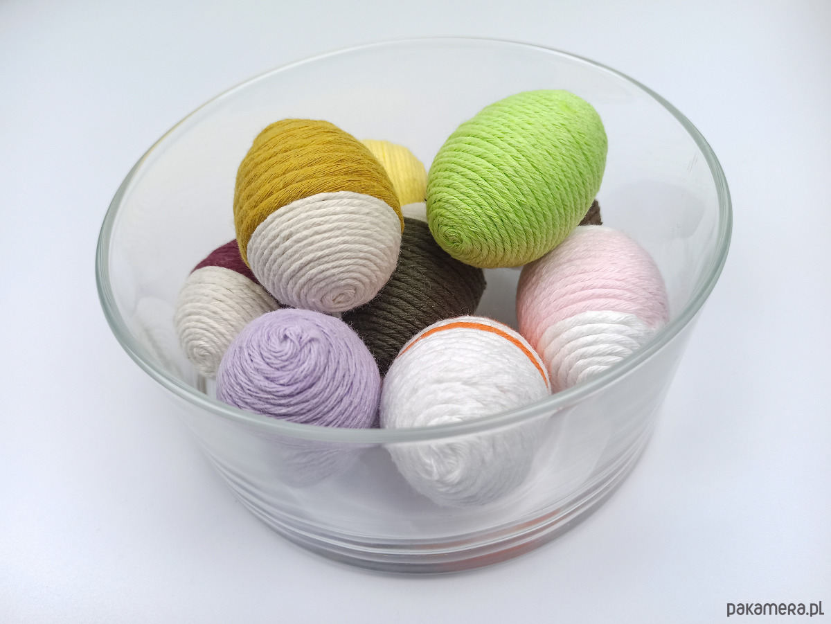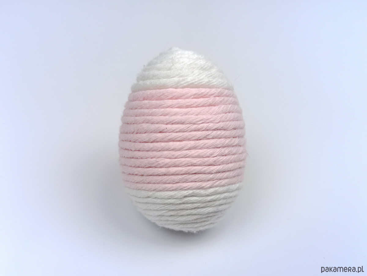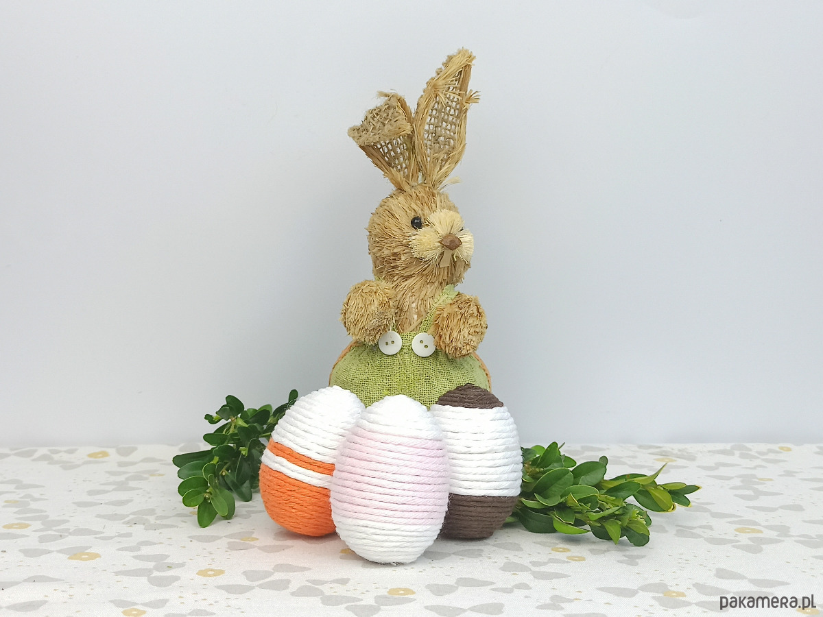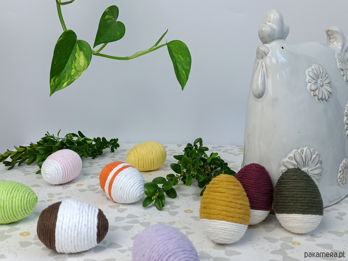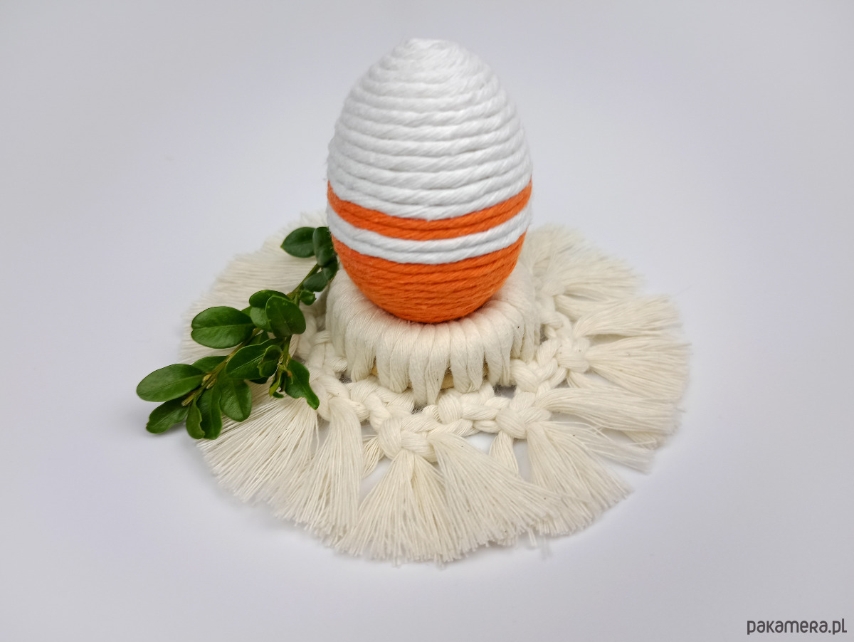 Sznurkowe jajka wielkanocne w dwóch kolorach biały plus brąz/pomarańcz/róż- jako alternatywa dla tradycyjnych malowanek. Wykonane na styropianowym wypełnieniu, oplecione 2mm bawełnianym sznurkiem.