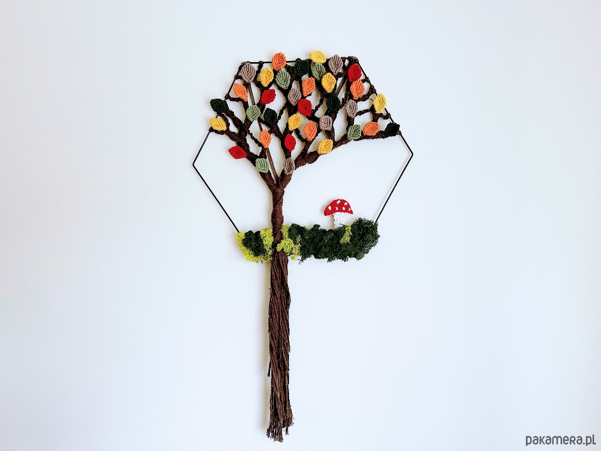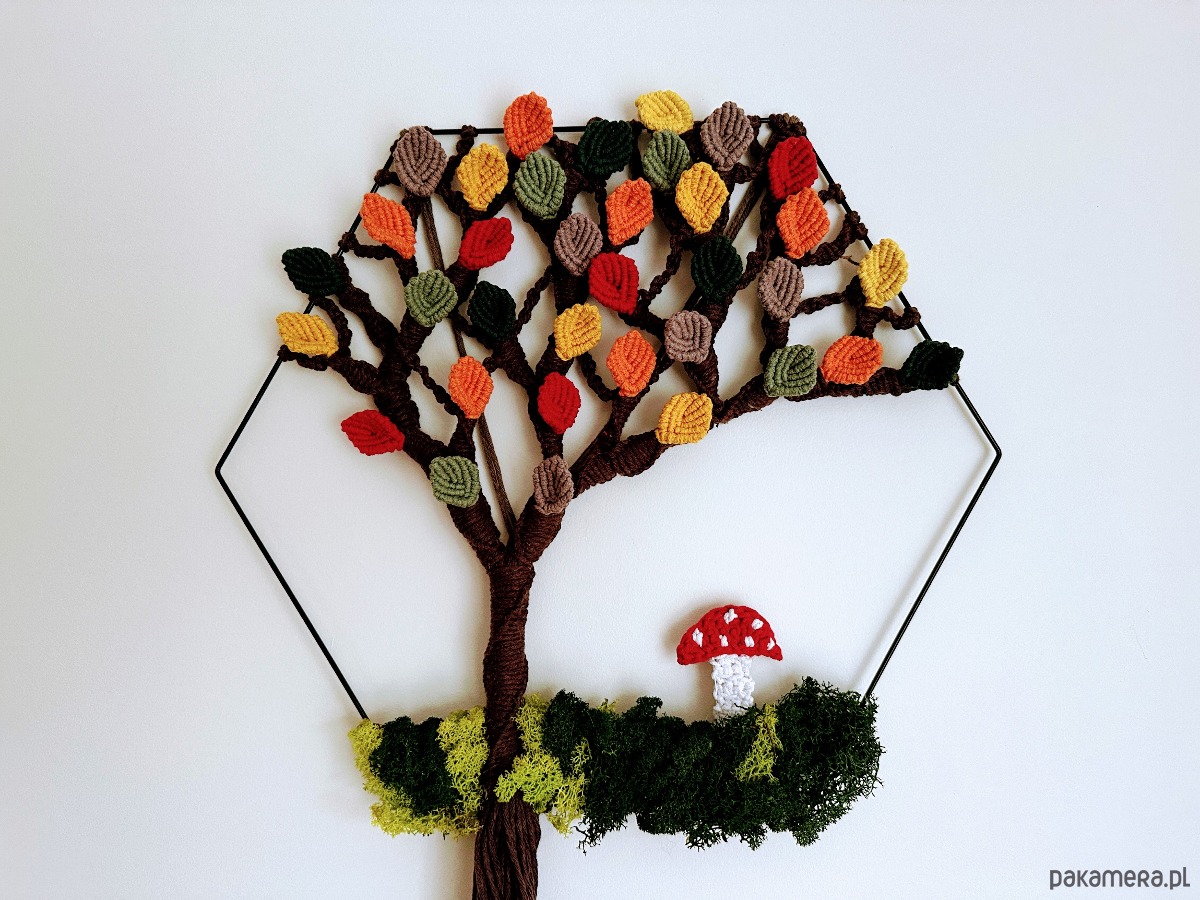 Ręcznie wykonana makrama w kształcie drzewa to wyjątkowa dekoracja, która wprowadzi do wnętrza klimat ciepłej, złotej jesieni. Każdy detal został starannie dopracowany – od kolorowych, jesiennych liści, przez uroczego, czerwonego muchomora, aż po delikatny mech, który dodaje całości naturalności.