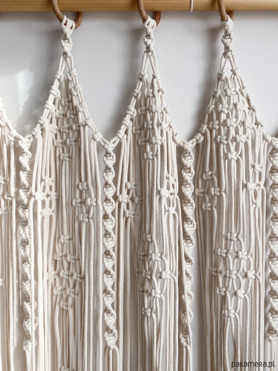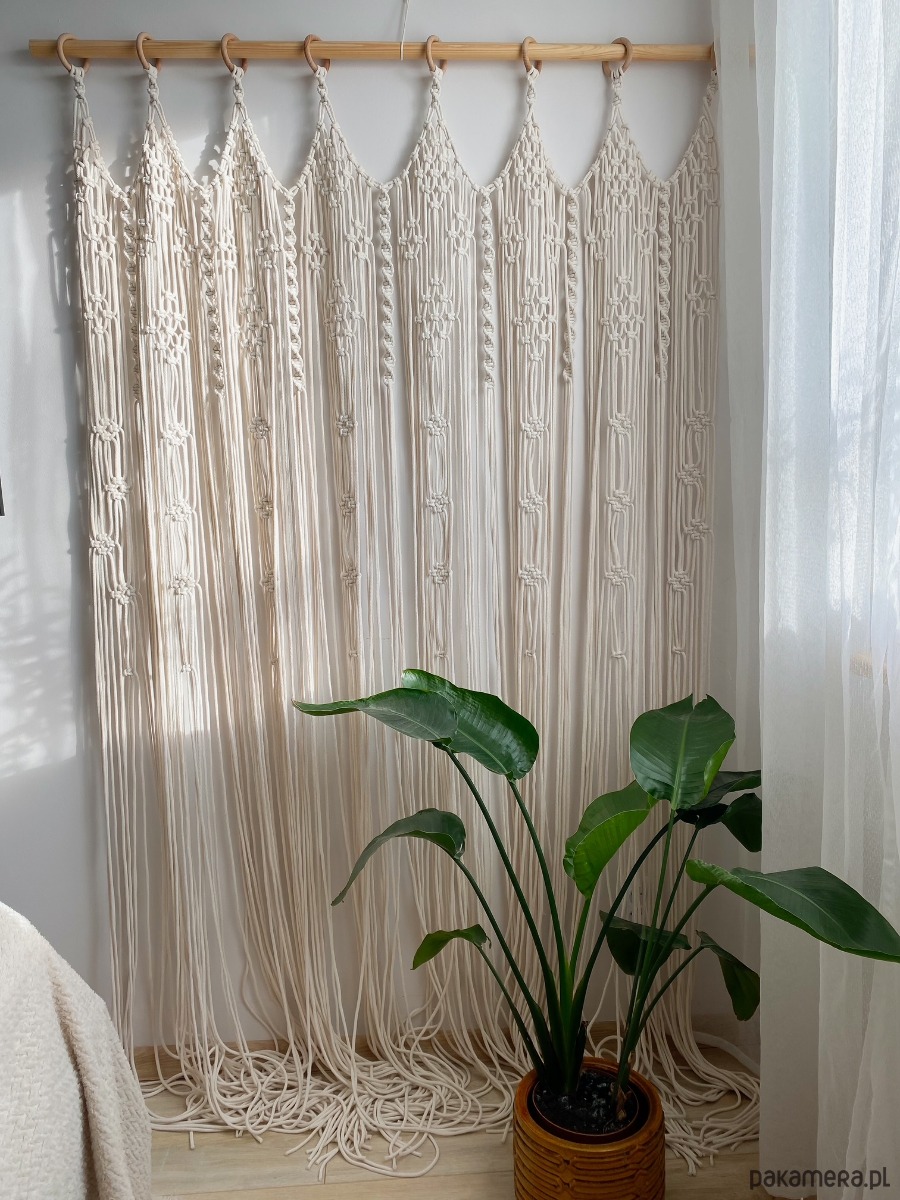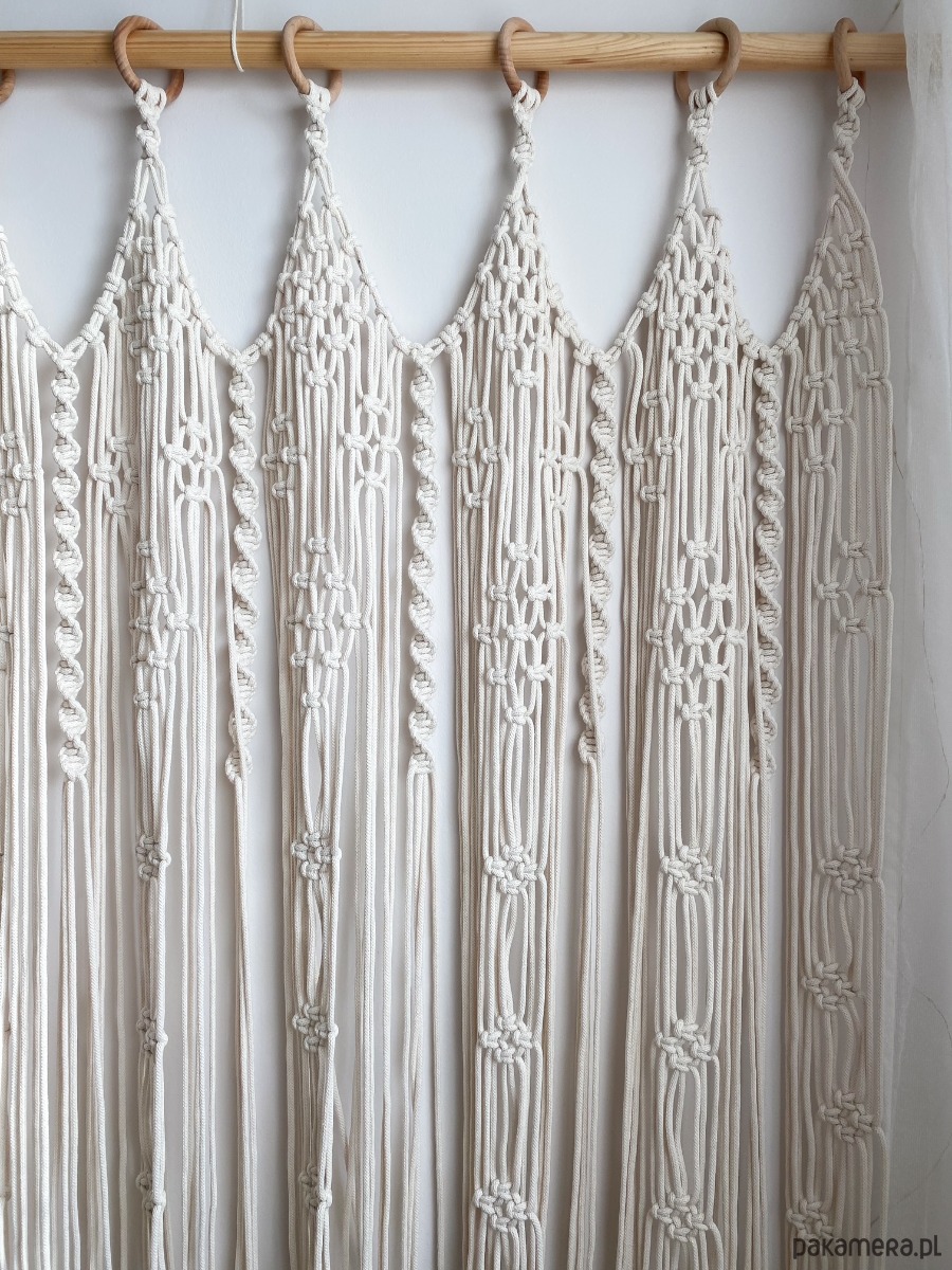 Niepowtarzalna makrama kotara. Wykonana ze sznurka bawełnianego, plecionego o grubości 5 mm. Makrama została wykonana na drewnianych kółkach, tak, aby można ją łatwo zamontować oraz przesuwać na drążku.