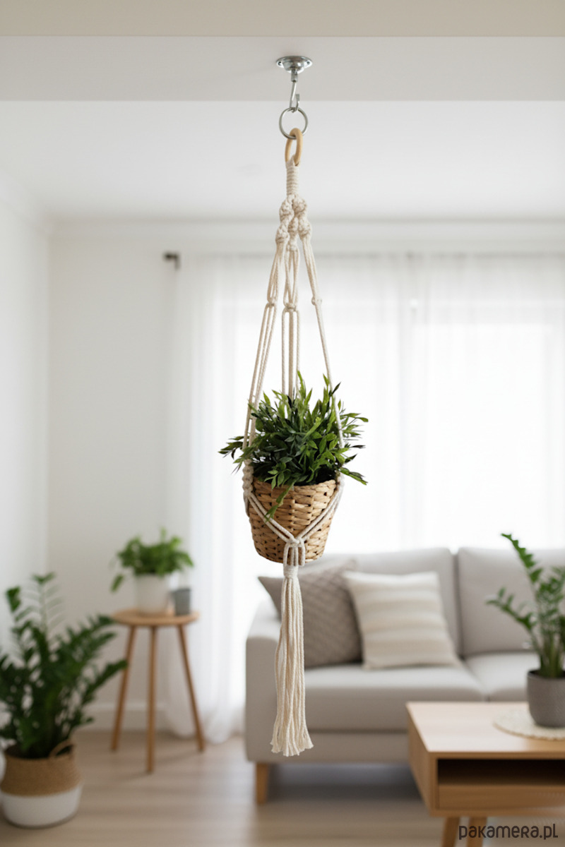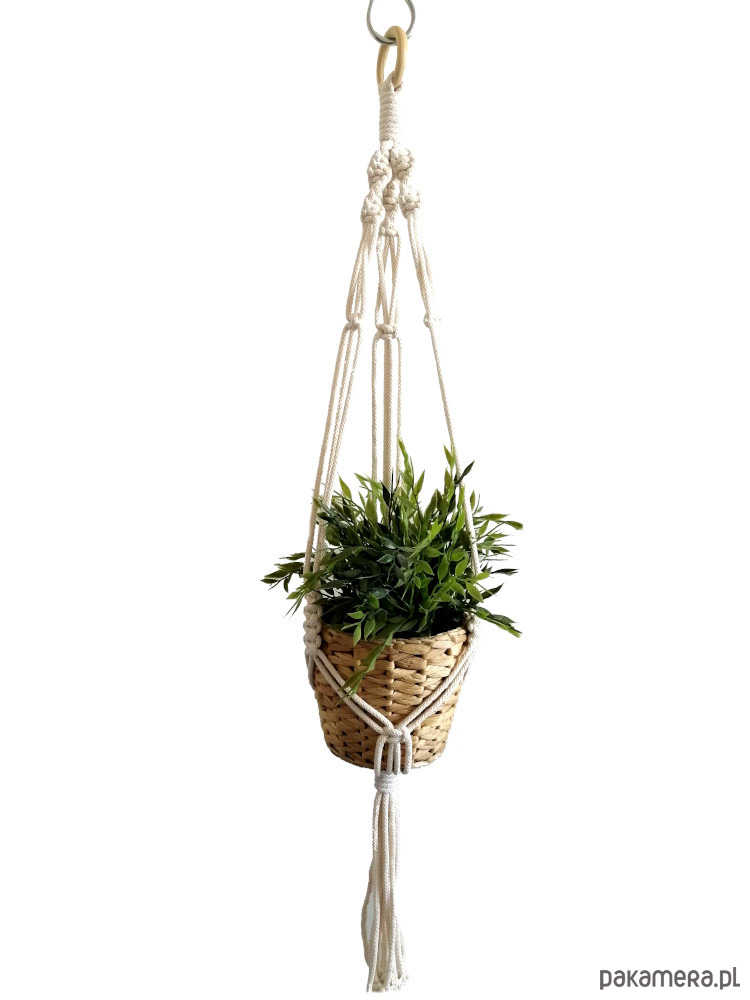 Nasz wyjątkowy kwietnik został wykonany z mocnego sznurka, aby zapewnić trwałość i piękno przez wiele lat. Jego naturalny kolor doskonale pasuje do różnych stylów wnętrz, dodając im subtelnego uroku.