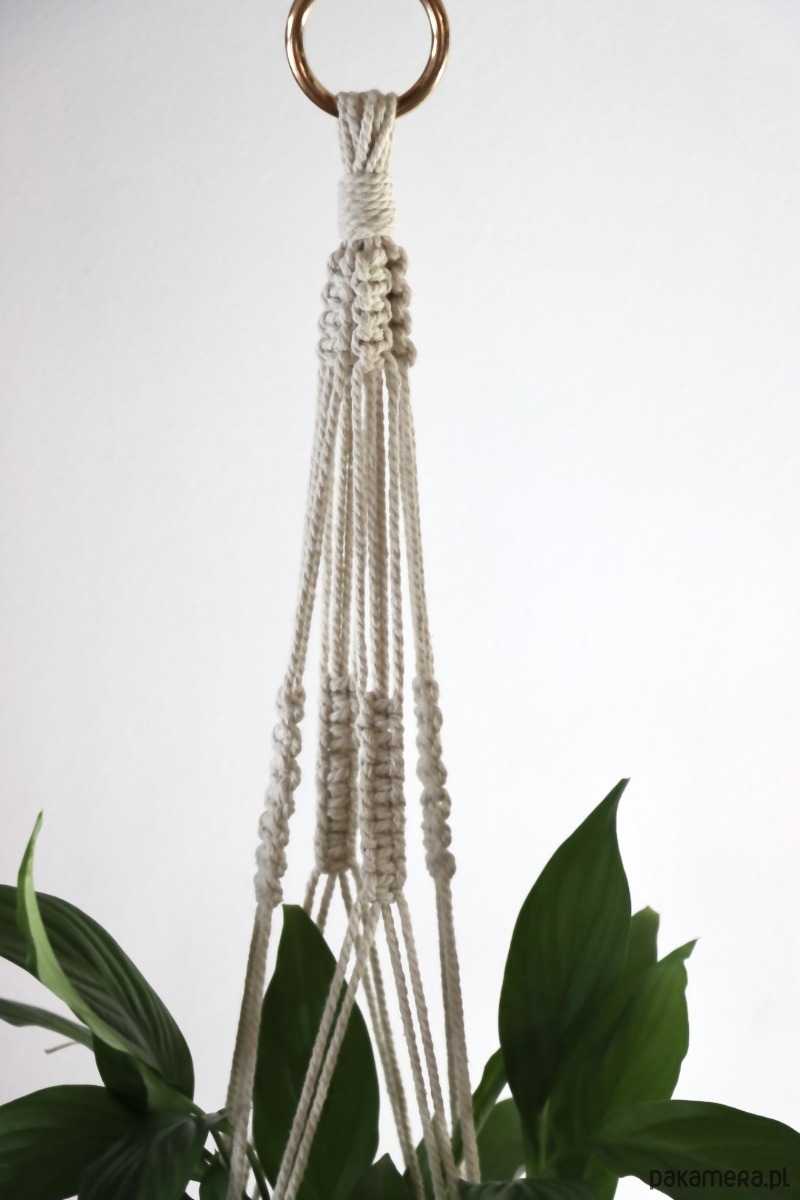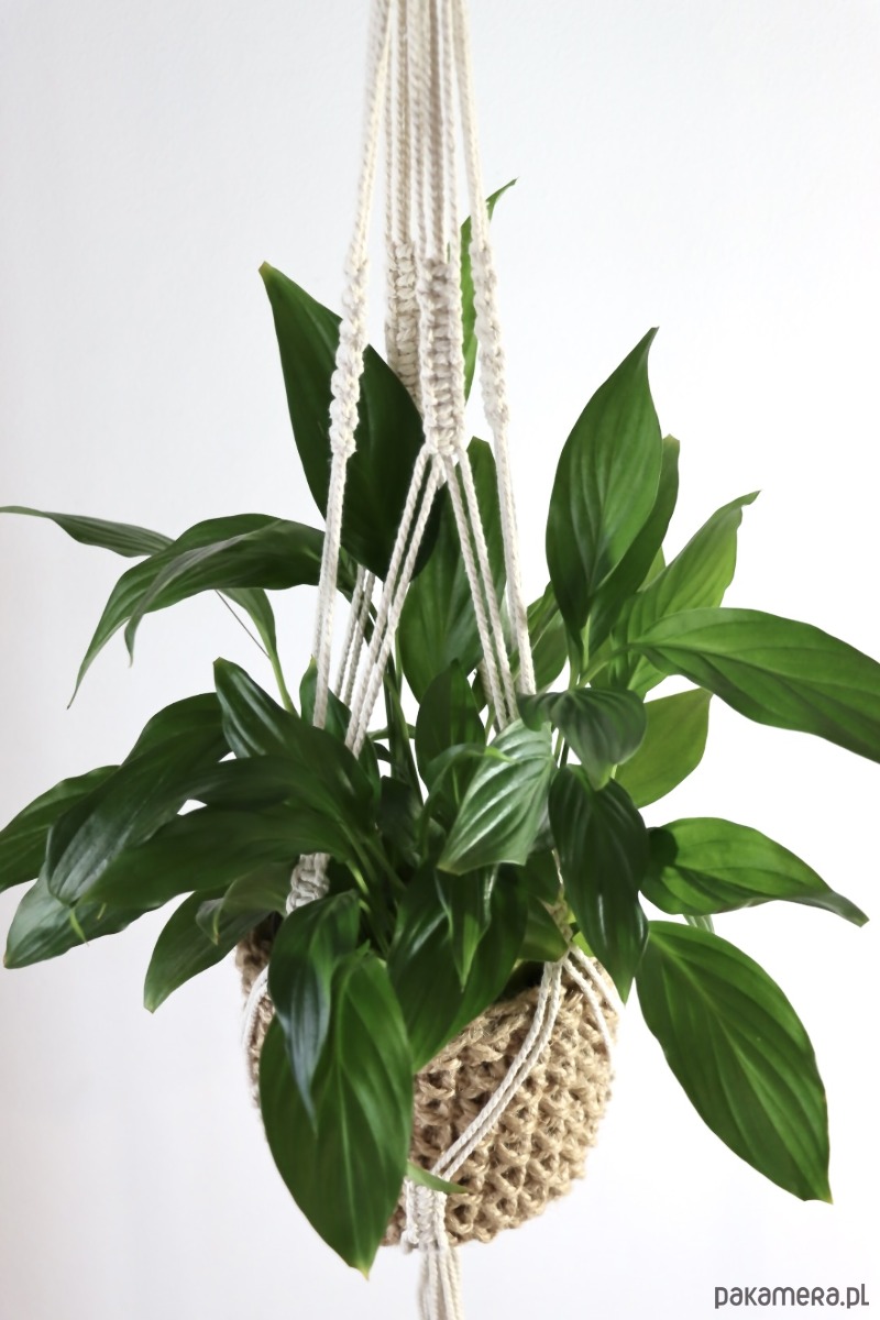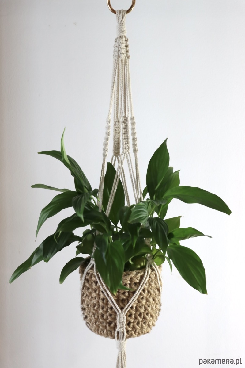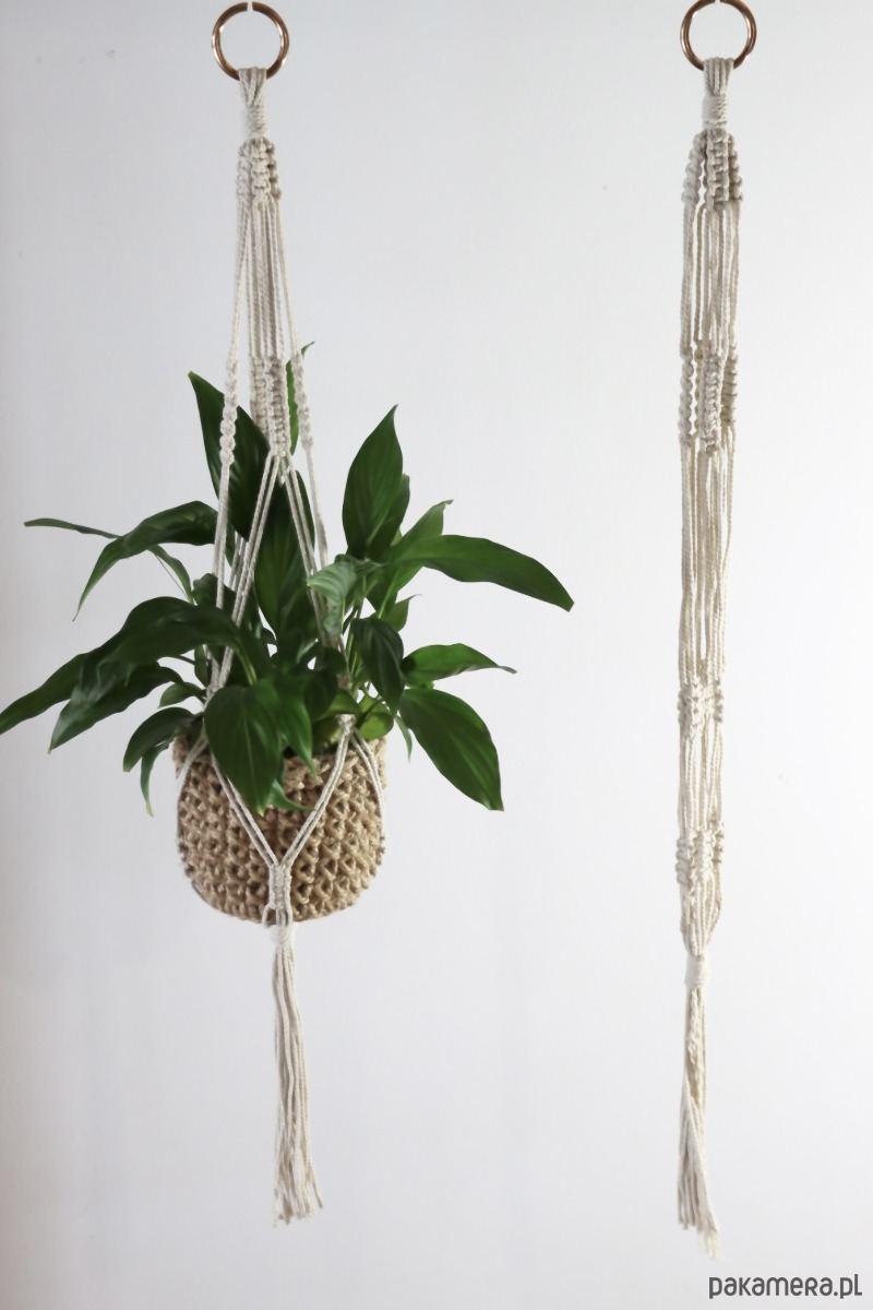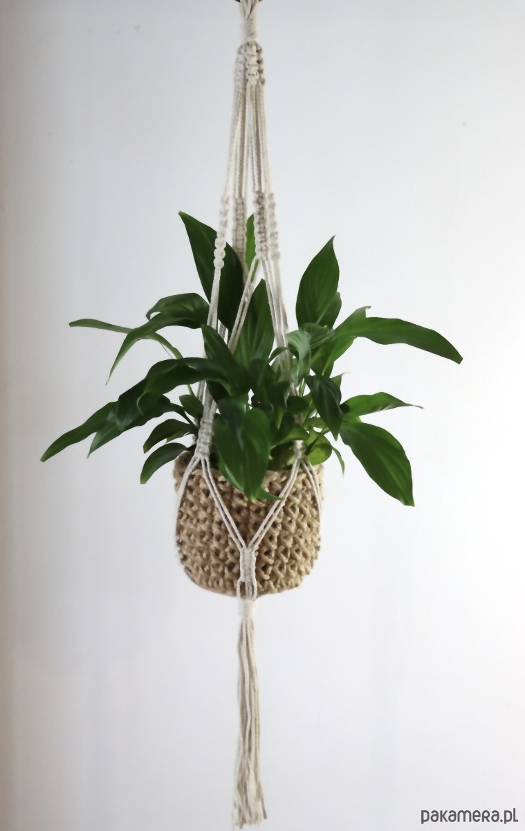 Przedstawiam wyjątkowy makramowy kwietnik wykonany z bawełnianego sznurka w pięknym naturalnym kolorze. To doskonały wybór, by dodać naturalnego i eleganckiego akcentu do każdego wnętrza.
