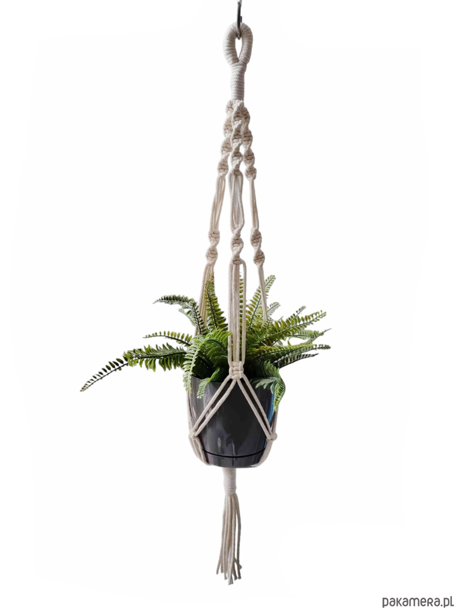 Poszukujesz unikatowego dodatku, który doda harmonii i boho stylu Twojemu wnętrzu? Makrama kwietnik wiszący w ecru to idealny wybór! Wykonany w całości ze sznurka bawełnianego, ten piękny kwietnik nie tylko przyciągnie uwagę, ale również wzbogaci Twoje rośliny swoim wyrafinowanym urokiem.