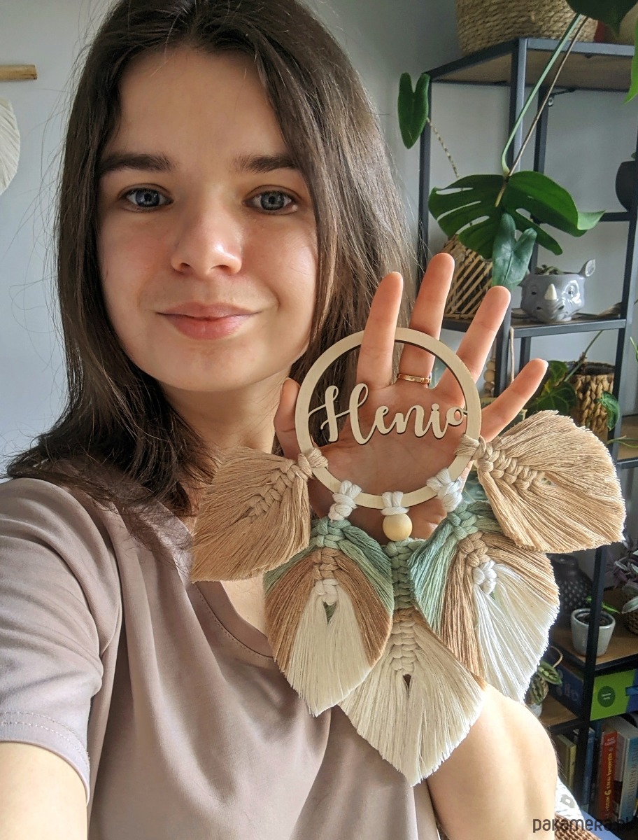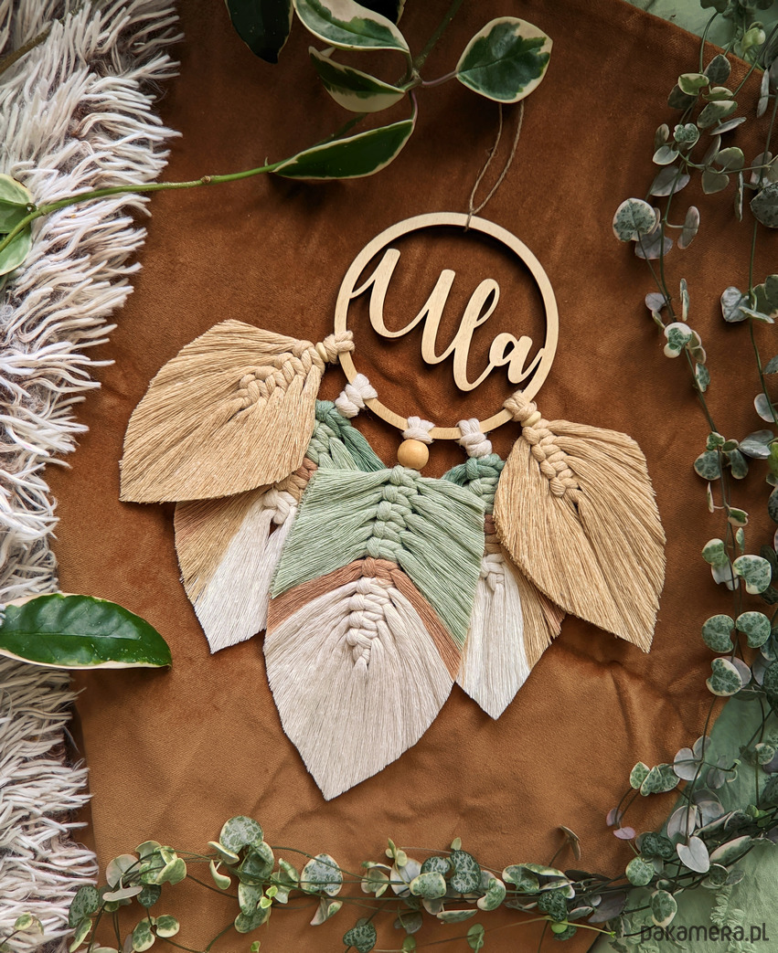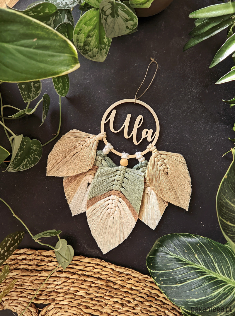 Makrama Łapacz Snów z imieniem 26cm, zielony z imieniem