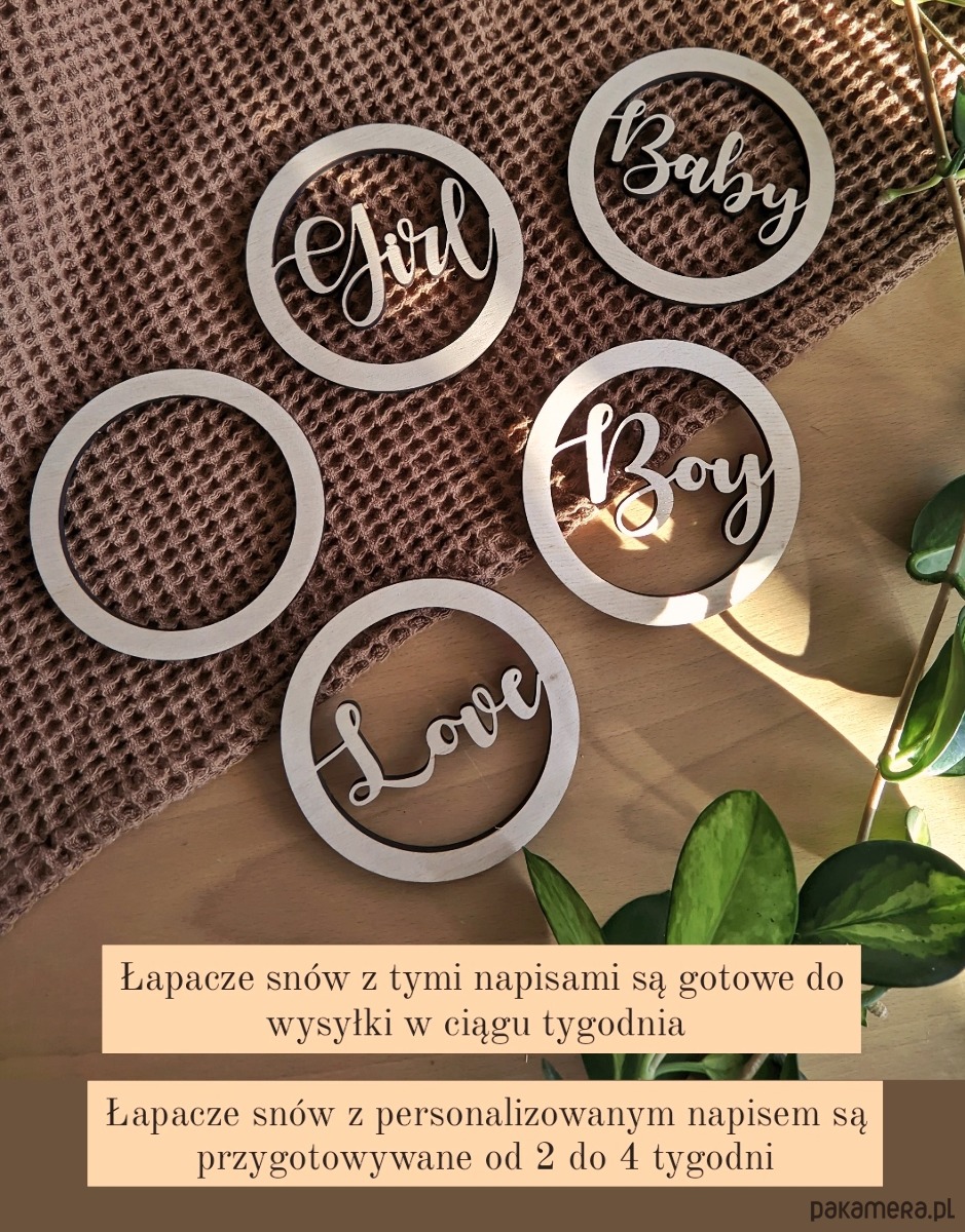 Napis na łapaczu może być dowolny: imię, nazwisko, napisy "Home", "Love" - co tylko zapragniesz :) Jako że jest to najmniejszy rozmiar łapacza snów w ofercie sugeruję aby napis był jednowyrazowy i dość krótki aby był czytelny.