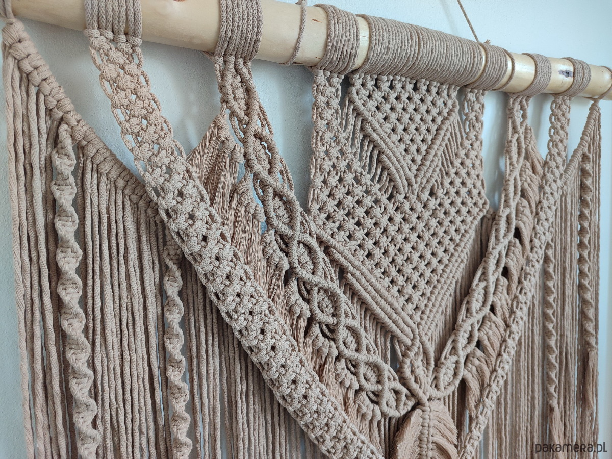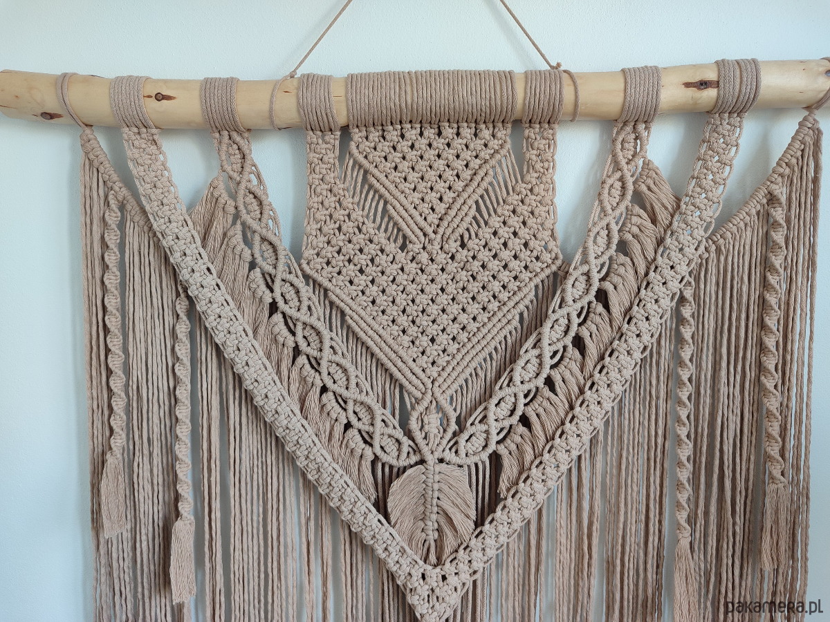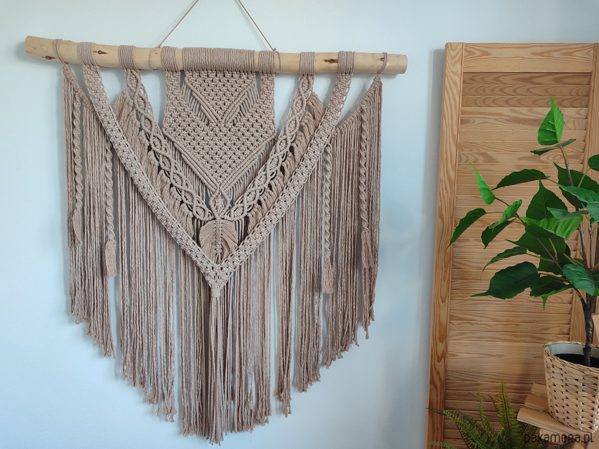Makrama do powieszenia na ścianę wykonana ze sznurka plecionego i skręcanego 3 mm w kolorze beżowym na brzozowej gałęzi.