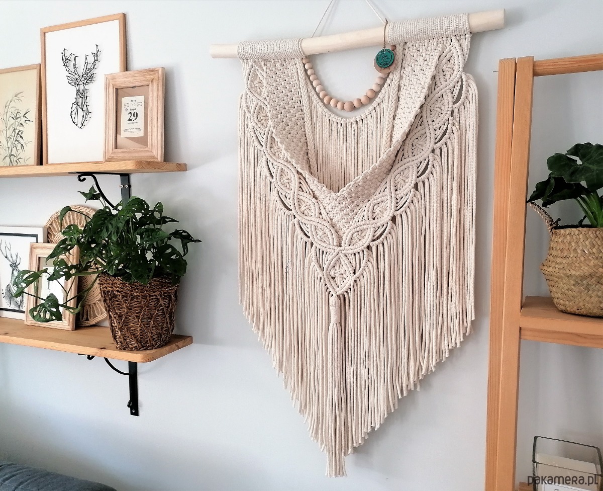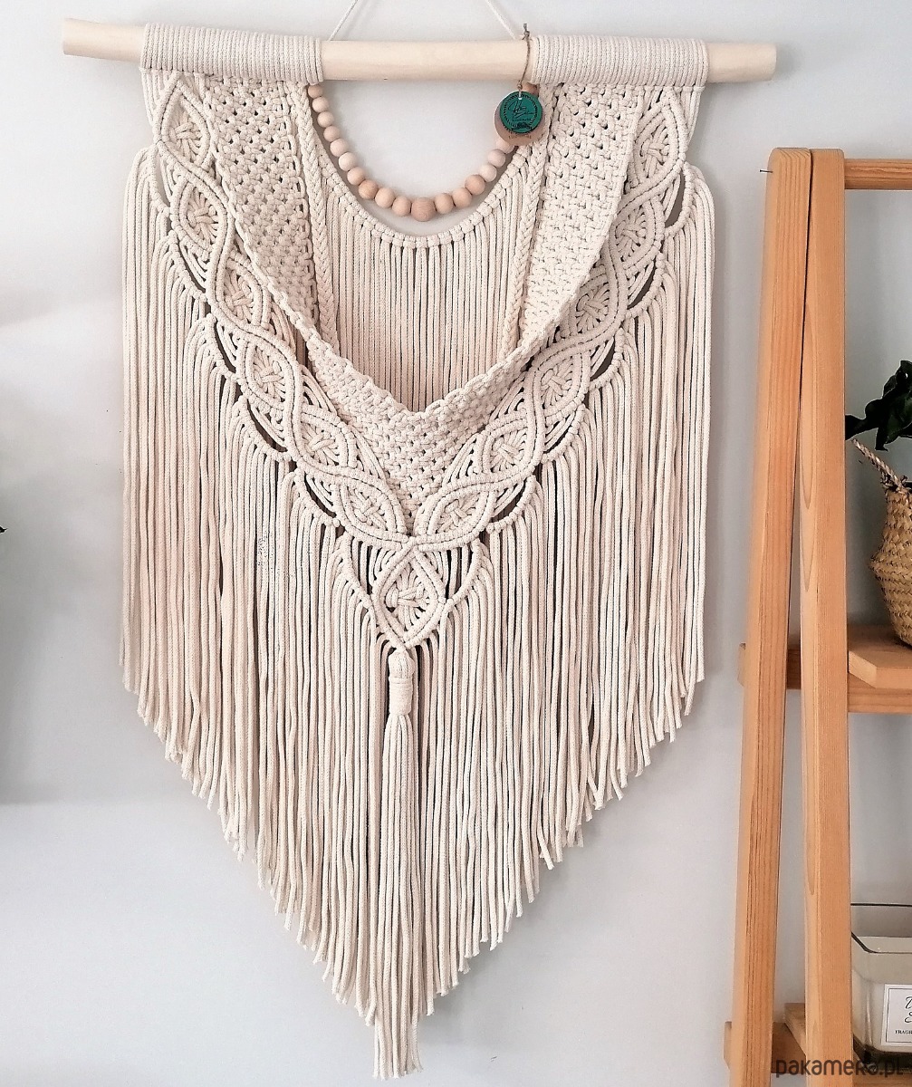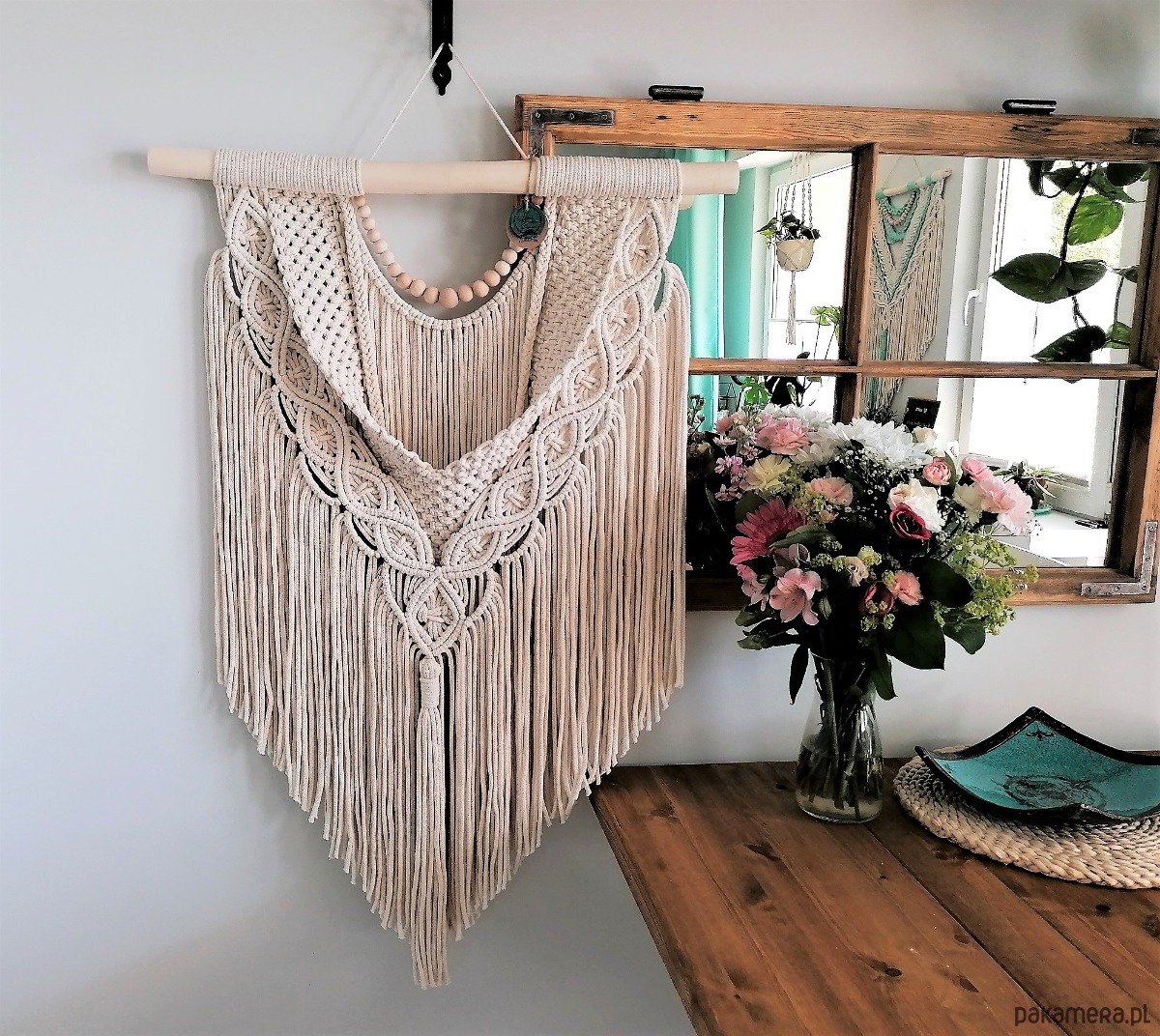 Mayari wykonana jest na naturalnej gałęzi, ze sznurka bawełnianego 5 mm w kolorze naturalnego ecru. Oczywiście możliwe jest wykonanie makramy w dowolnym kolorze. Kolorystyka danego sznurka może nieznacznie odbiegać od tego na zdjęciu- spowodowane jest to różną kalibracją naszych monitorów, ale również delikatnymi różnicami w odcieniach w poszczególnych partiach sznurków.