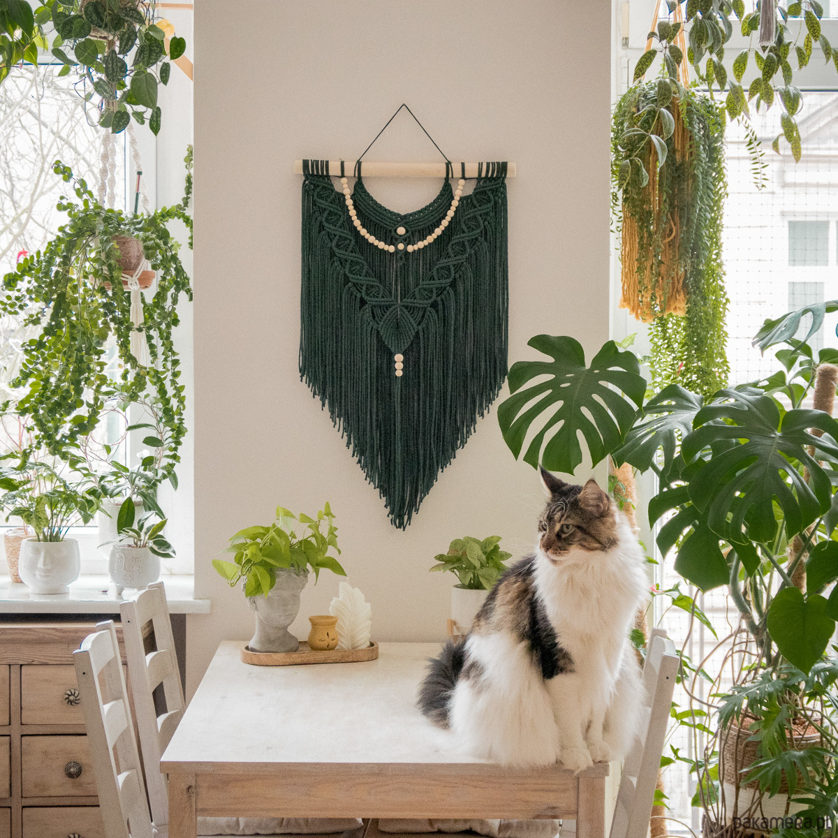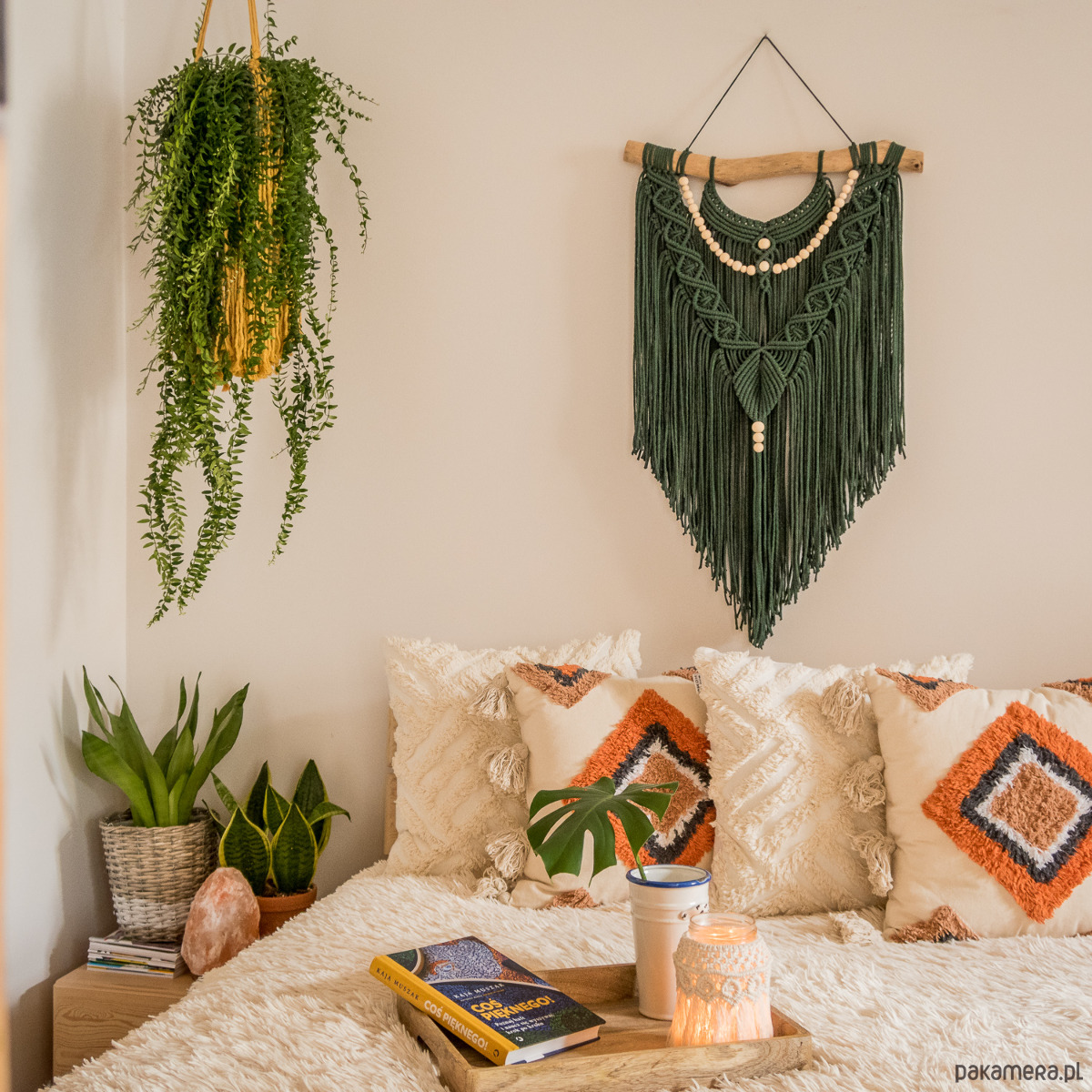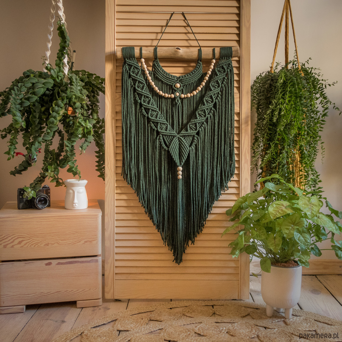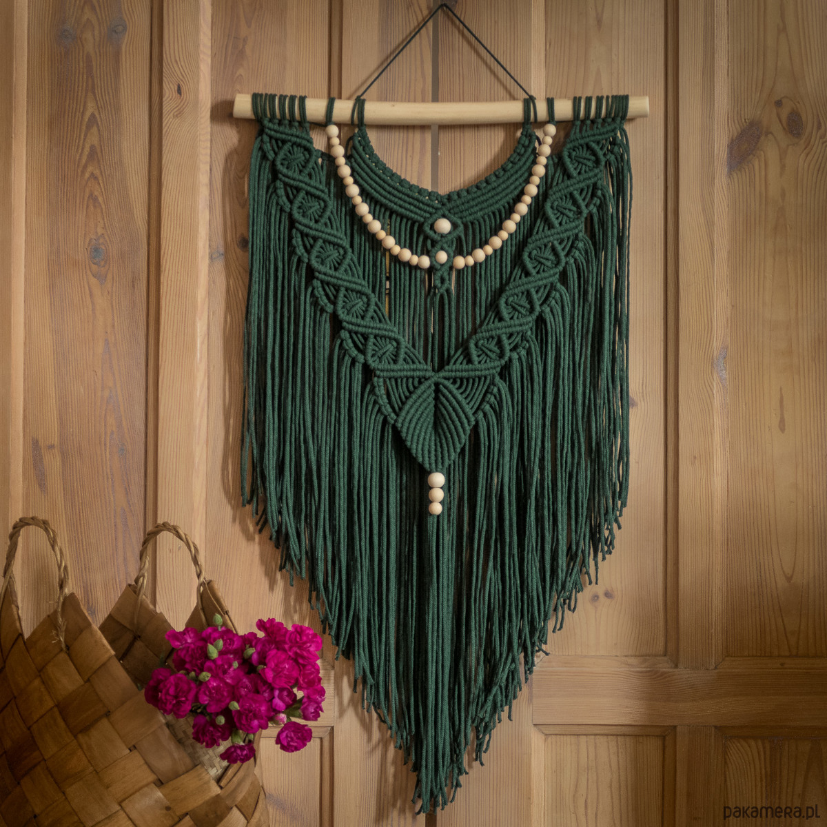 Ręcznie wykonana makrama w kolorze butelkowej zieleni. Ozdobiona drewnianymi koralikami.
