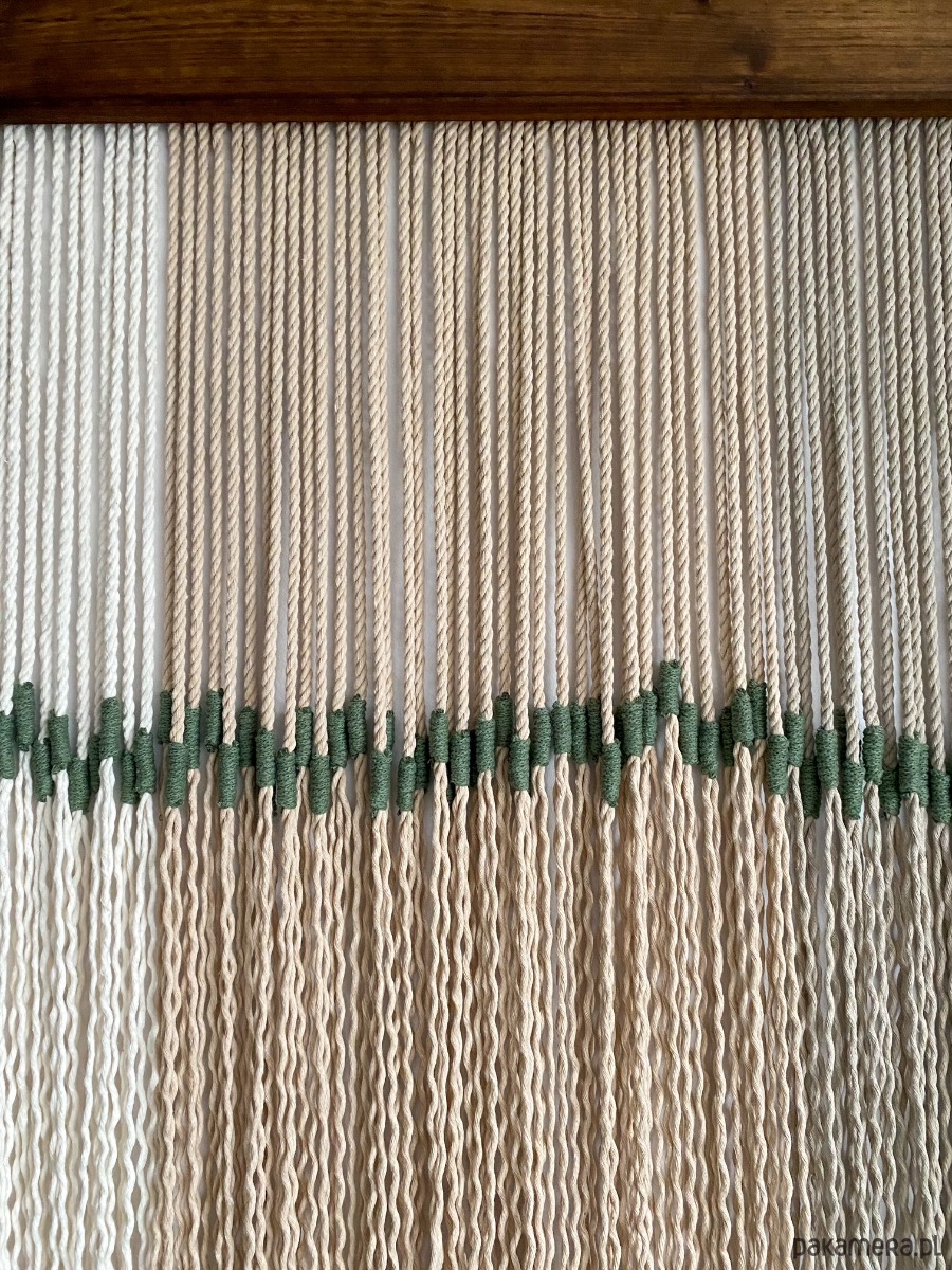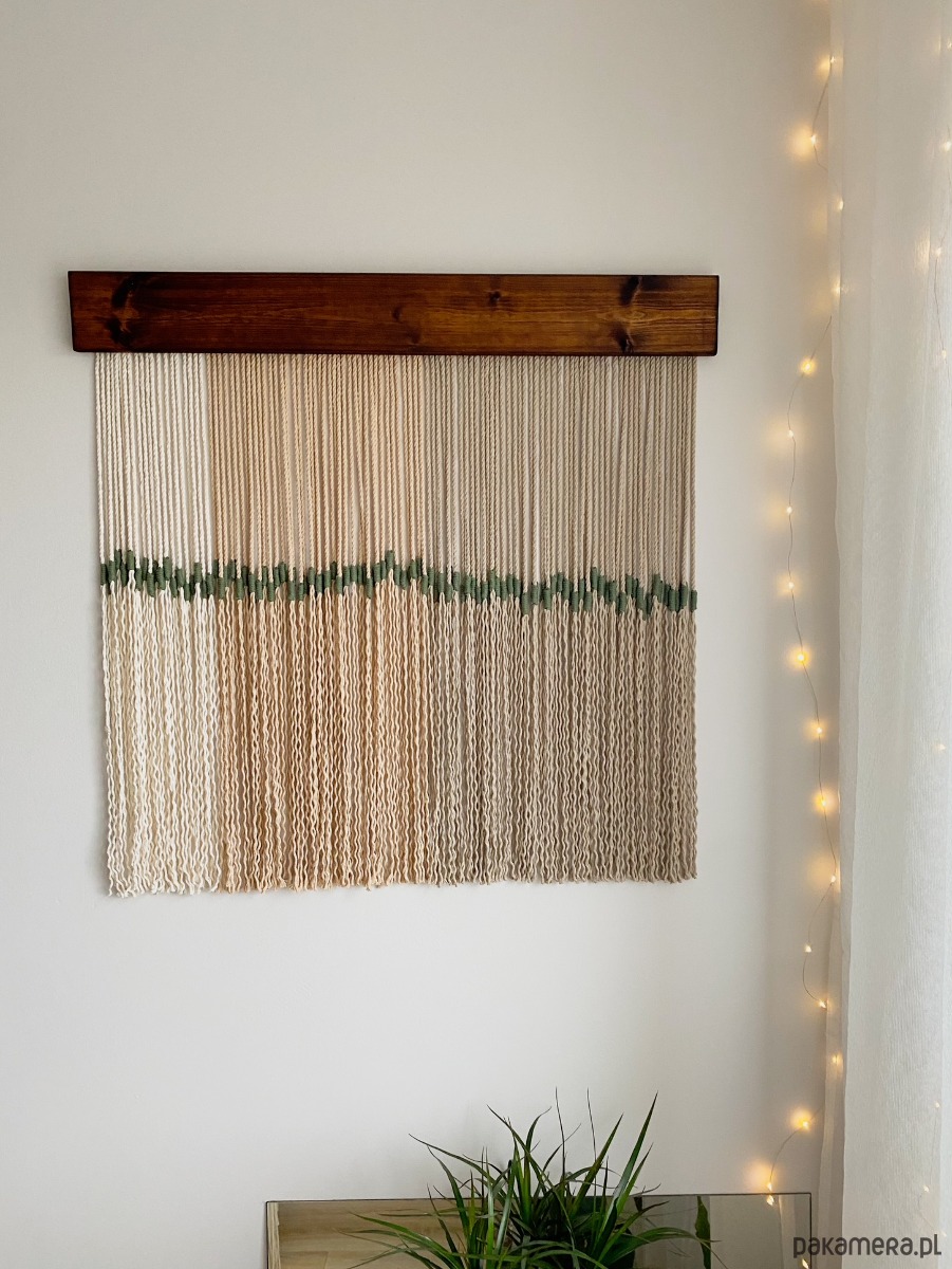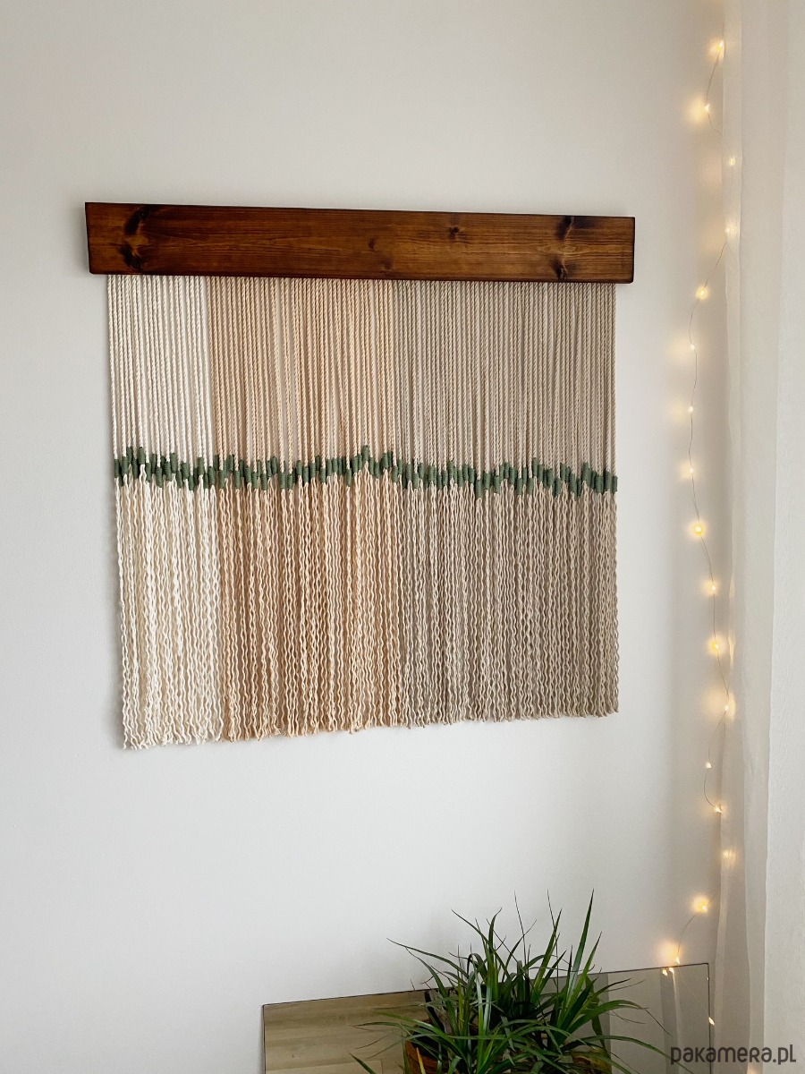 Makrama jest wykonana z potrójnie skręcanego sznurka bawełnianego 5mm w kolorze ecru, nude i piaskowym, a dodatki kolorystyczne są wykonane w odcieniu szałwiowym.