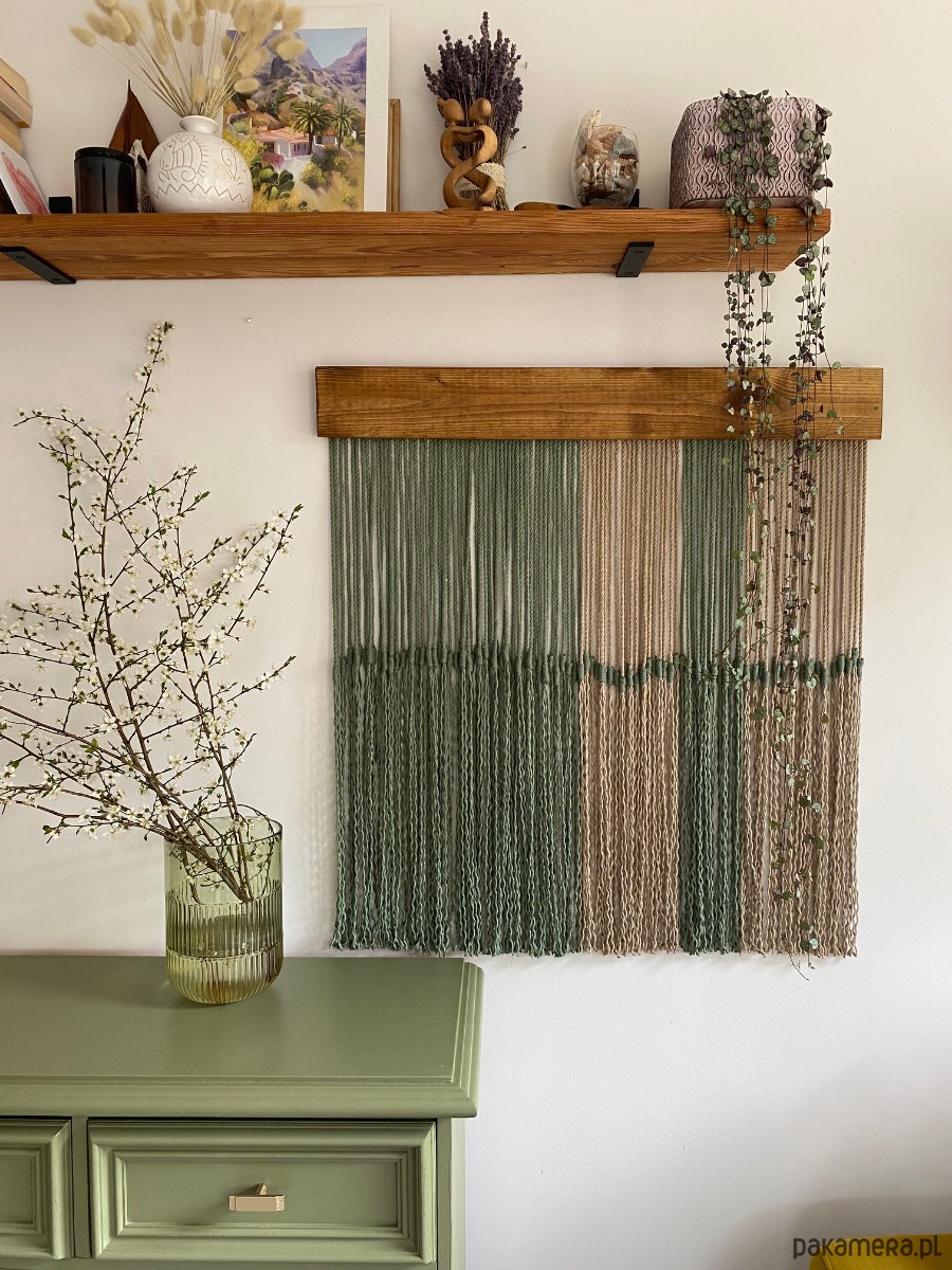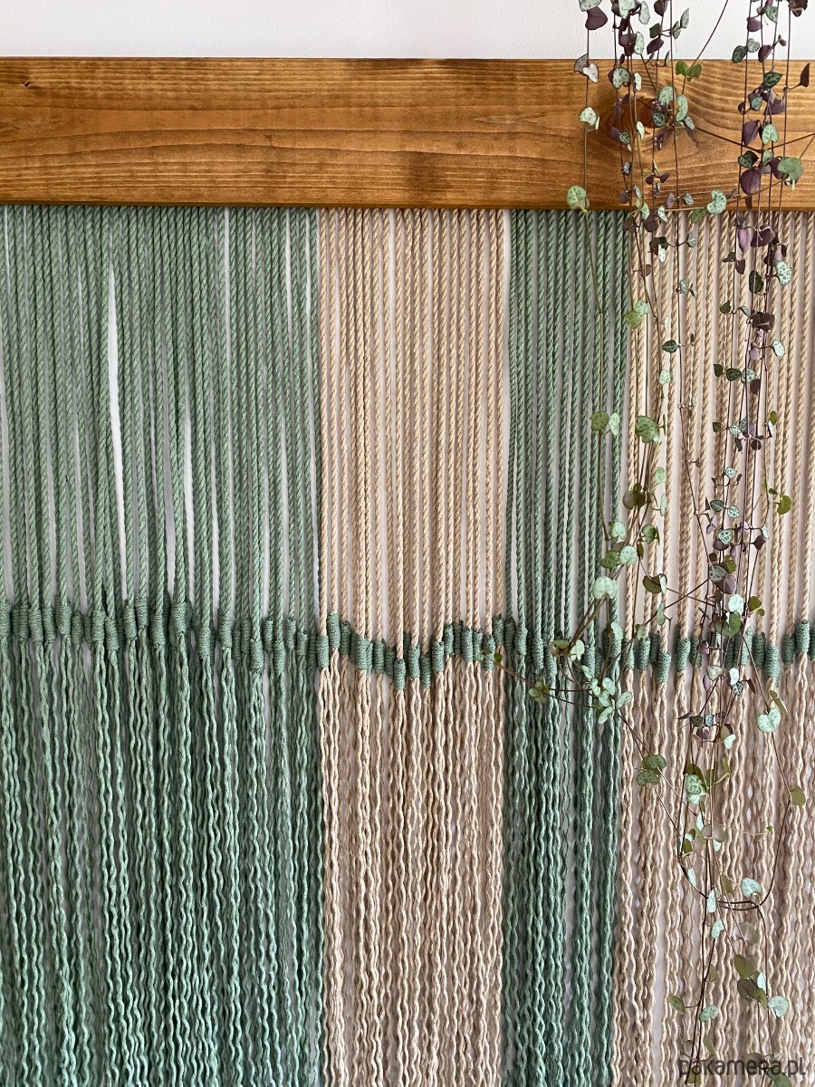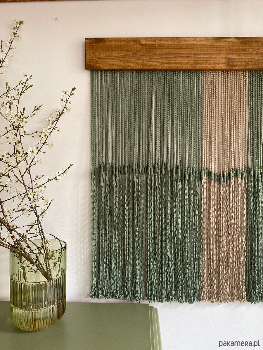 Makrama jest wykonana z potrójnie skręcanego sznurka bawełnianego 5mm w kolorze szałwia oraz beżowym.