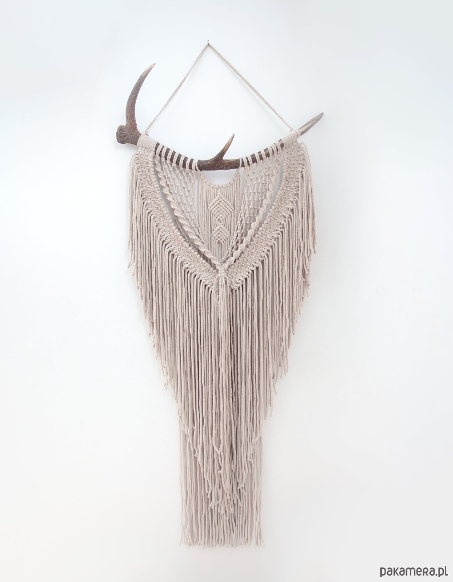 Makrama z fredzlami na podróżu.. Szerokosc poroża 65cm.. Długość makramy 130cm plus sznurek do zawieszenia.. Kolor beżowy.. Sznurek bawełniany.. Dostępna od ręki.. Tylko jeden.. Niepowtarzalny egzemplarz.. Super do dekoracji domu. Lub na prezent . Handmade..