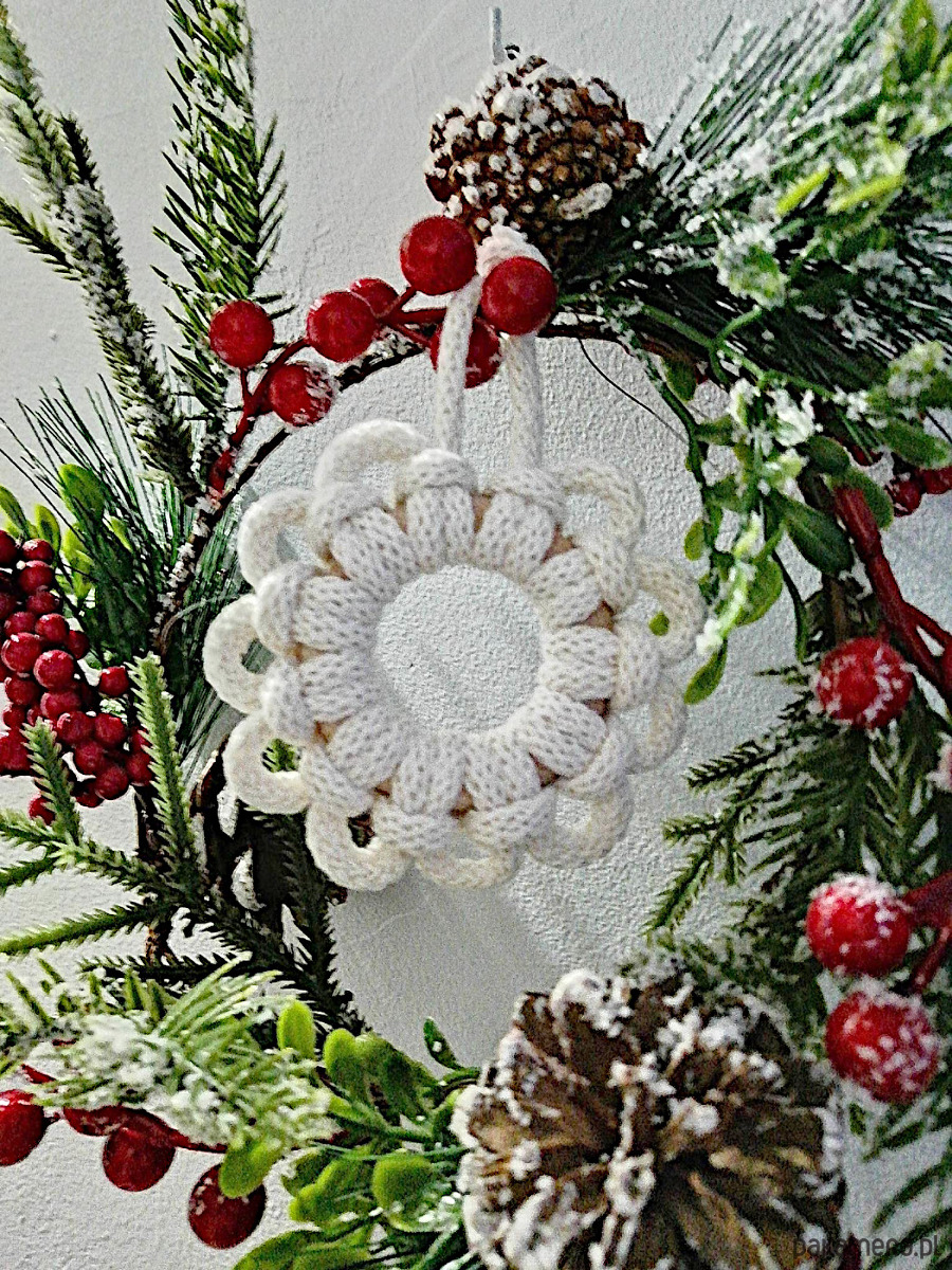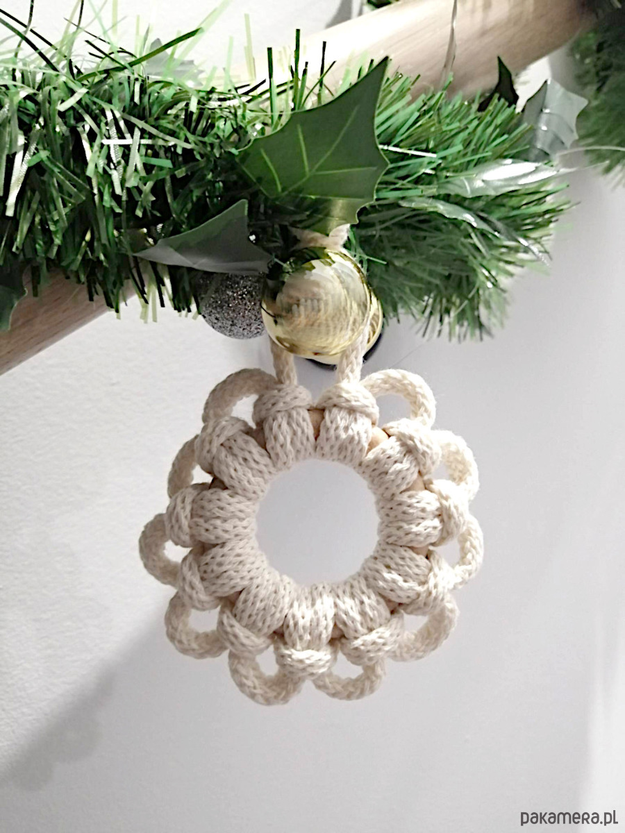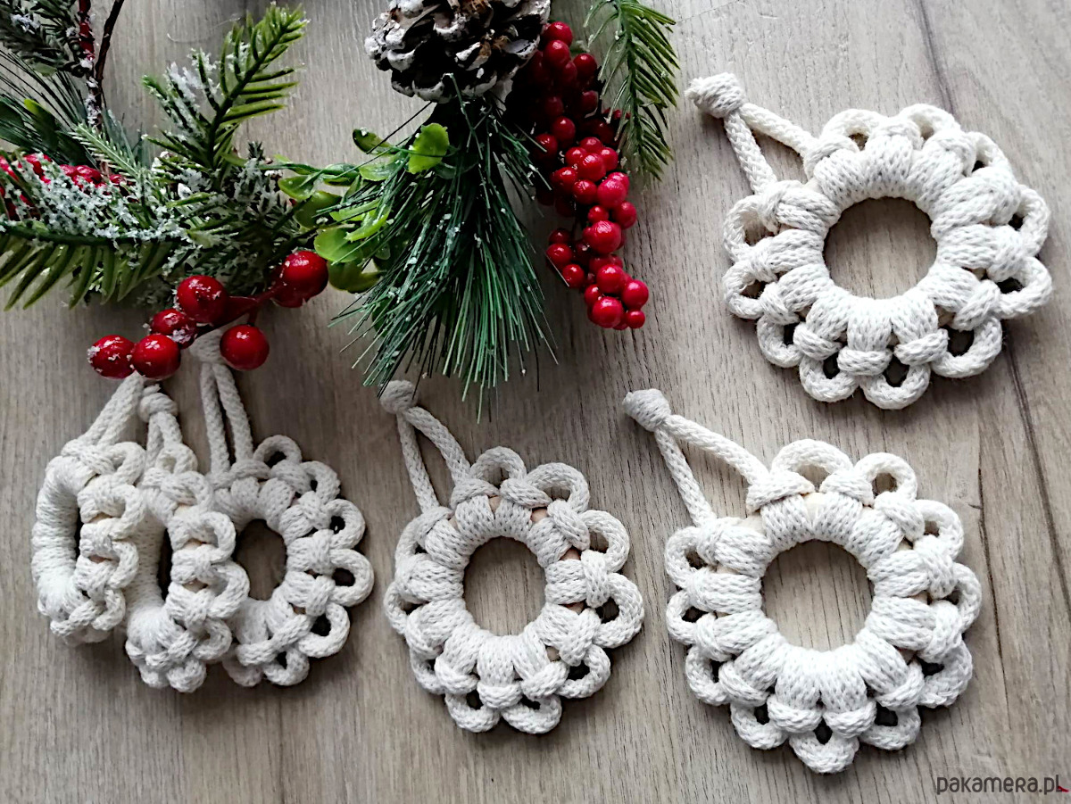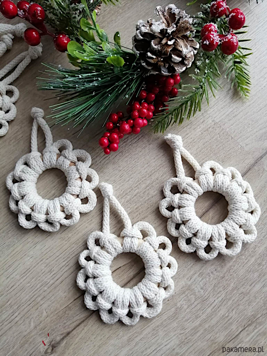 Ozdoby bożonarodzeniowe do zawieszenia na choinkę, wykonane ze sznurka w kolorze naturalnym i kółek drewnianych.