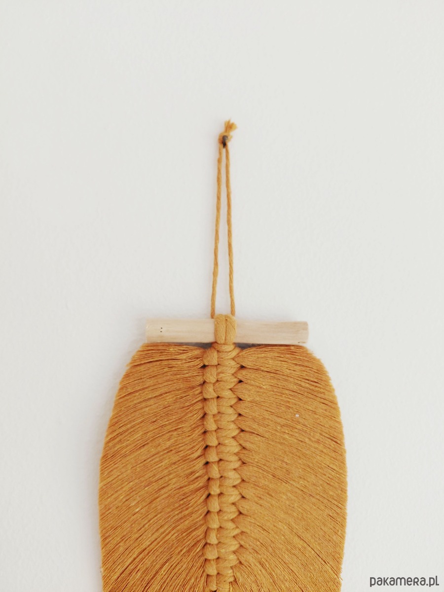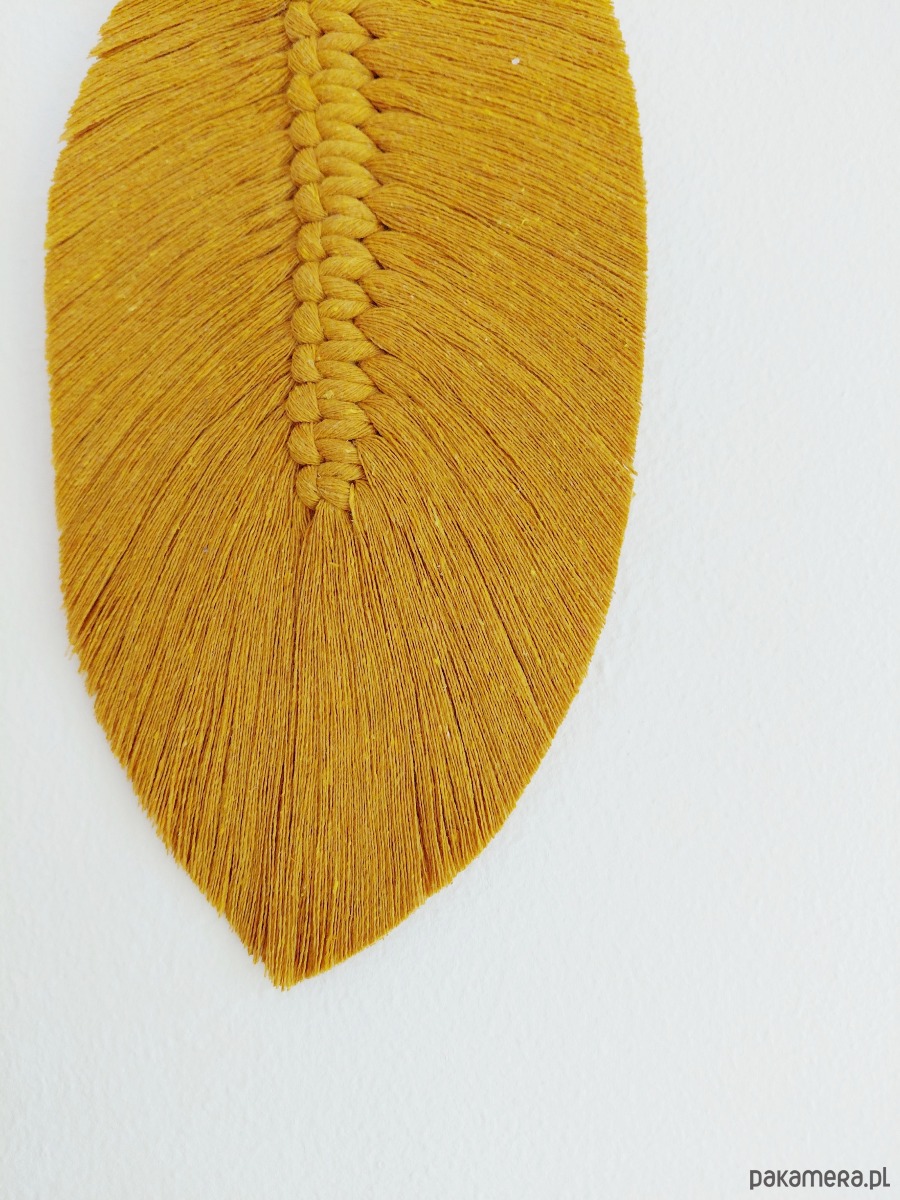 Małe makramowe piórko, które sprawdzi się zarówno w komplecie z większą dekoracją, jak i jako samodzielny akcent.