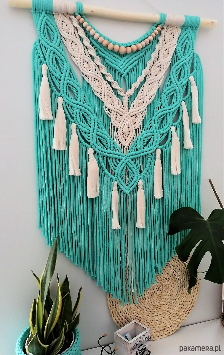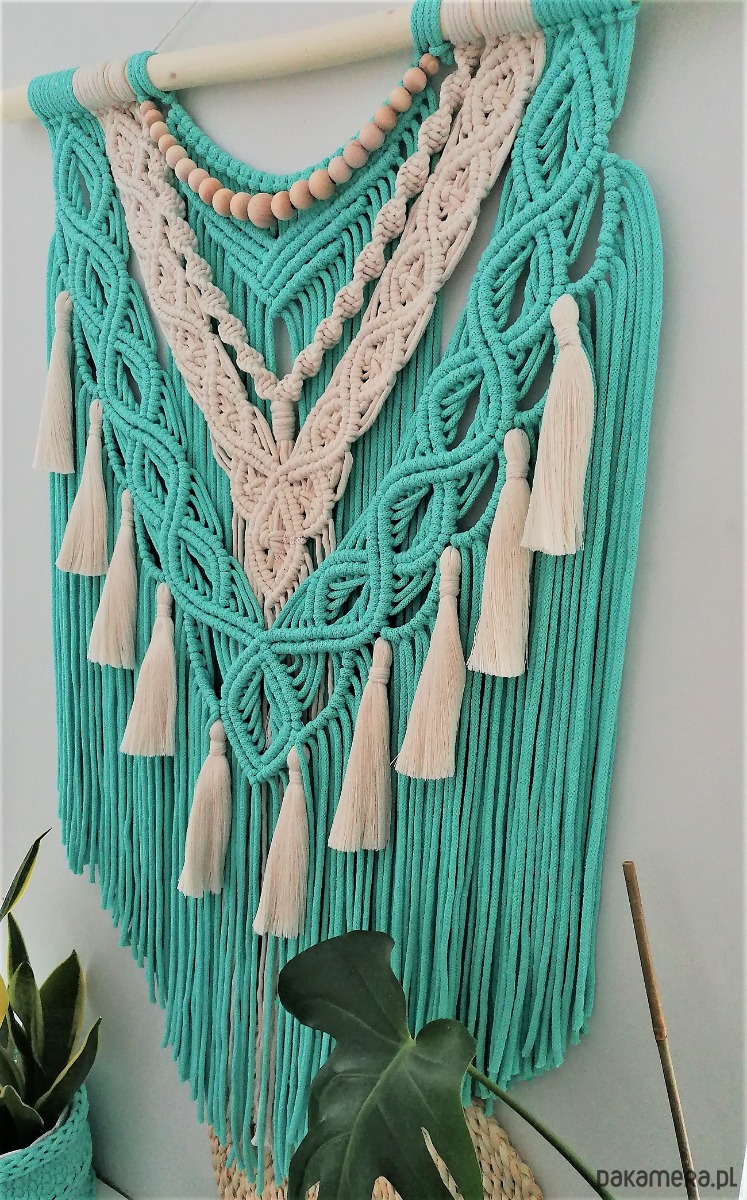 Makrama ścienna wykonana ze sznurka bawełnianego 5 mm w kolorze mięty oraz sznurka skręcanego 5 mm w kolorze ecru. Idealny dodatek do wnętrz w stylu boho, skandynawskim, hampton, shabby chic, a nawet do aranżacji eklektycznych.
