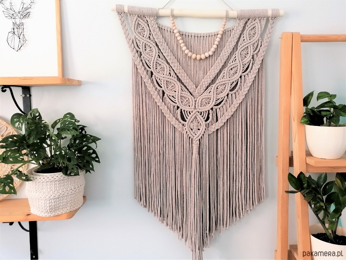 Makrama ścienna wykonana ze sznurka bawełnianego 5 mm w kolorze jasnego beżu z dodatkiem korali z naturalnego drewna. Idealny dodatek do wnętrz w stylu boho, skandynawskim, hampton, shabby chic, a nawet do aranżacji eklektycznych.