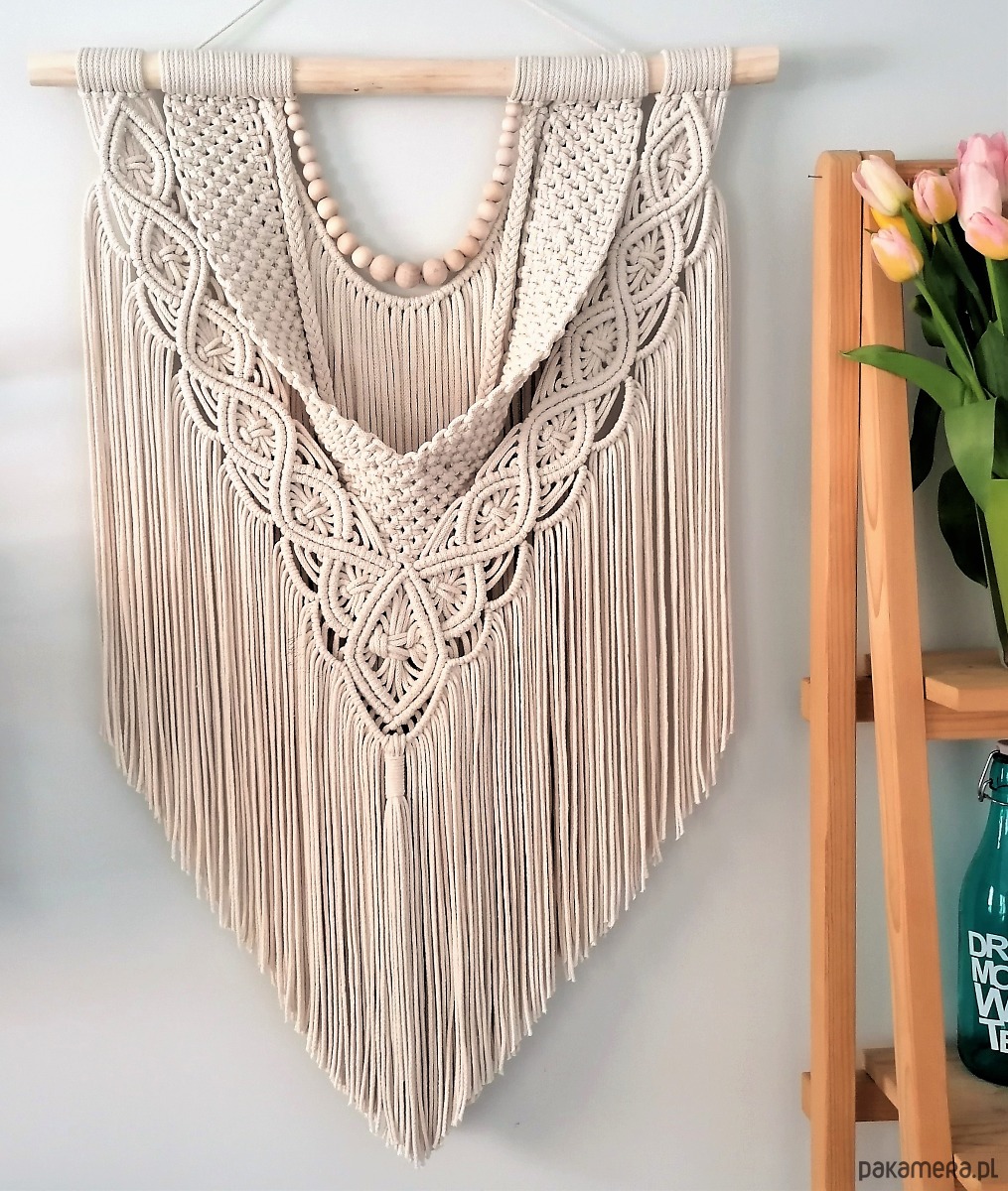 Makrama ścienna wykonana z dwóch rodzajów sznurka bawełnianego 3 i 5 mm w kolorze ecru z dodatkiem korali z naturalnego drewna. Idealny dodatek do wnętrz w stylu boho, skandynawskim, hampton, shabby chic, a nawet do aranżacji eklektycznych.
