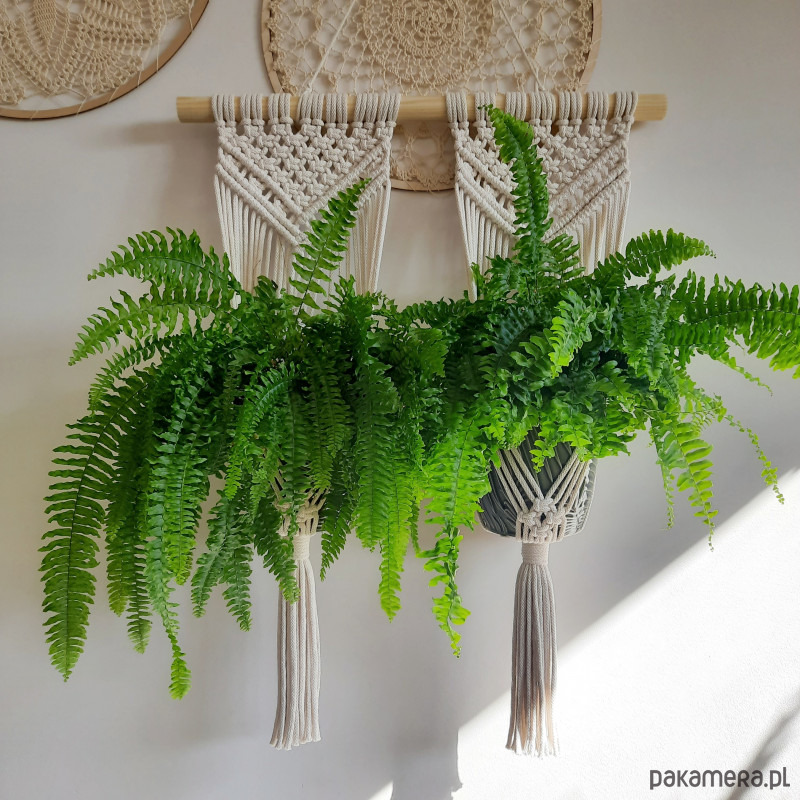 Wypleciony na drewnianym drążku. Kwietnik pięknie ozdobi ścianę, pasuje do każdego wnętrza. Idealne rozwiązanie, gdy chcemy uwolnić parapety.