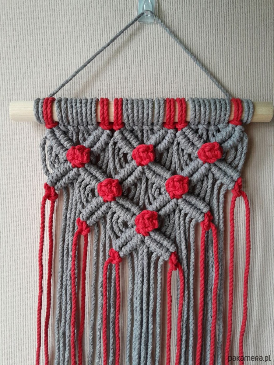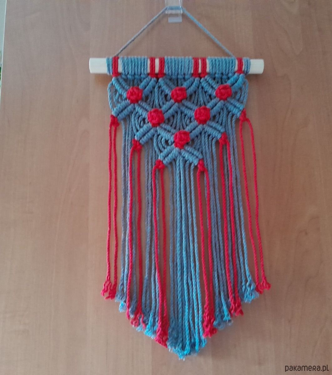 Technika wykonania - makrama, jest umieszczona na drewnianym kijku.
