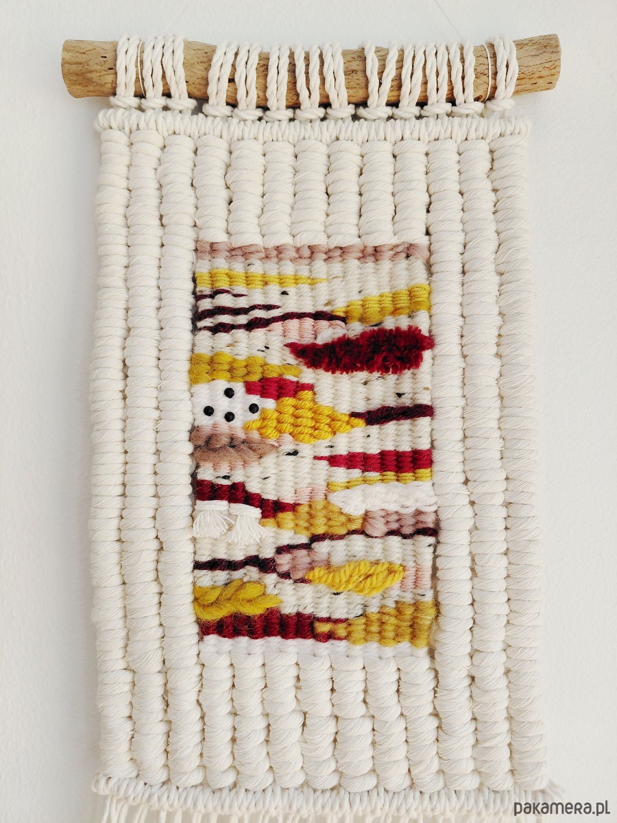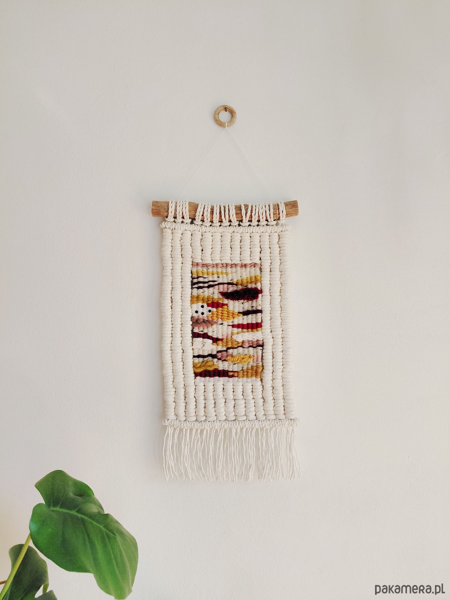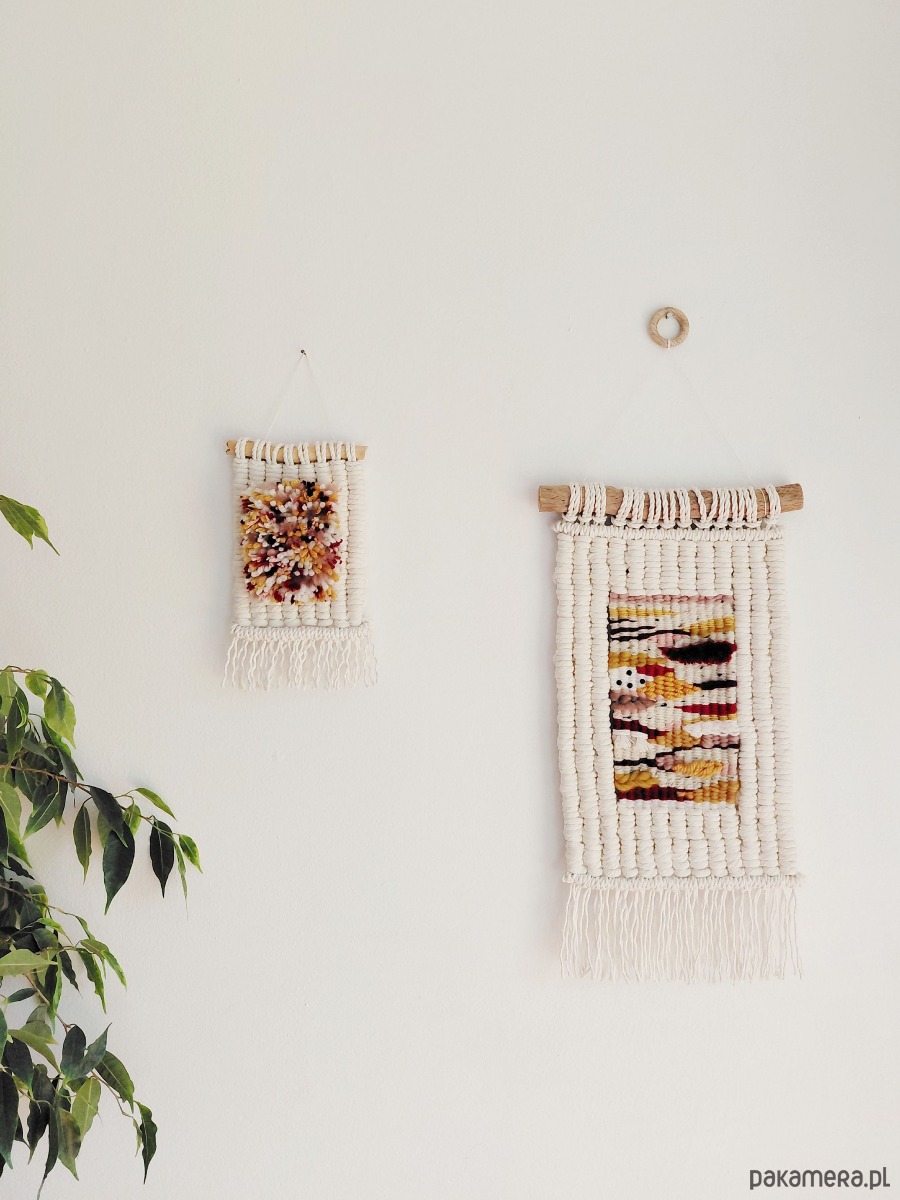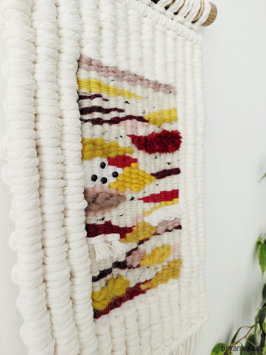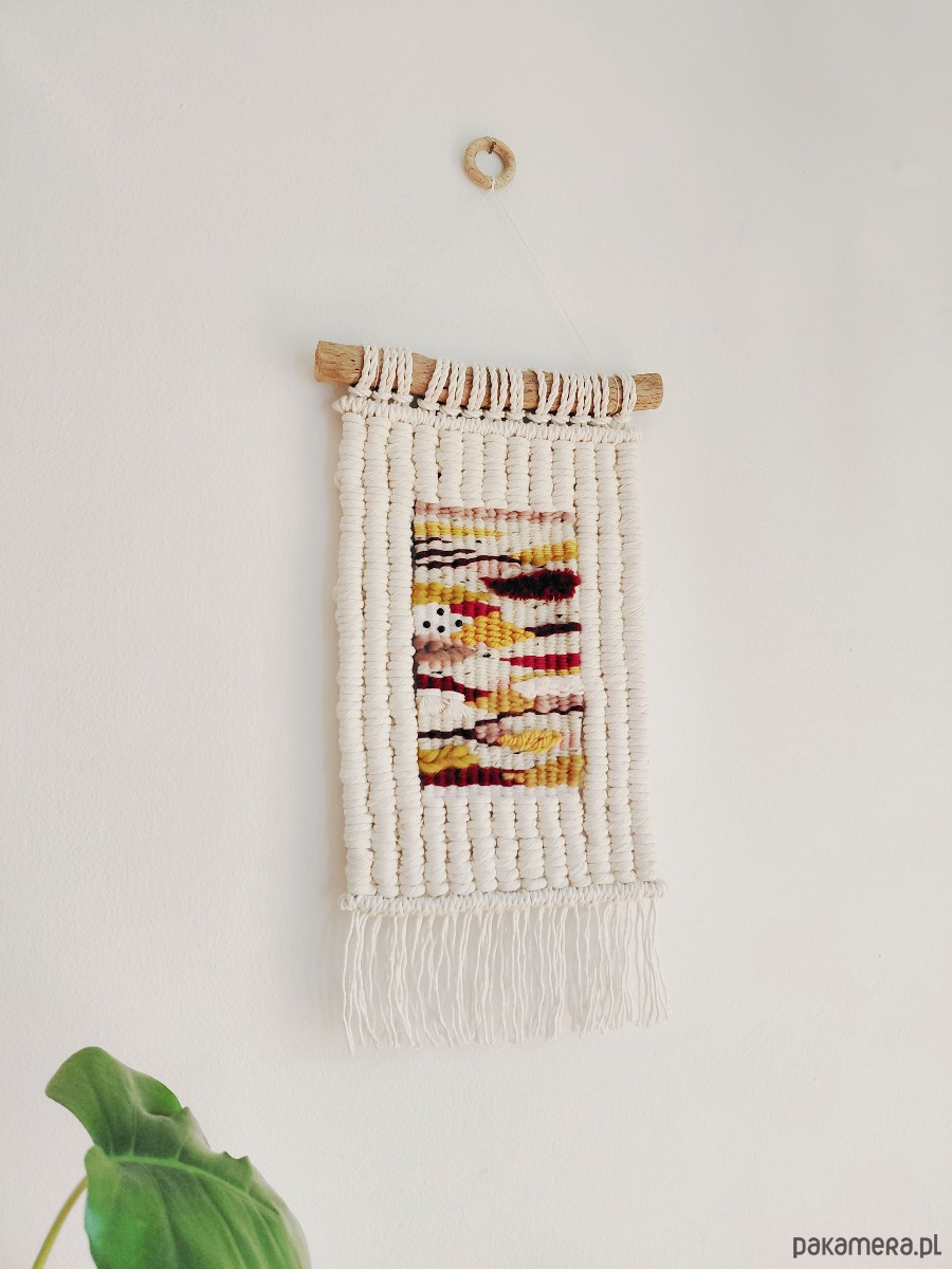 Dekoracja ścienna wykonana techniką macraweave, będącej połączniem makramy i gobelinu.