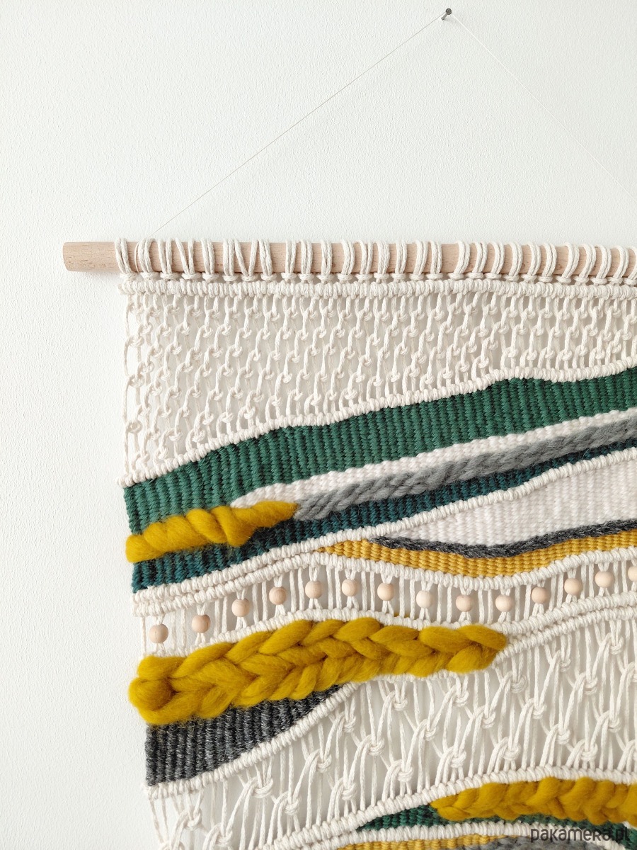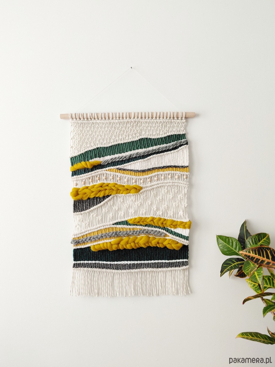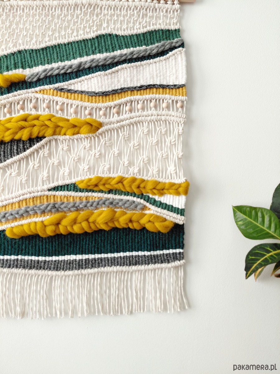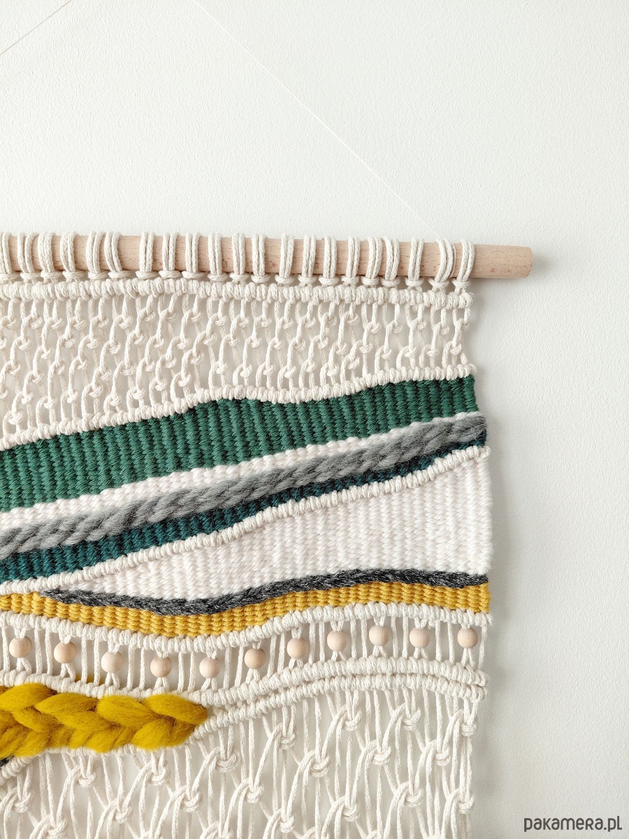 Dekoracja ścienna wykonana techniką macraweave, będącej połączniem makramy i gobelinu.