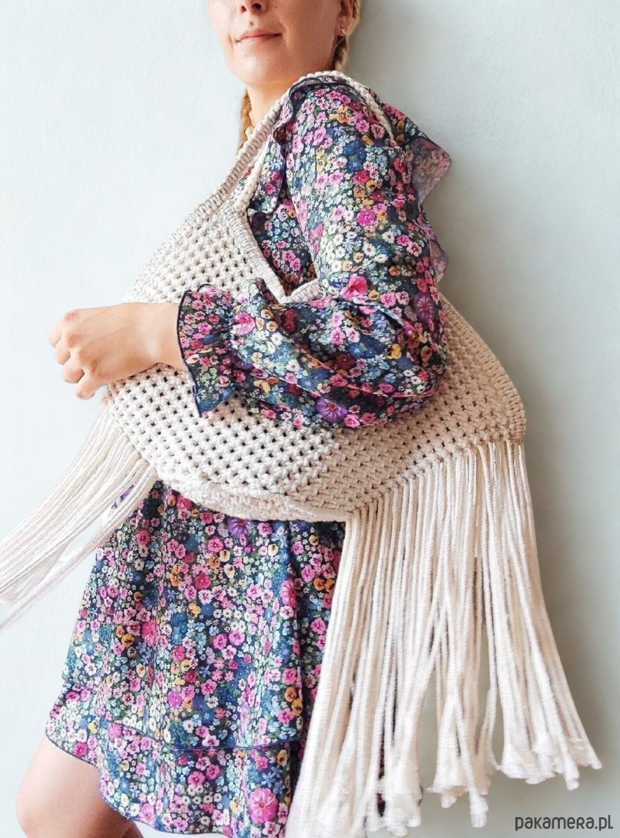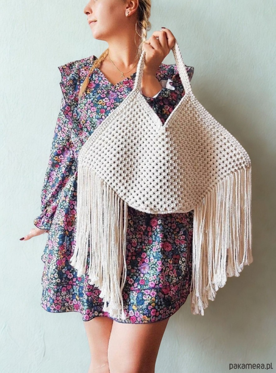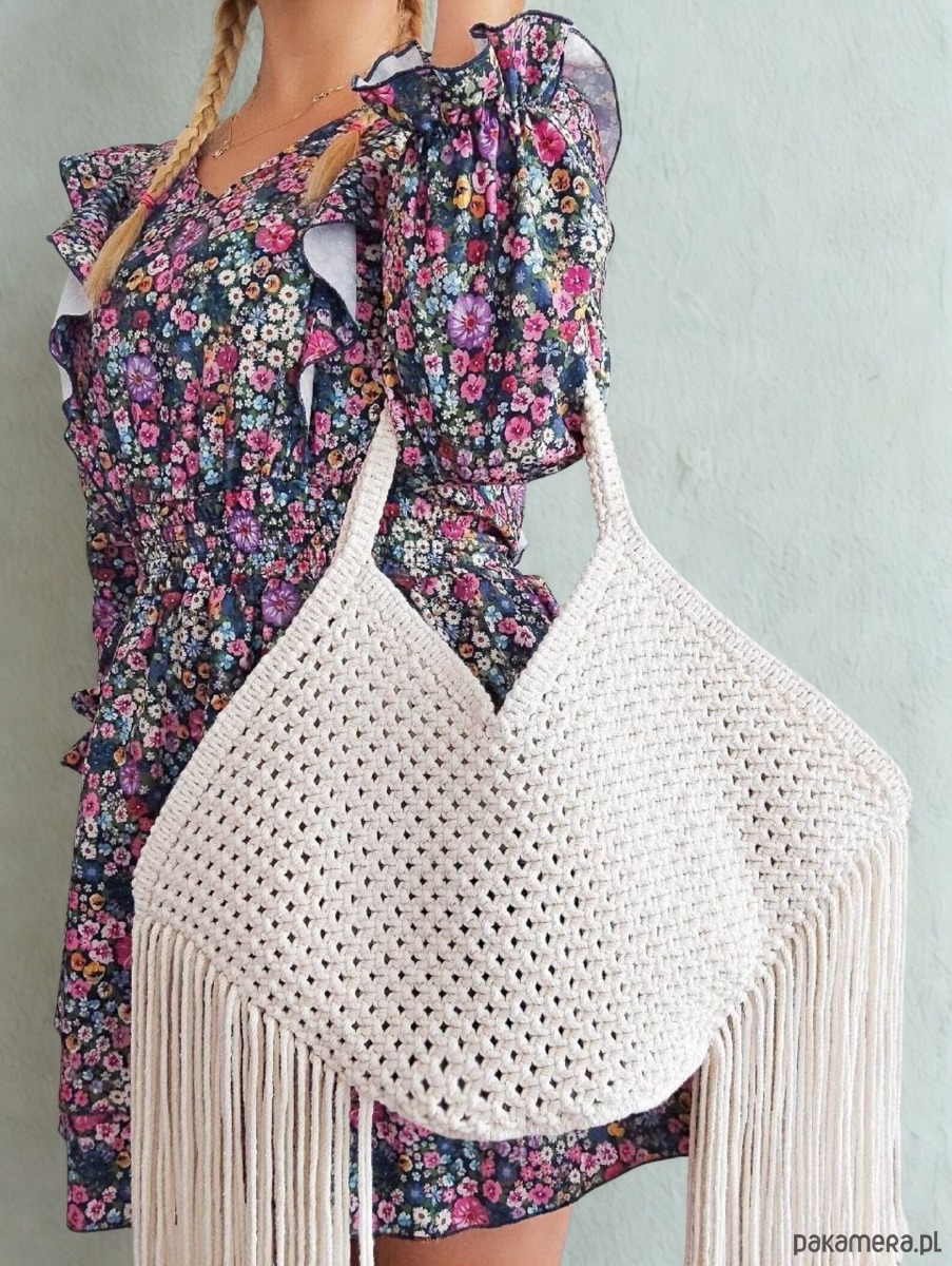 Naturalna i pełna charakteru – makramowa torba „Gaja” to połączenie klasycznego stylu boho z ręcznym kunsztem wykonania. Pleciona w całości z 100% bawełnianego sznurka, wyróżnia się pięknym, gęstym splotem i długimi frędzlami, które nadają jej lekkości i artystycznego wyrazu.