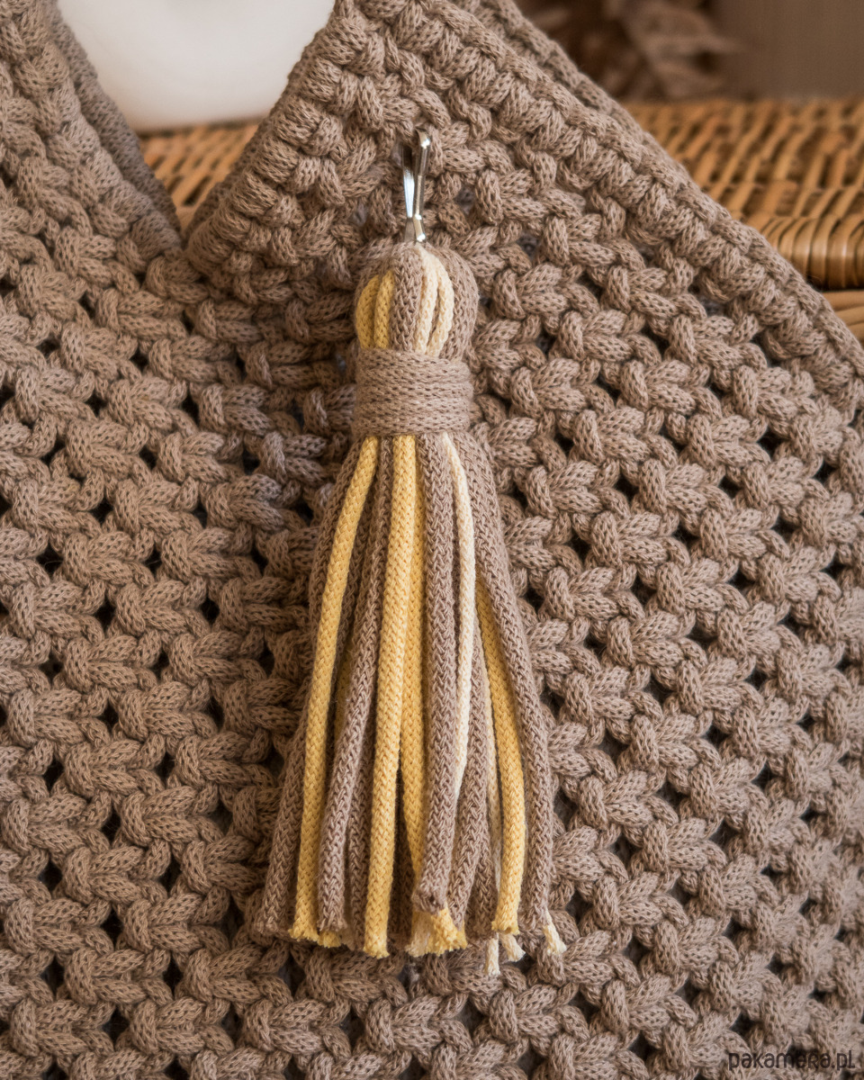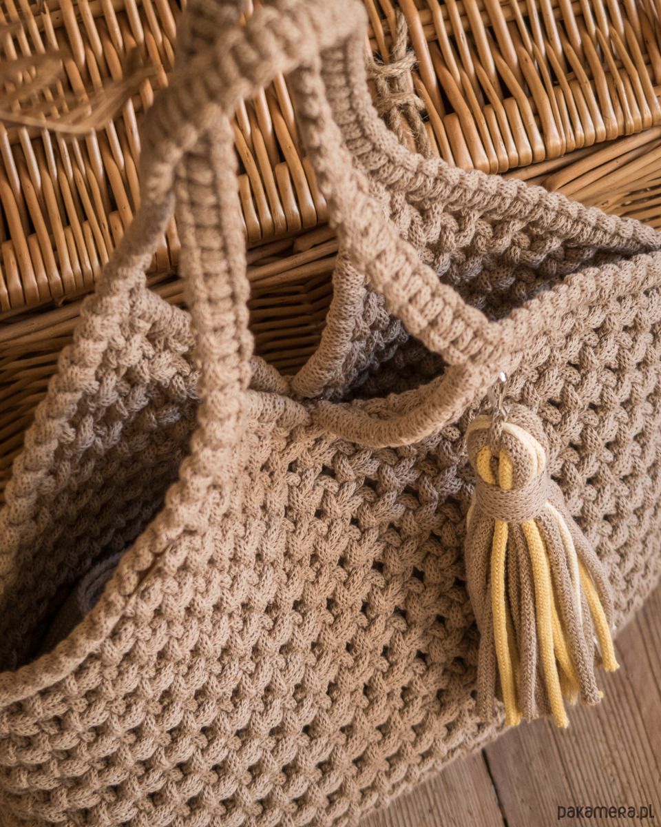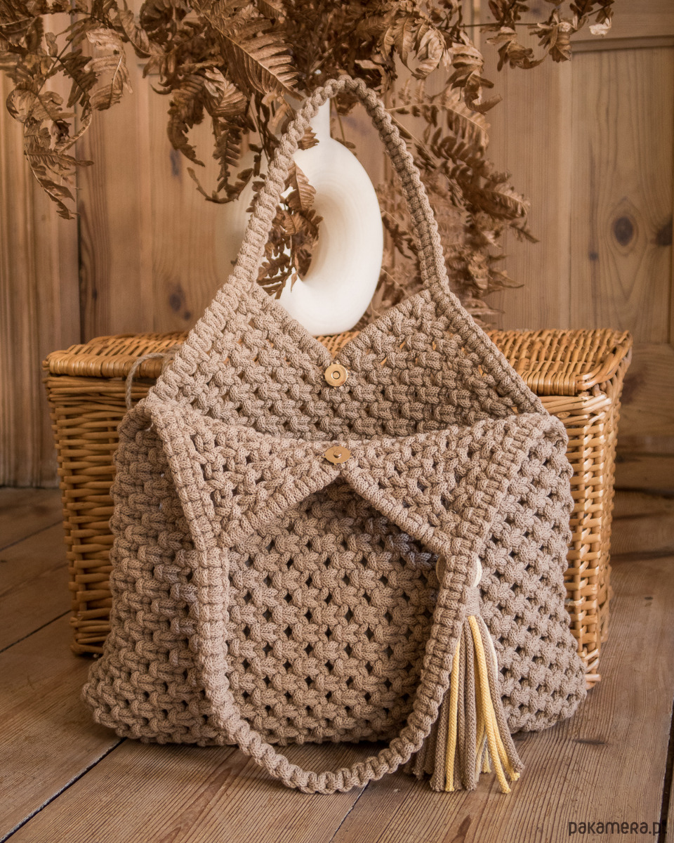 Dodaj wyjątkowego charakteru swoim stylizacjom z ręcznie wykonaną torbą w stylu boho. Ten unikalny model, został stworzony z miękkiego, bawełnianego sznurka w odcieniu wielbłądzim. Każdy egzemplarz jest wykonywany ręcznie techniką makramy, dzięki czemu masz pewność, że nikt nie będzie miał identycznej torby jak Ty.