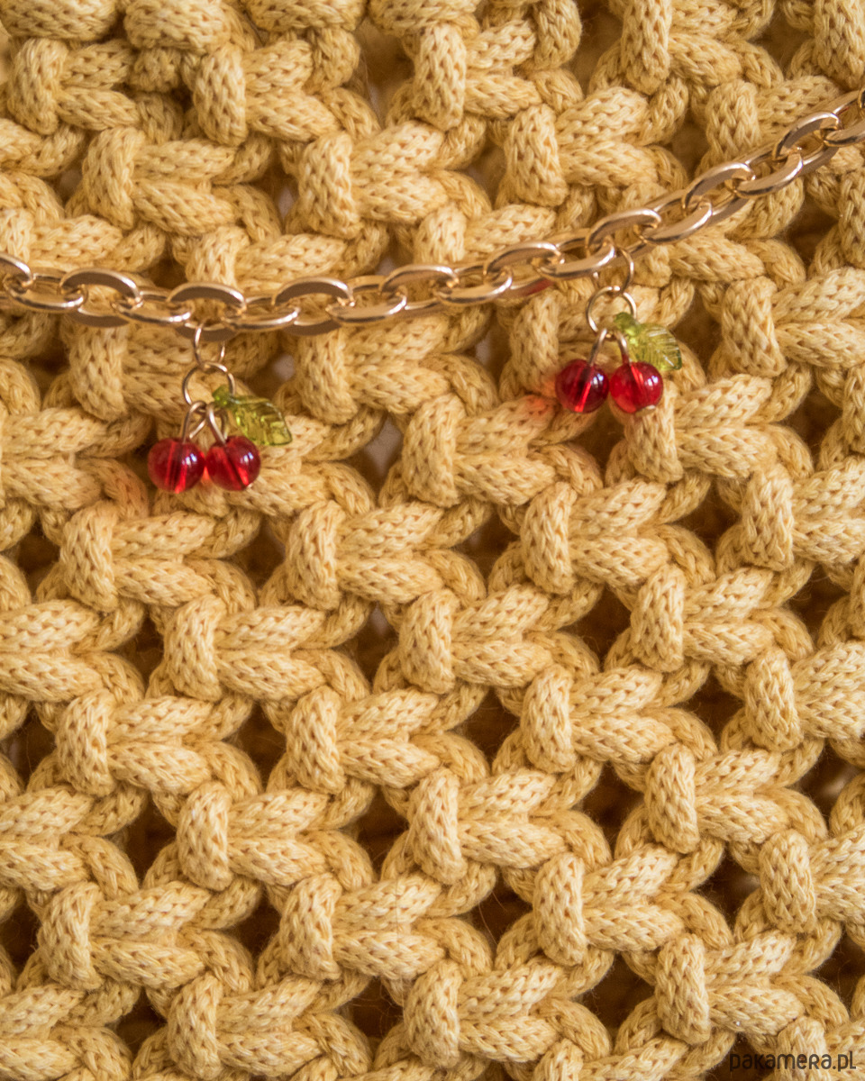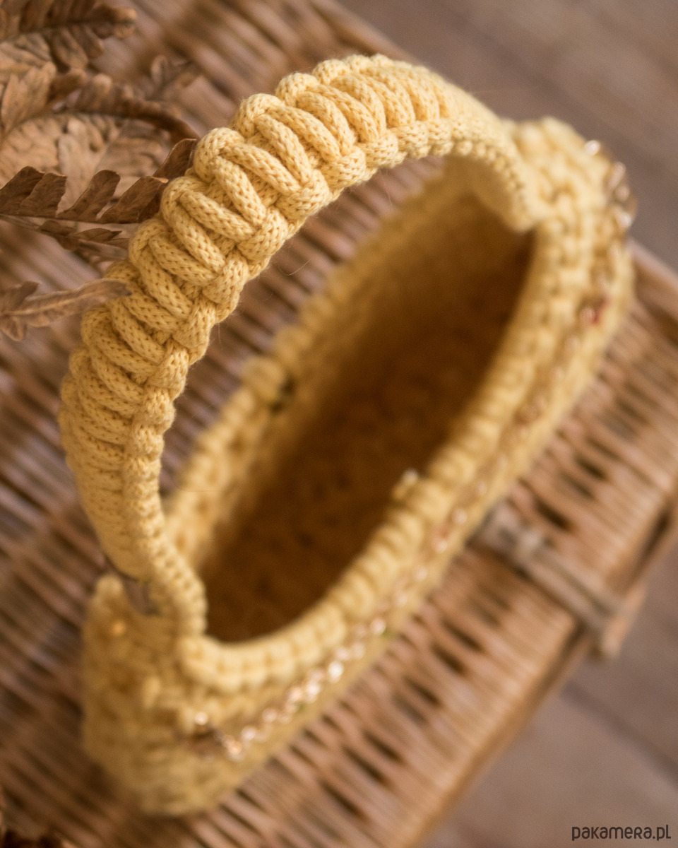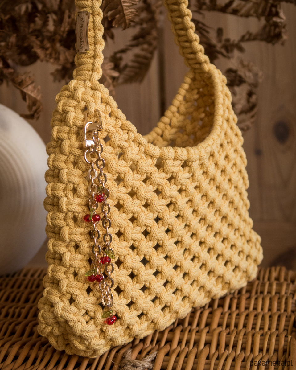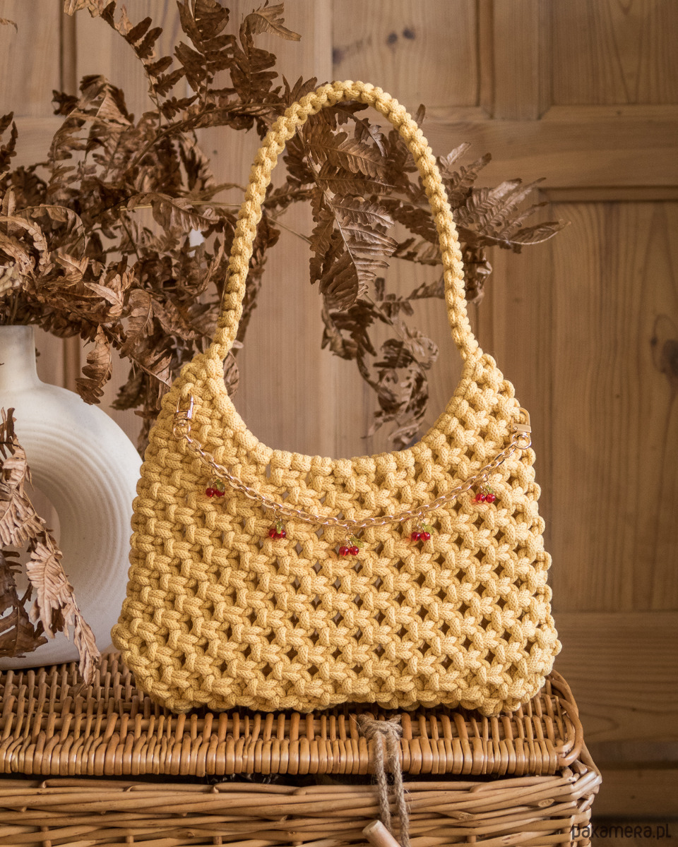 Ta torebka w stylu boho zachwyca grubym, dekoracyjnym makramowym splotem oraz dodatkiem dekoracyjnego łańcuszka, który dodaje jej charakteru.